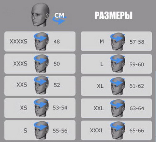 Если есть сомнения по поводу того, какой размер мотошлема вам подойдет, нужно измерять окружность головы в самой широкой части. Поможет определить размеры мотошлемов таблица, приведенная ниже.