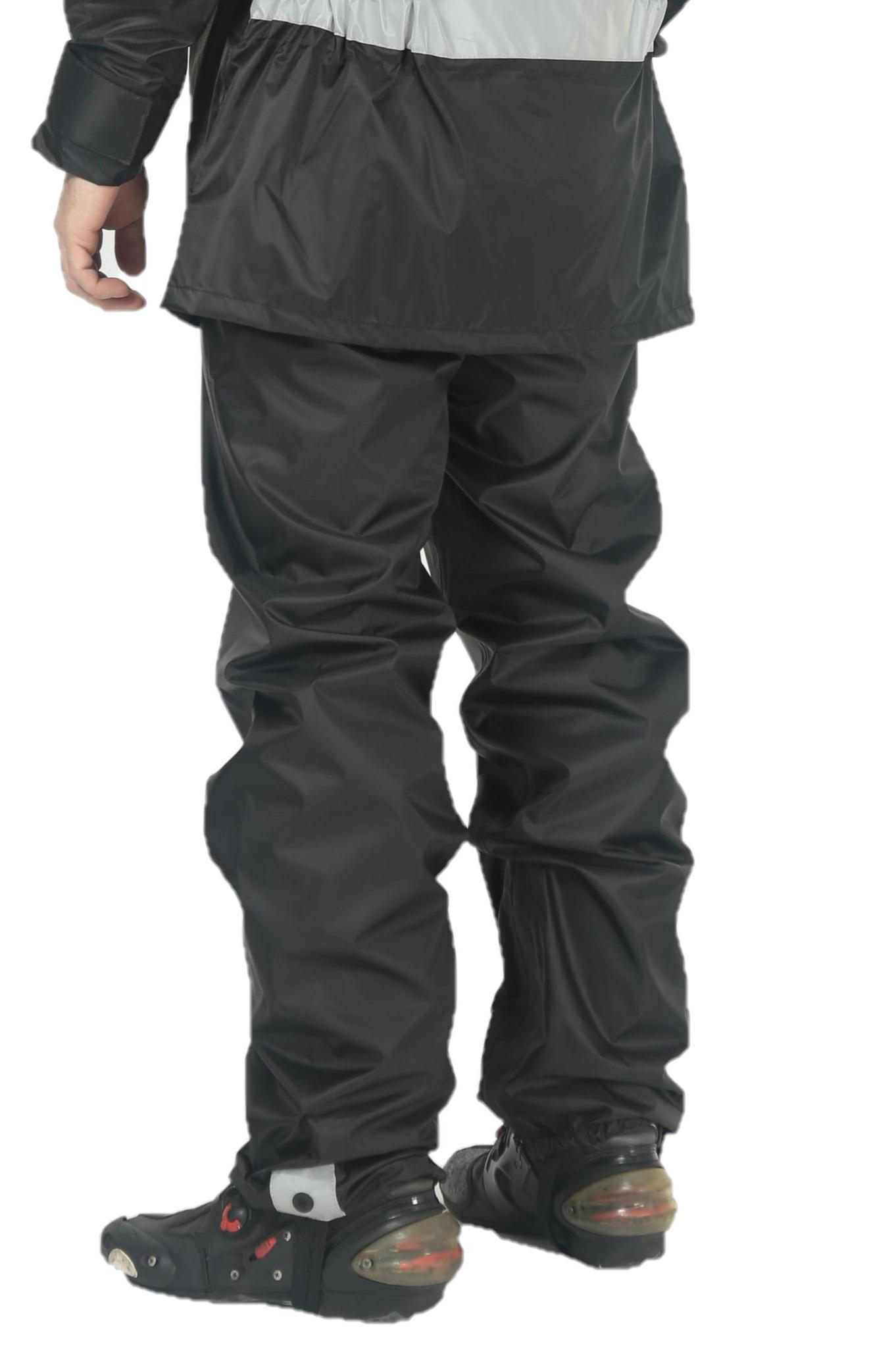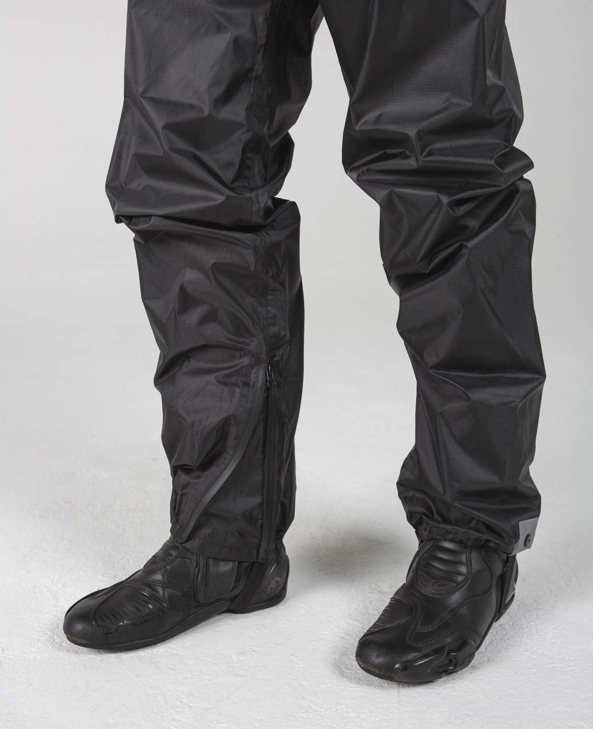 Черные дождевые штаны Hyperlook Adventure позволят сохранить мотобрюки в чистоте и сухости при поездках в дождливую погоду. Штаны выполнены из водонепроницаемой ПВХ-ткани, усиленной армированными нитями. Для абсолютной герметичности все швы проклеены специальной лентой. Молния в нижней части штанин помогает легко надевать и снимать изделие. Благодаря резинке в области щиколоток и эластичной тесьме для фиксации под каблук штаны плотно прилегают к ноге — даже при езде по бездорожью под них не попадет ни одной капли воды или грязи.