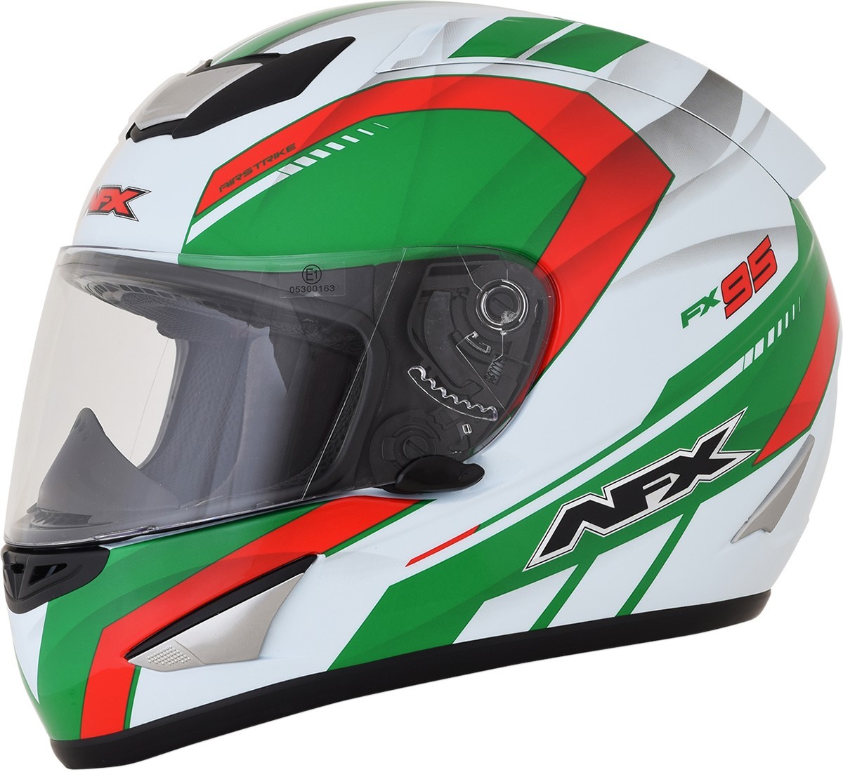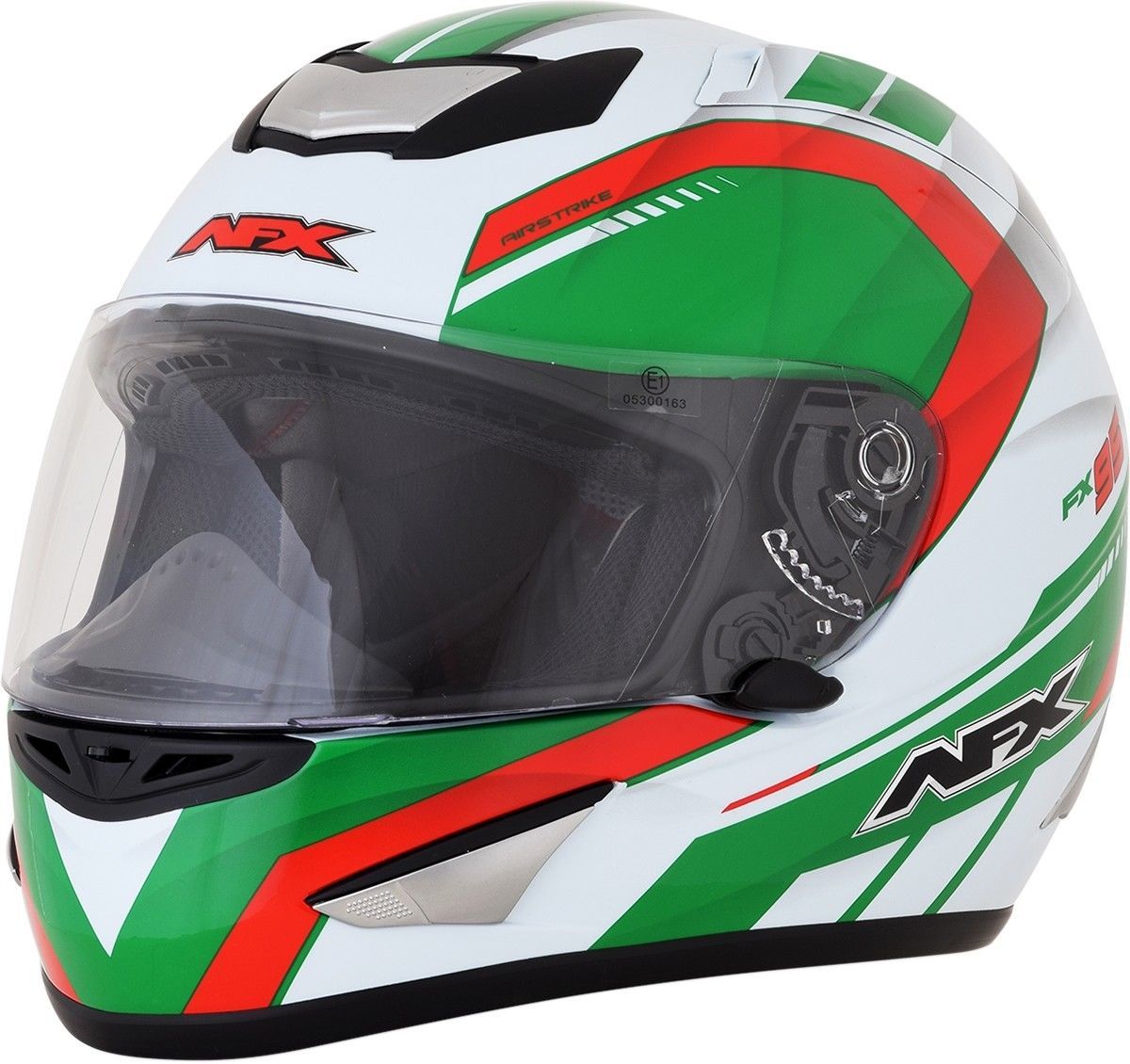 Мотошлем Afx FX-95 Airstrike Le Street в интегральном корпусе бело-красно-зеленого цвета станет ярким дополнением экипировки. Модель предназначена для комфортных поездок по городу и оснащена системой встроенной вентиляции, которая не влияет на аэродинамические свойства. Безопасность подтверждена по американскому стандарту DOT и европейскому ECE 2205.