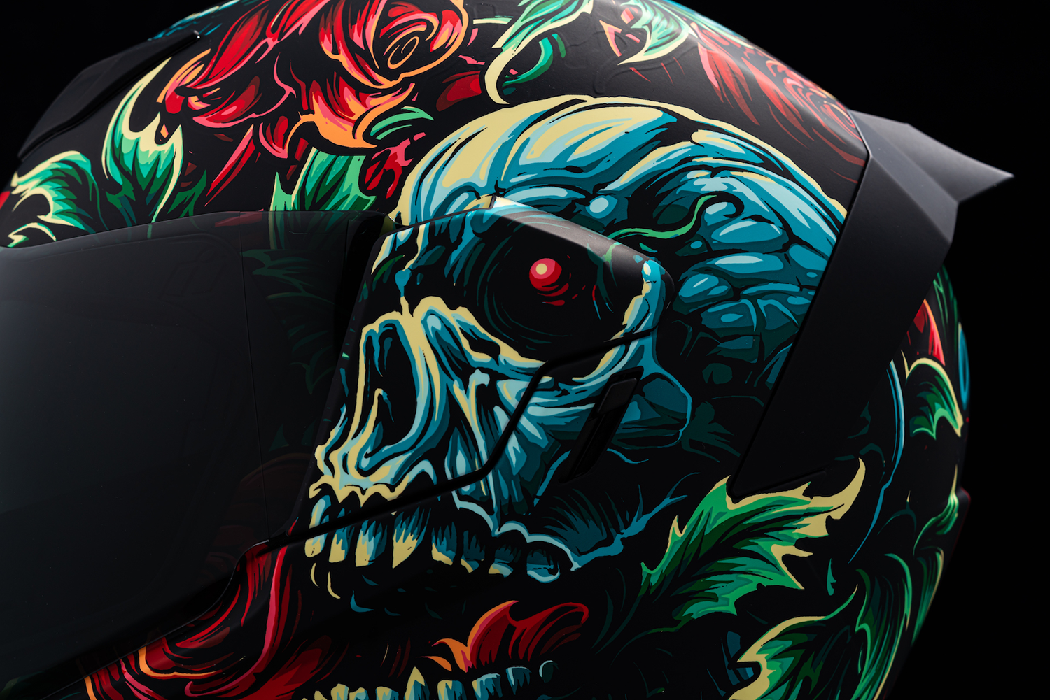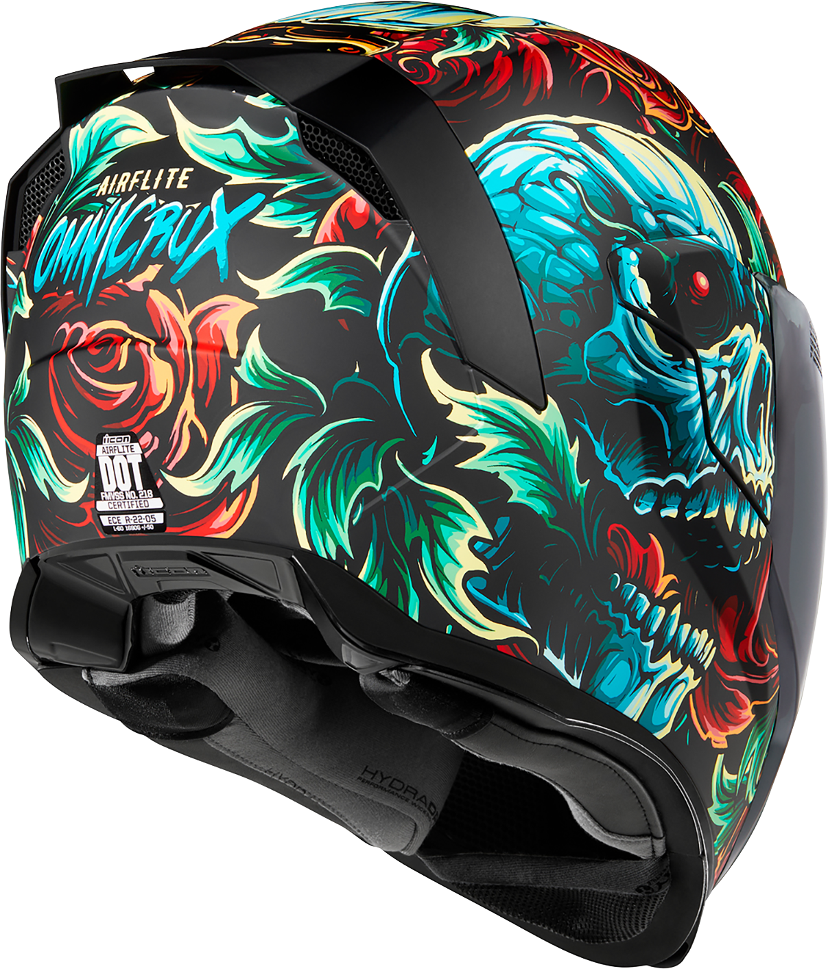 Мотошлем Интеграл Icon Airflite Omnicrux MIPS Helmet черный изготовлен из литого под давлением поликарбоната и соответствует директивам DOT и ECE 22-06 по безопасности. Стильная капсула шлема с уникальной матовой отделкой Rubatone выделяется аэродинамическим дизайном и яркой графикой поп-арт в готическом стиле с сочетанием красных роз и голубых «ледяных» черепов. Встроенный выпадающий солнцезащитный козырек опускается одним щелчком переключателя, а два комплектных сменных визора Forceshield в прозрачной и черной тонированной версии обеспечивают четкую видимость. Вентиляционная система модели включает воздухозаборники, внутренние воздуховоды и выпускные отверстия. Большой формованный дефлектор в подбородочной части впускает и направляет воздушный поток для эффективного охлаждения.