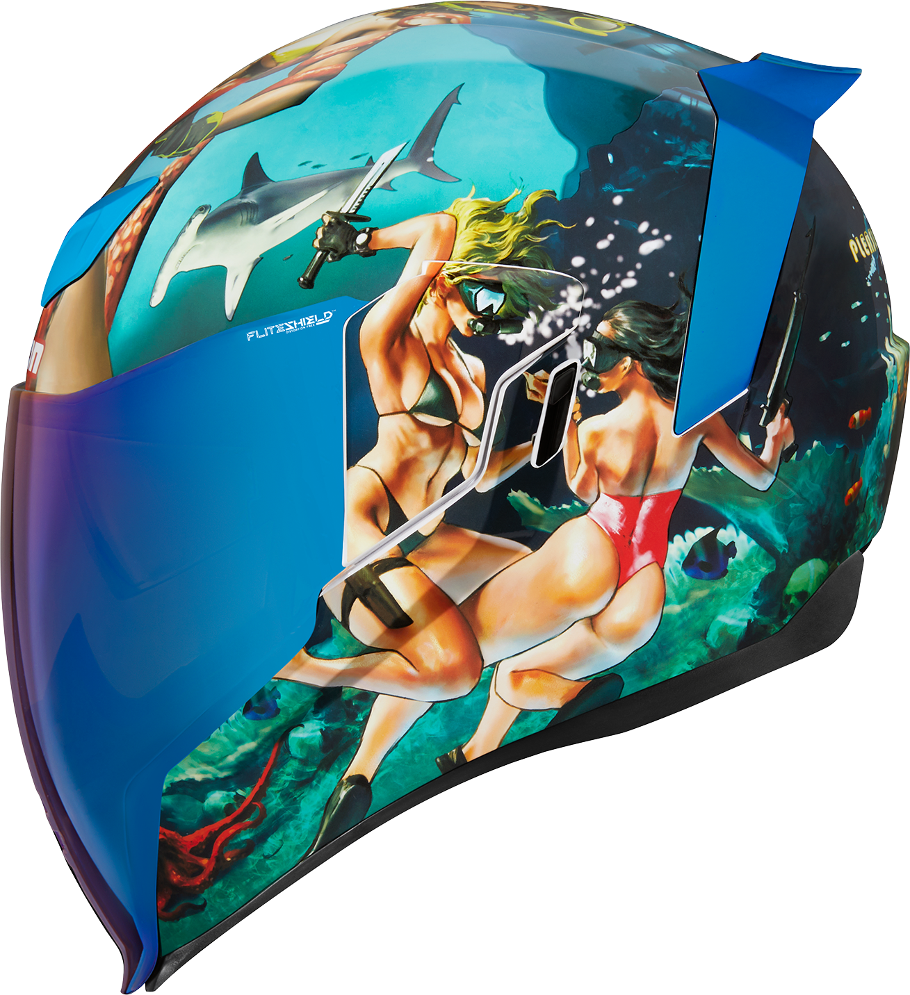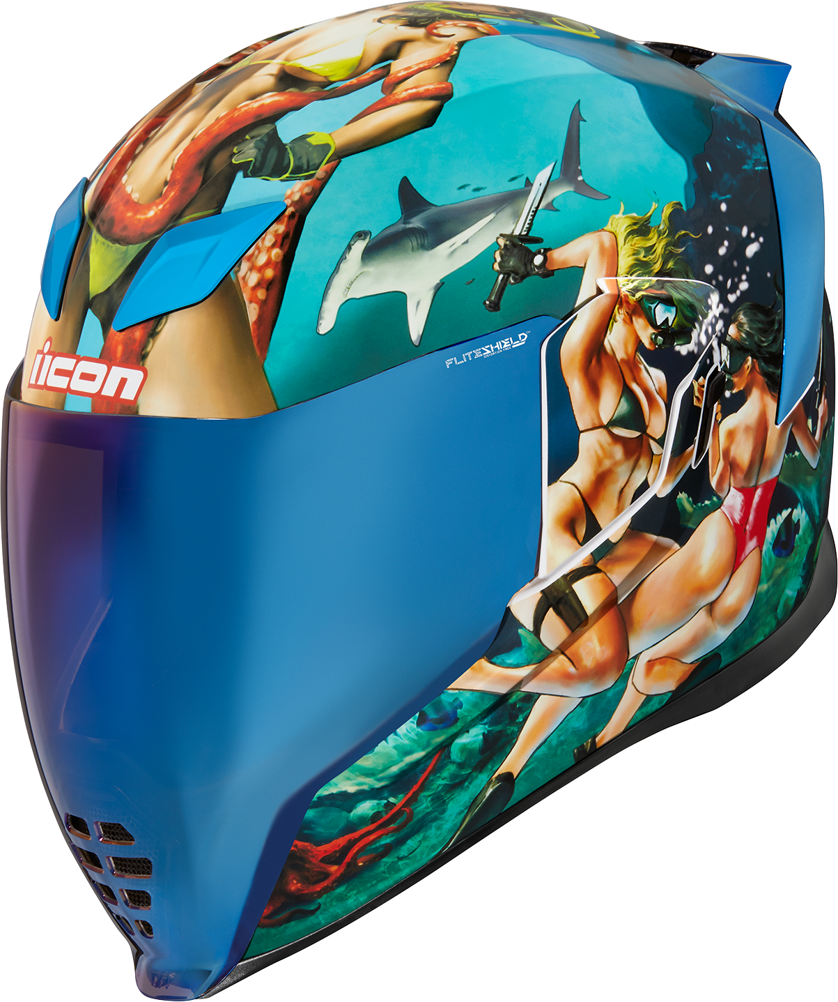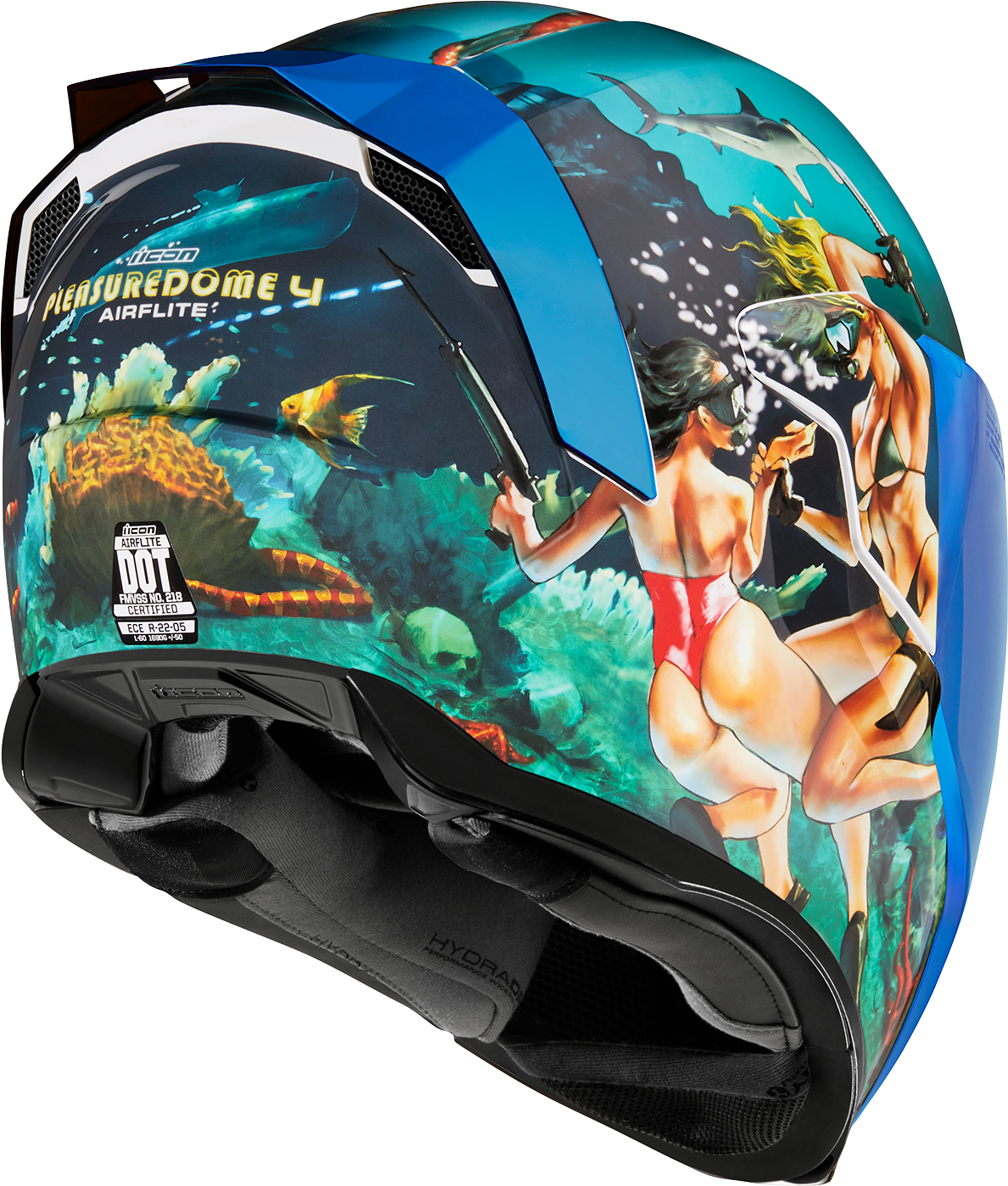 Мотошлем Интеграл Icon Airflite Pleasuredome4 Helmet синий с прочной поликарбонатной капсулой агрессивного аэродинамического дизайна своей графической тематикой продолжает фэнтезийную шпионскую сагу ICON, на этот раз в морских глубинах. Внутри шлем имеет комфортную съемную влагоотводящую подкладку Hydradry, приятную для головы, вырезы в пенополистироле для устройств связи, защиту от запотевания и выпадающий с помощью внешнего переключателя солнцезащитный козырек Dark Smoke Fog-Free DropShield. Дополнительно к прозрачному основному щитку в комплект включен запасной синий тонированный визор RST Blue Fliteshield с боковыми пластинами.