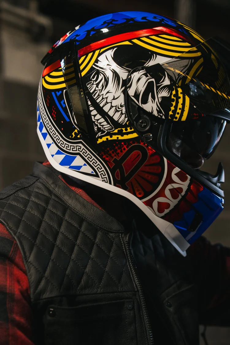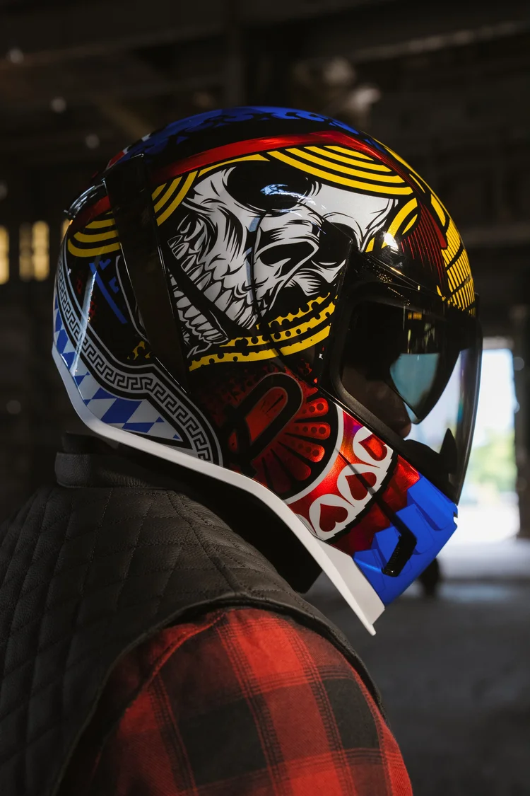 Мотошлем Icon Airform Lucky Lid 5 Mips — это не просто мотошлем интеграл, это настоящая колода, созданная для тех, кто играет громко и удваивает ставку на стиль! С изображением Джека с безумным взглядом, который смотрит в лицо судьбе, и яркой графикой карт, этот шлем в миксовом цвете мгновенно привлекает внимание, подчеркивая вашу индивидуальность и смелость на дороге.