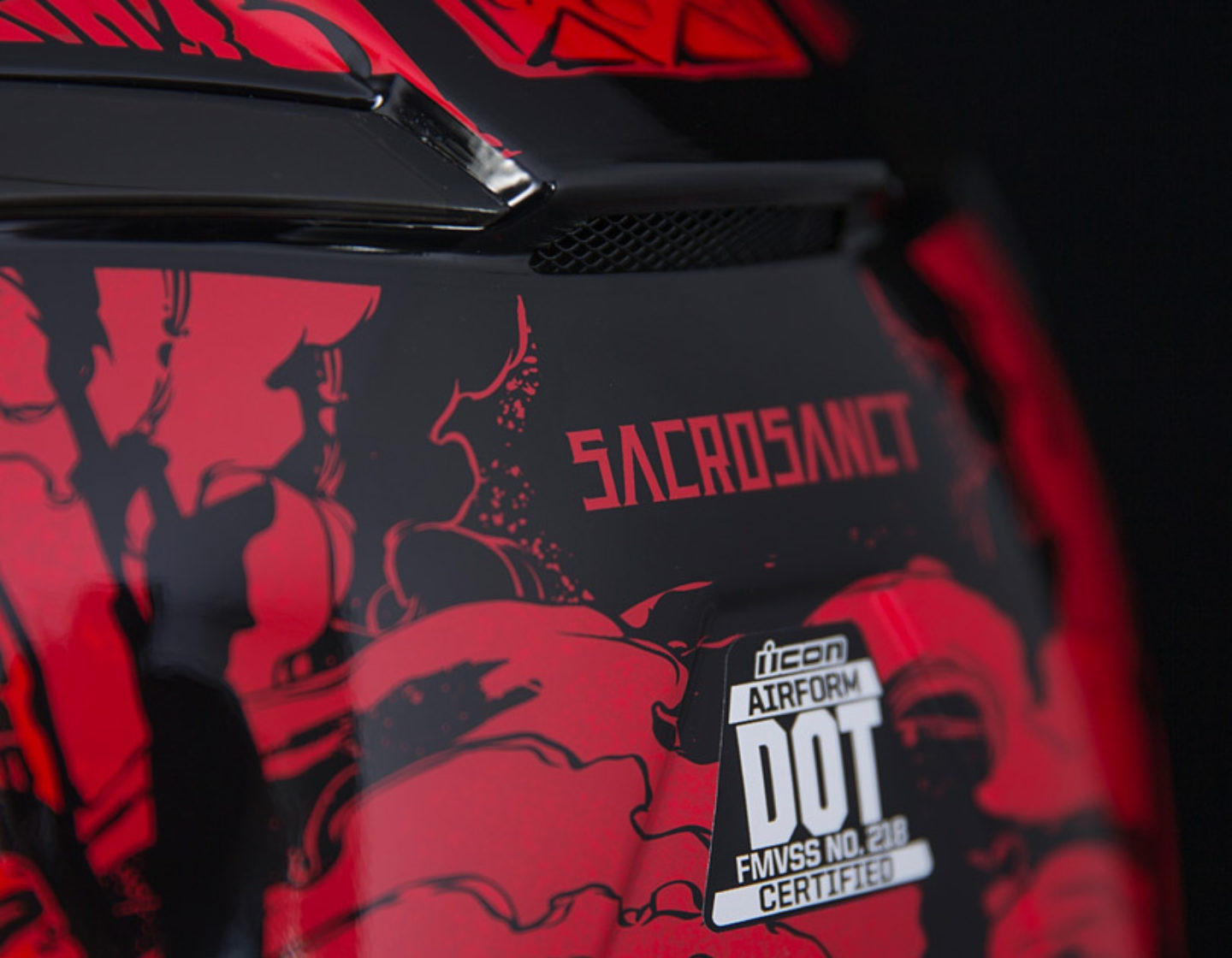 Высокотехнологичный мотошлем Icon Airform Sacrosanct относится к закрытому типу и отличается стильным агрессивным дизайном. Прочная оболочка из поликарбоната получена в результате литьевого формования и снабжена отверстиями, которые сделаны при помощи сверхточной лазерной обработки. Благодаря гигроскопичной обивке HydraDry не нарушается нормальная терморегуляция внутри шлема.