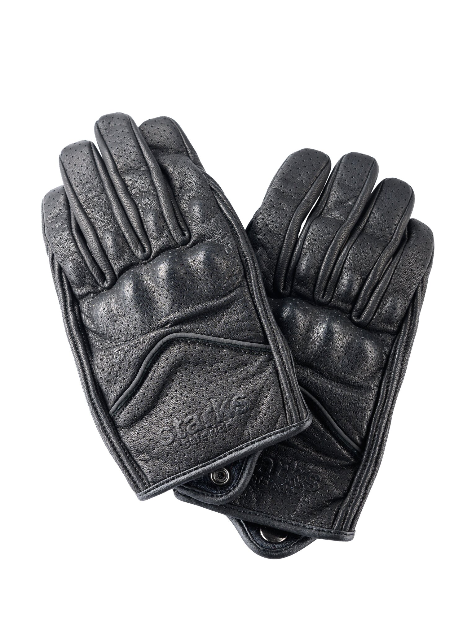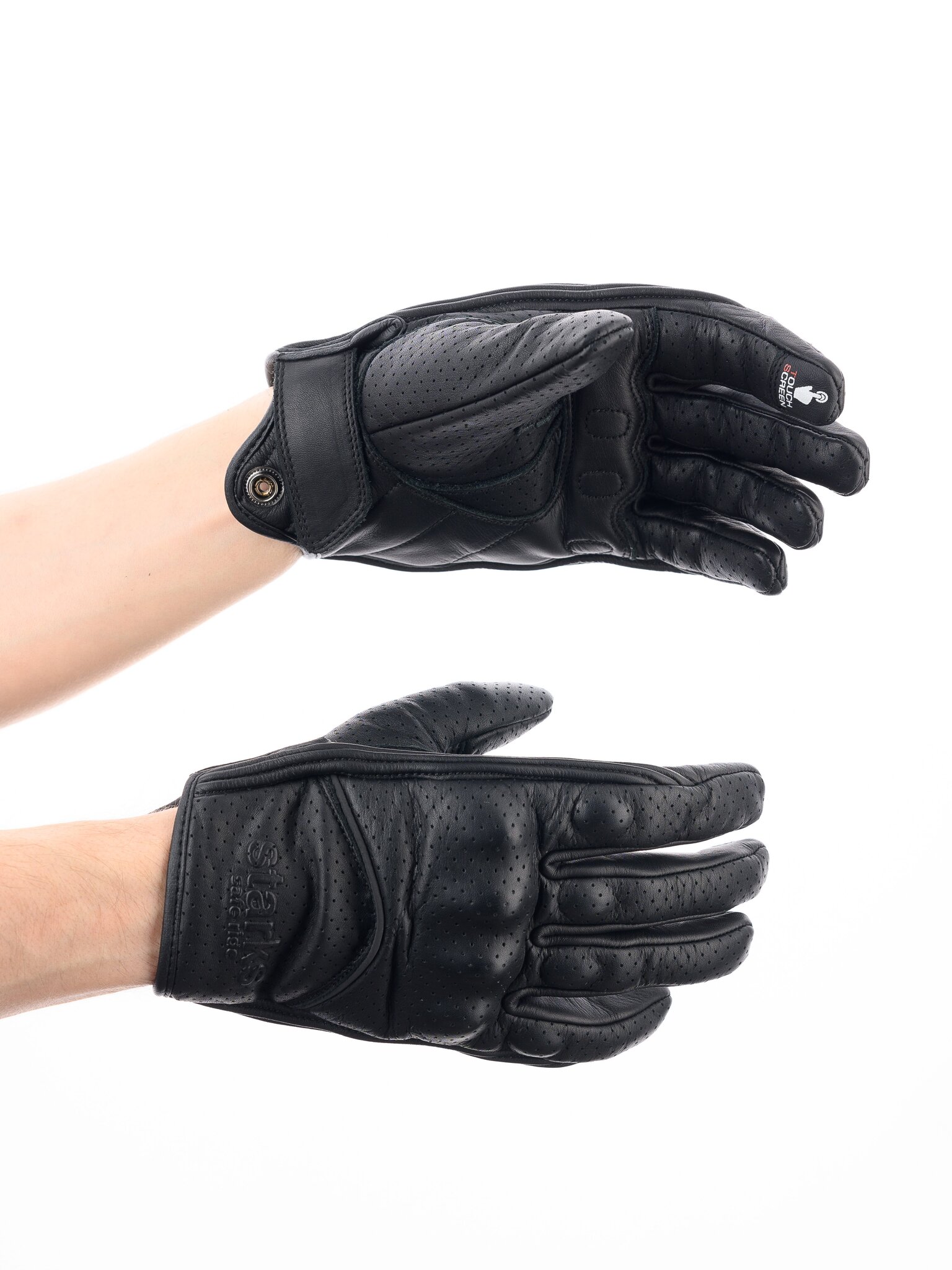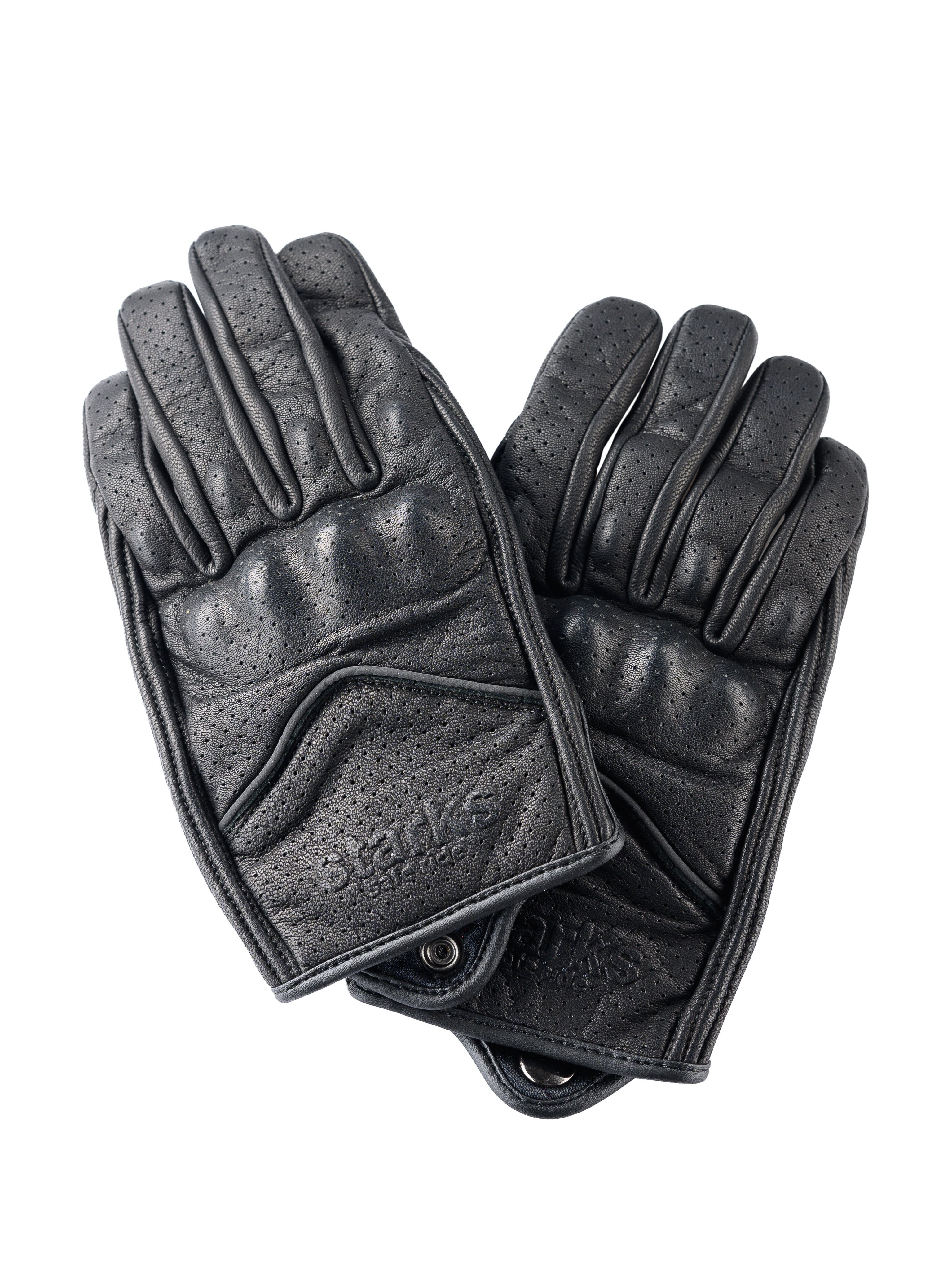 Короткие мужские мотоперчатки STARKS ALFA из черной перфорированной воловьей кожи. Защита кулака - жесткий термоформованный пластик, закрытый кожаной накладкой и дополненный эластичной прокладкой для гашения энергии удара. Защита ладони - дополнительной слой гладкой кожи. Пальцевая зона также защищена эластичными прокладками. На указательных пальцах - токопроводящие накладки для управления гаджетами.