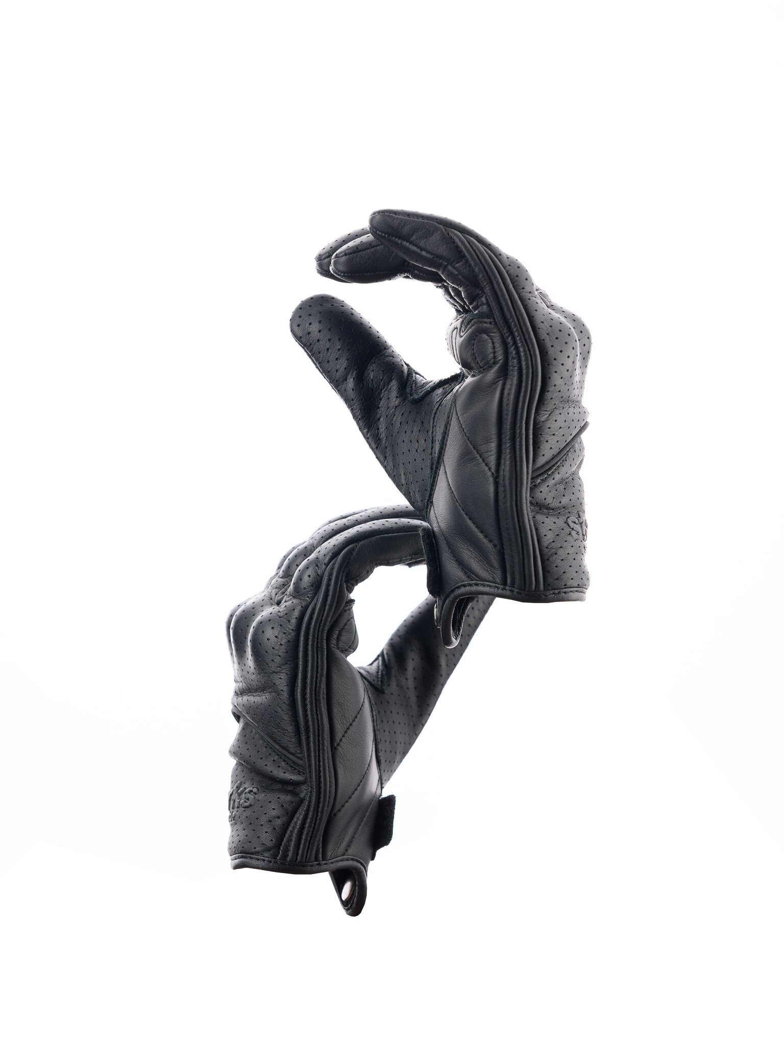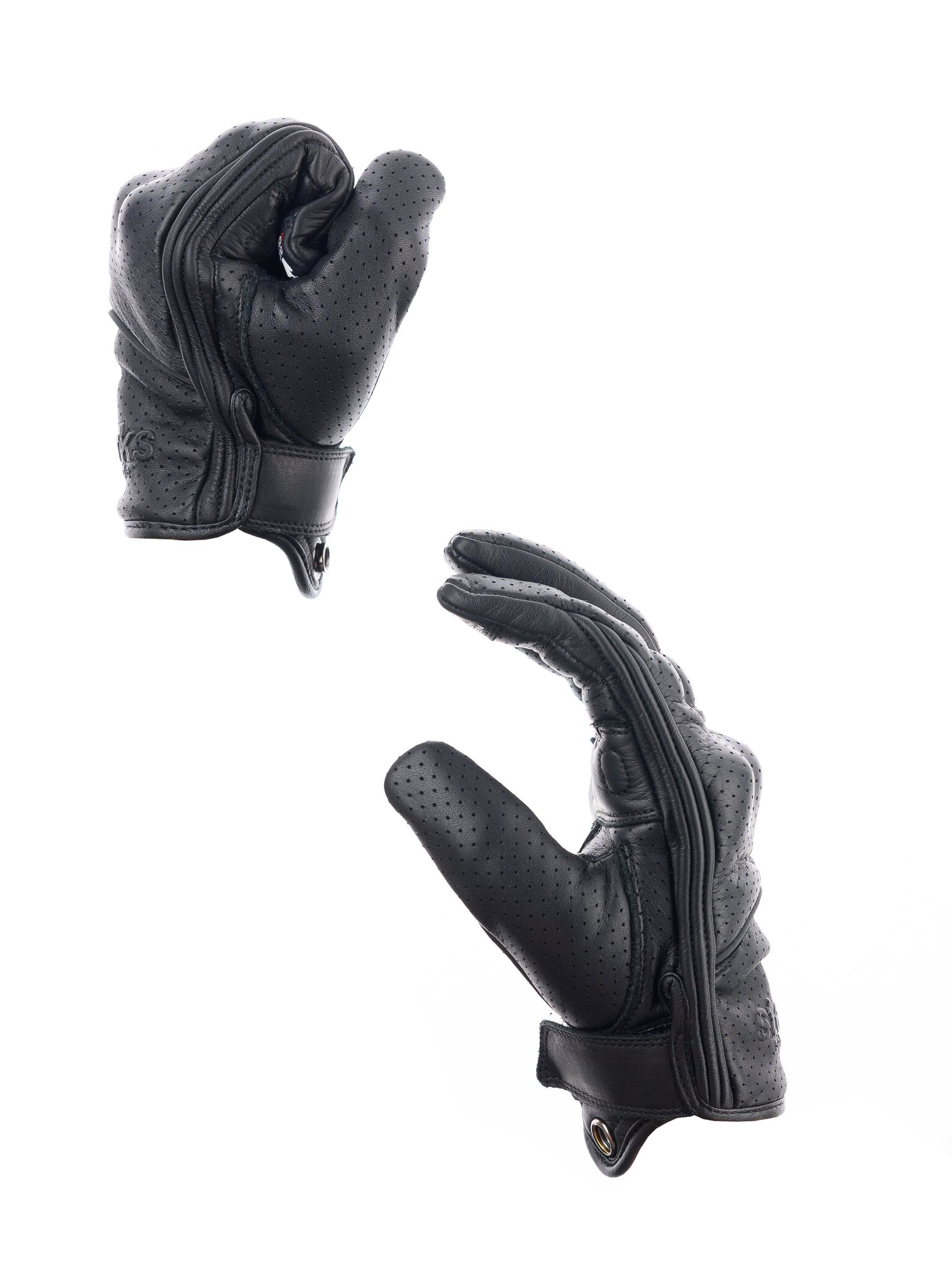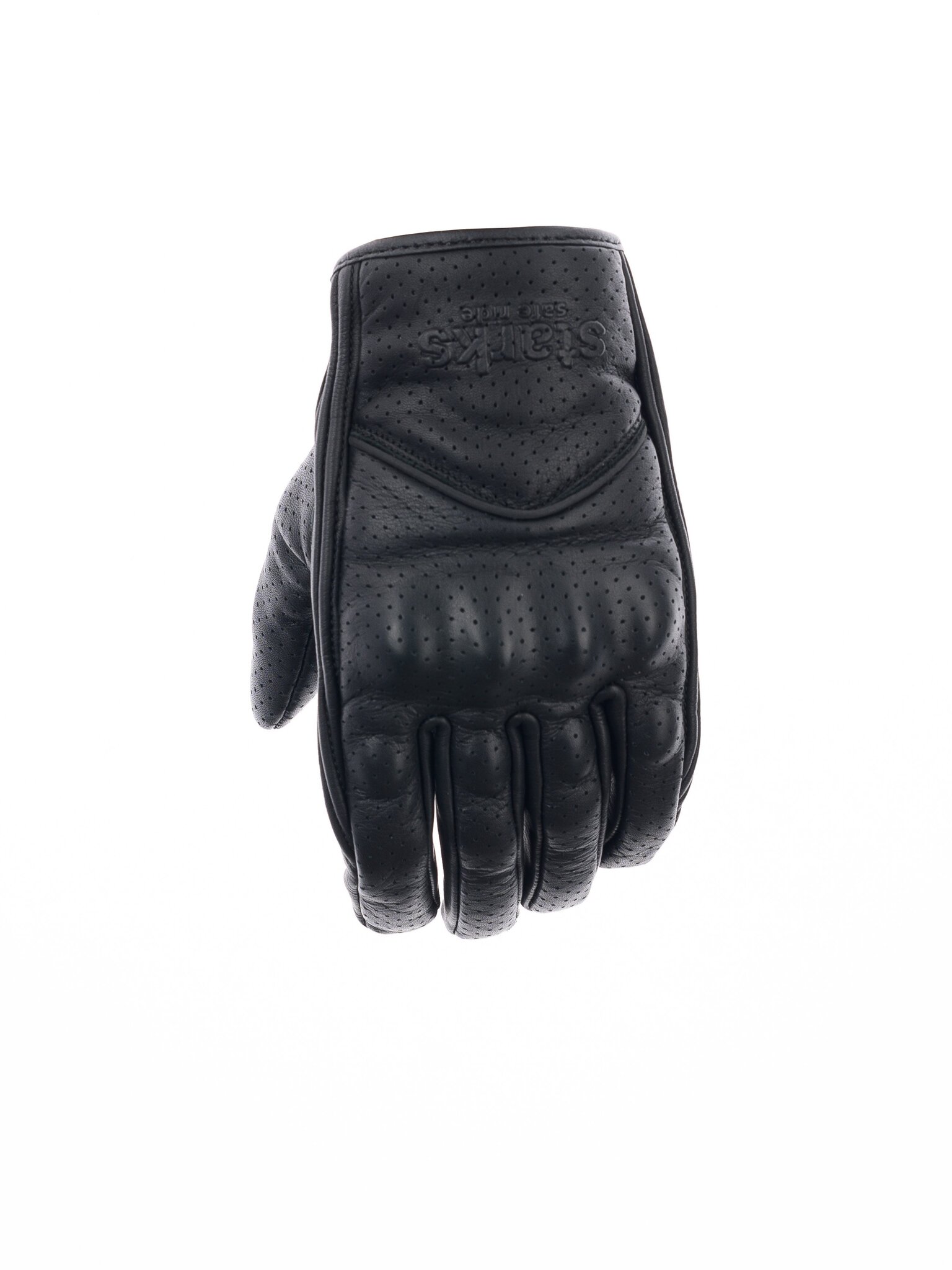 Короткие мужские мотоперчатки STARKS ALFA из черной перфорированной воловьей кожи. Защита кулака - жесткий термоформованный пластик, закрытый кожаной накладкой и дополненный эластичной прокладкой для гашения энергии удара. Защита ладони - дополнительной слой гладкой кожи. Пальцевая зона также защищена эластичными прокладками. На указательных пальцах - токопроводящие накладки для управления гаджетами.