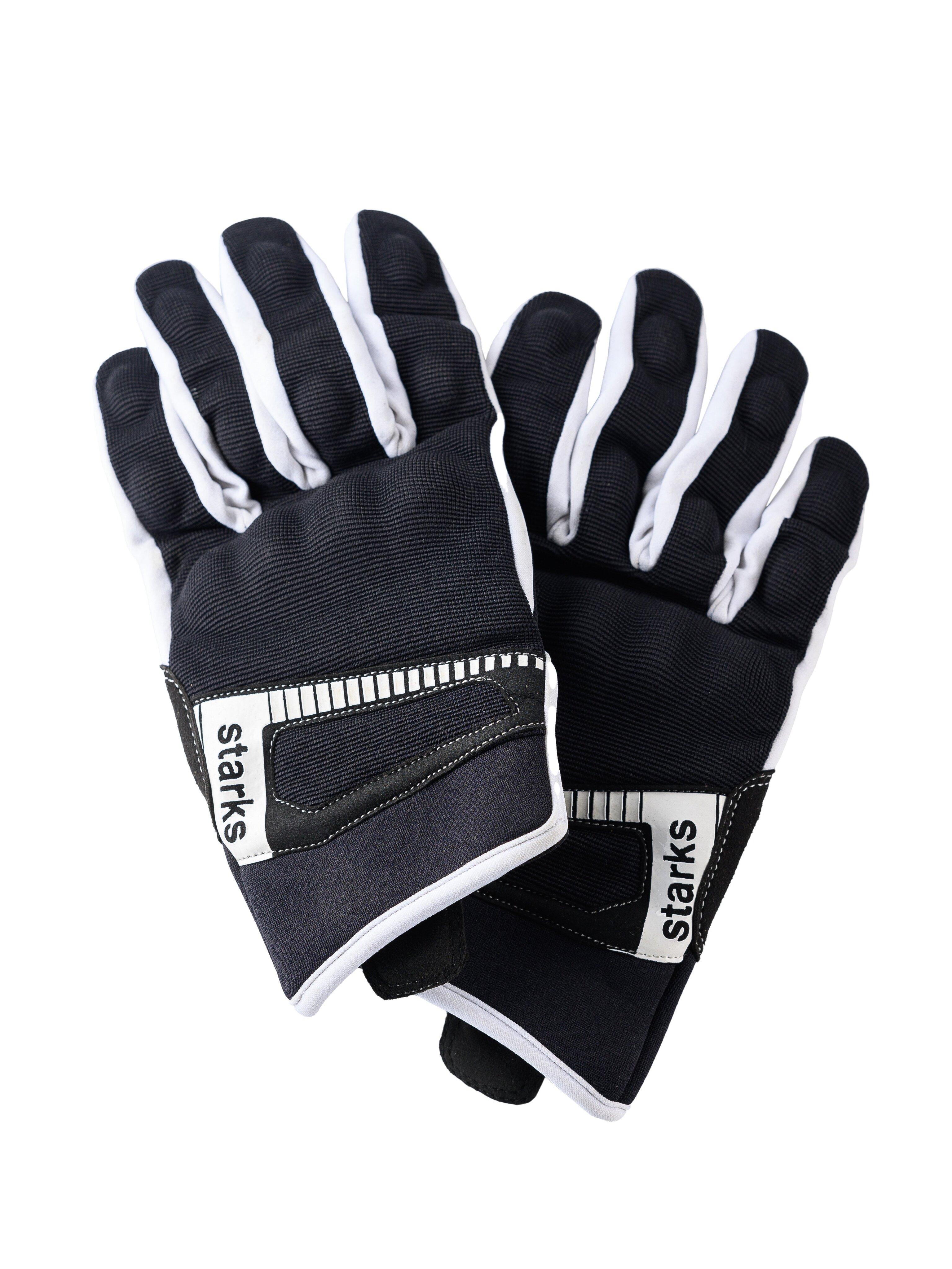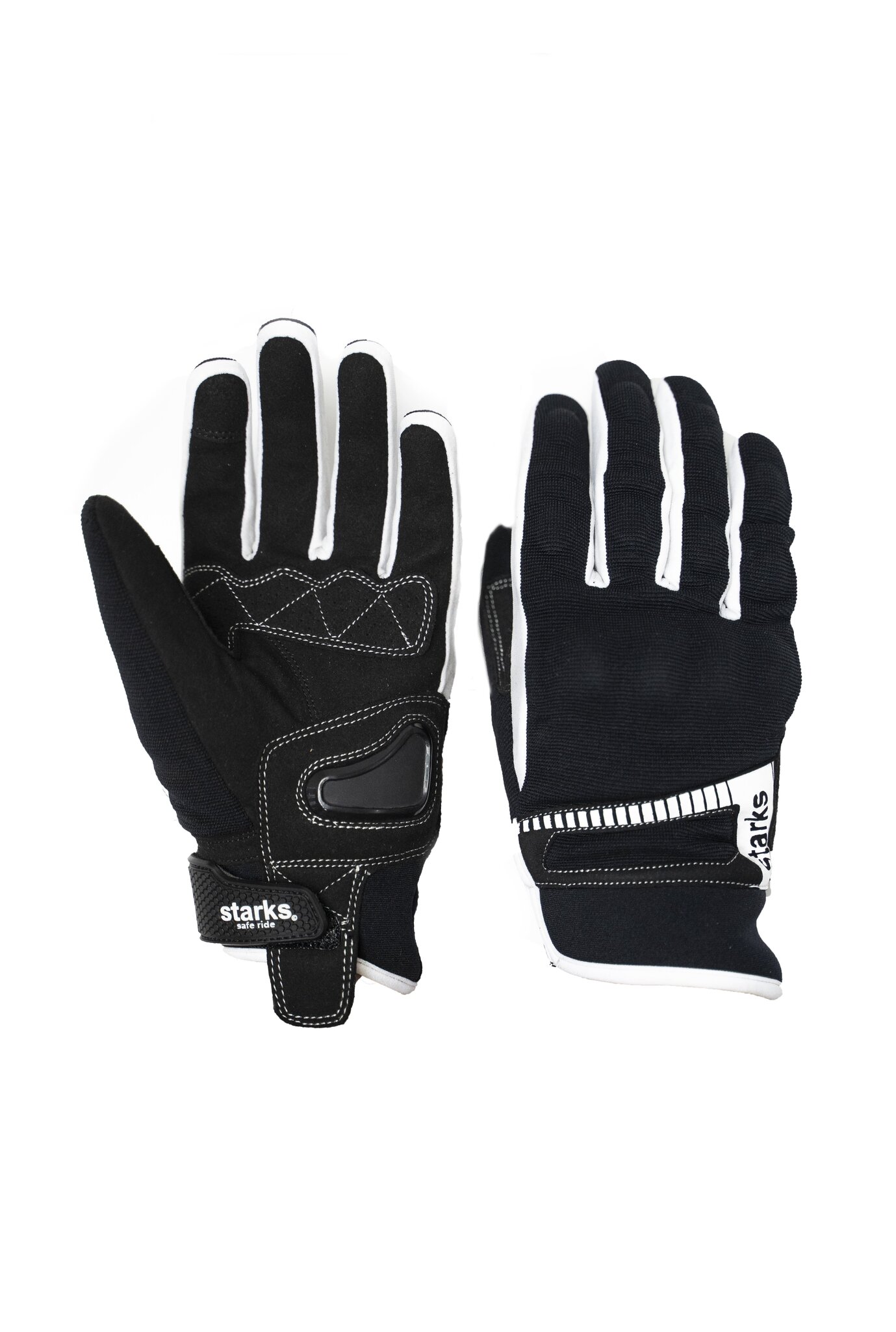 Черные короткие мужские текстильные мотоперчатки STARKS ALTAIR с жесткой защитой кулака и контрастными вставками из прочного белого полиэстера. Наладонная и пальцевая зона продублированы синтетической замшей, в зоне контактов с грипсами - дважды. В основании ладони укреплен жесткий защитный протектор.