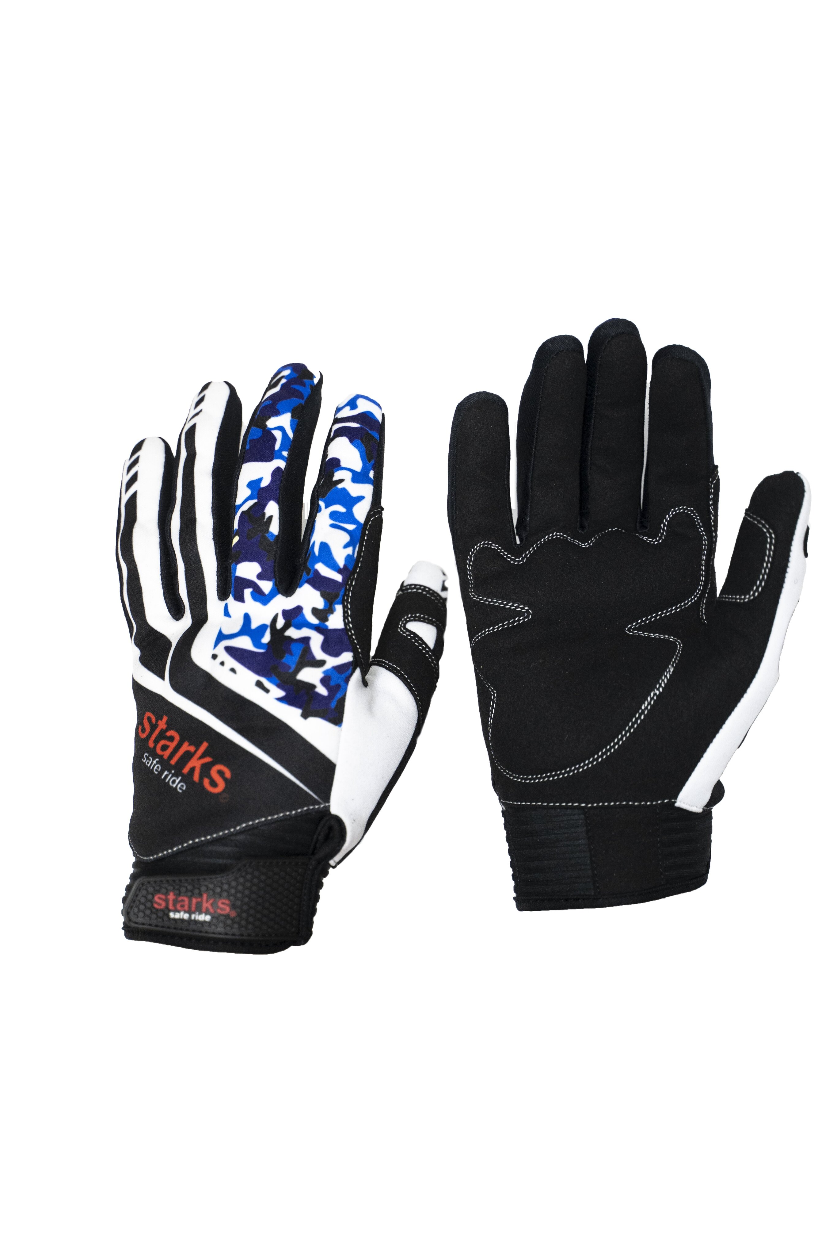 Черные текстильные мужские мотоперчатки STARKS ANTARES с бело-синими вставками из прочного полиэстера. Пальцевая и наладонная зоны укреплены одинарным и двойным слоем синтетической замши. Для защиты от удара установлены эластичные неопреновые вставки. Зона контакта с грипсами максимально защищена от истирания.
