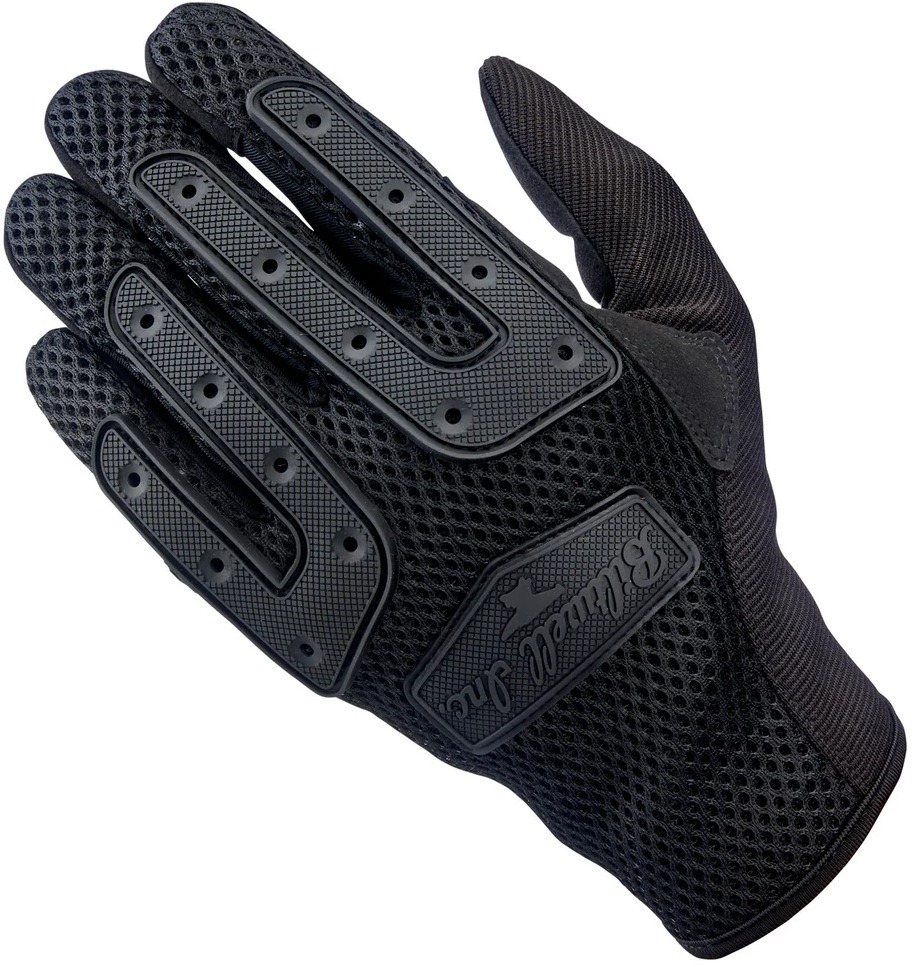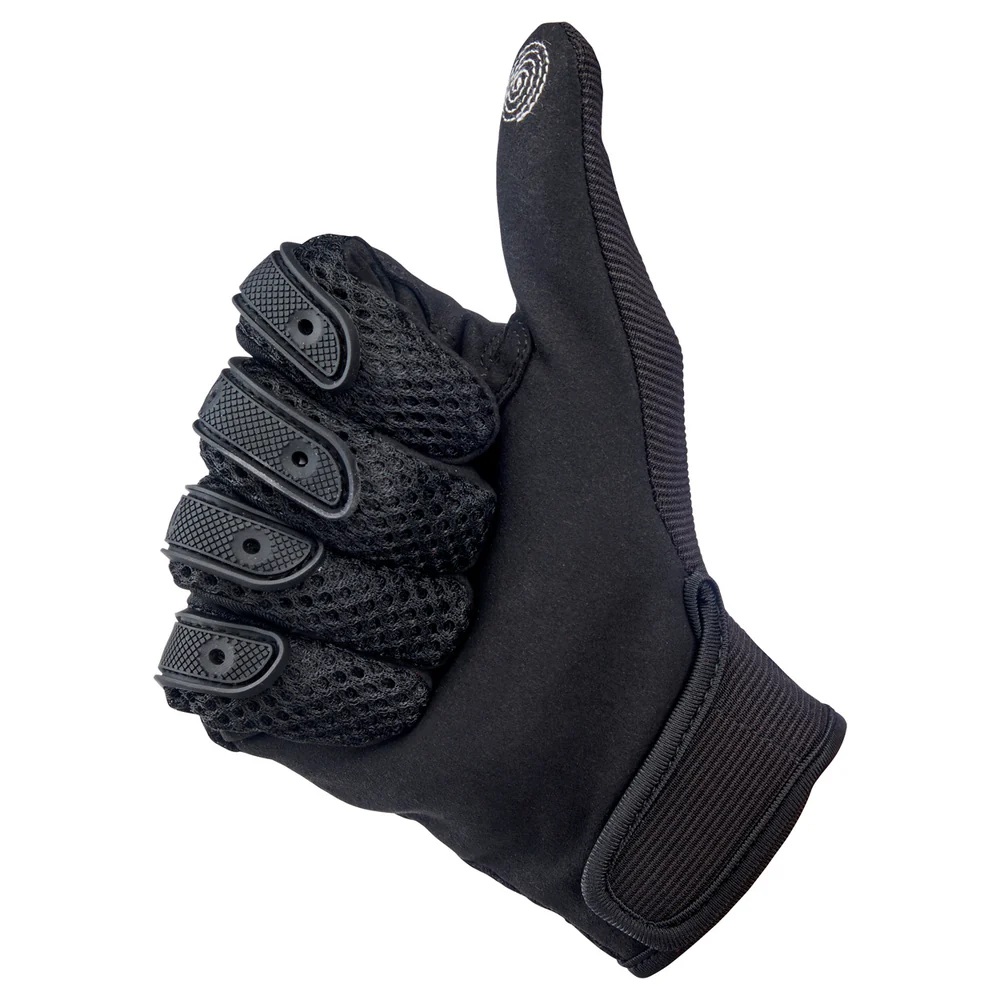 Отдельные участки, включая безымянный палец и мизинец, выполнены из эластичного полиэстера, что добавляет гибкости при управлении мотоциклом. Тыльная сторона оборудована трехслойной сетчатой вставкой, обеспечивающей циркуляцию воздуха и комфорт в жаркую погоду. Для удобства взаимодействия с электронными устройствами на кончиках пальцев использованы проводящие нити.