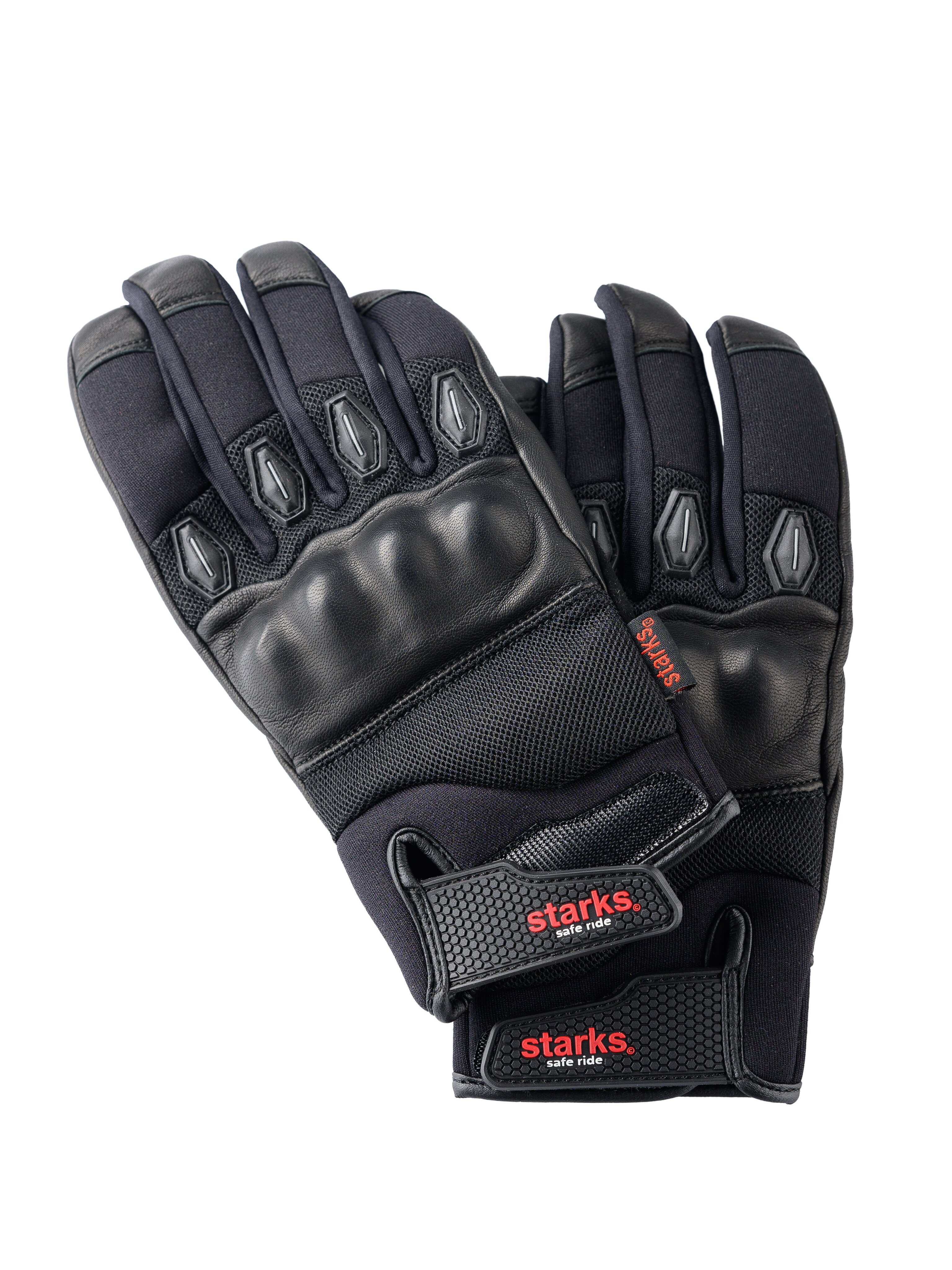 Кожаные мотоперчатки STARKS ATLAS имеют жесткую защиту кулака из термоформованного пластика и резиновые накладки на фалангах пальцев. В зоне контакта с сенсорным экраном нанесен токопроводящий принт. Клапан застежки и шильд в боковом шве брендированы красным логотипом производителя.