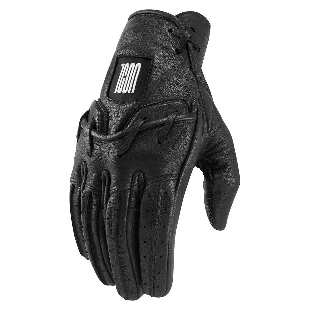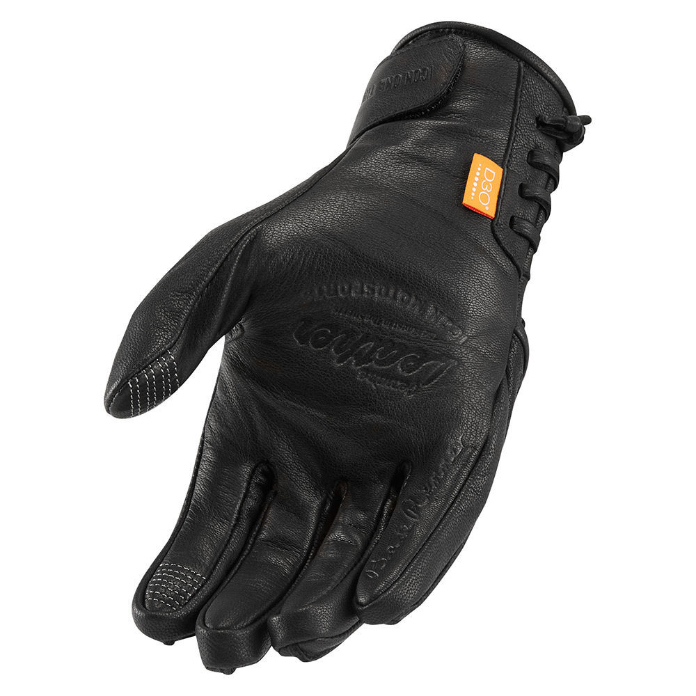 Черные кожаные мотоперчатки Icon Baserunner во время вождения защищают руки байкера от обветривания, а в случае аварии позволяют избежать серьезных травм верхних конечностей. Изделие из цельного куска натуральной козьей кожи плотно облегает ладонь и обеспечивает комфорт при управлении мотоциклом.