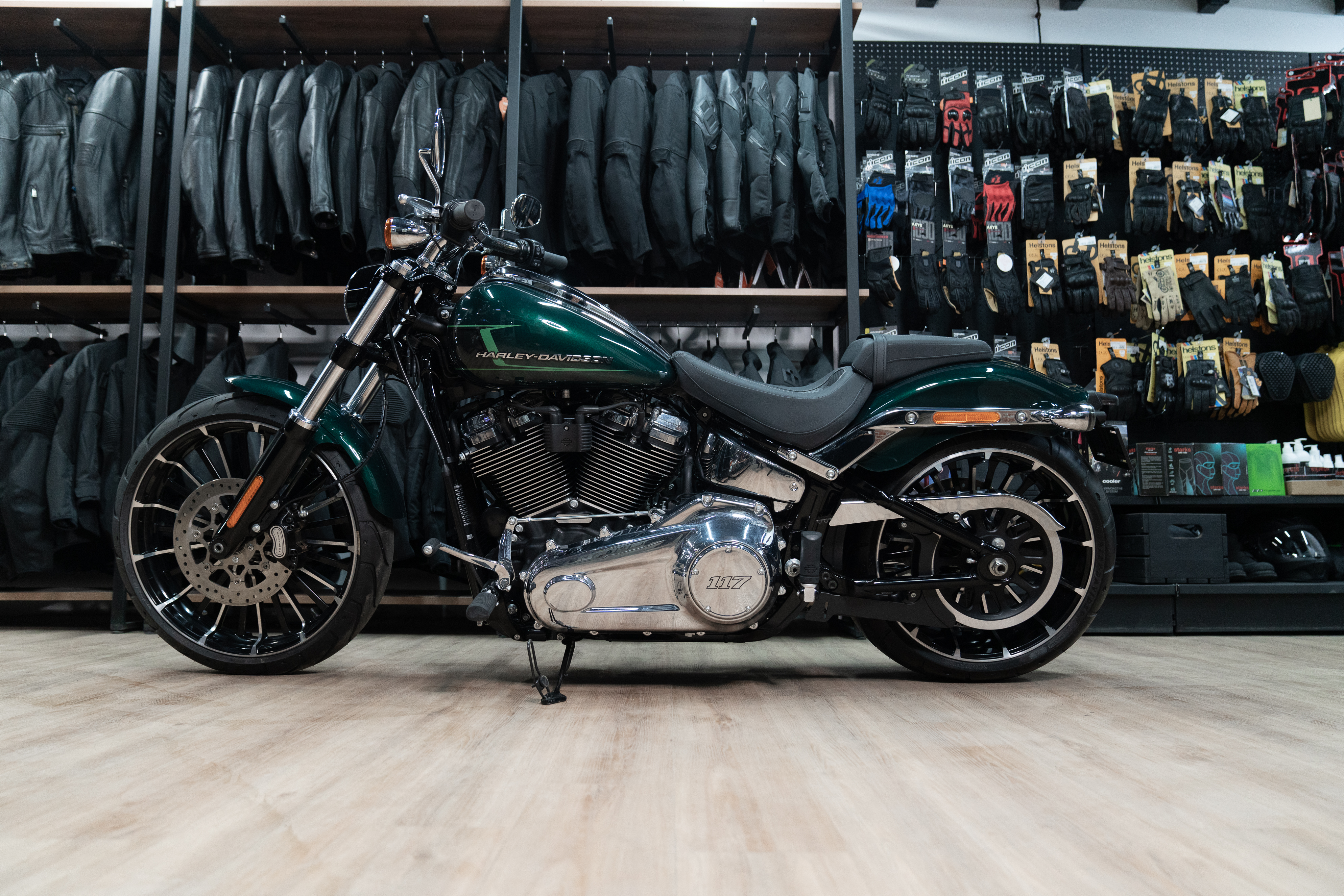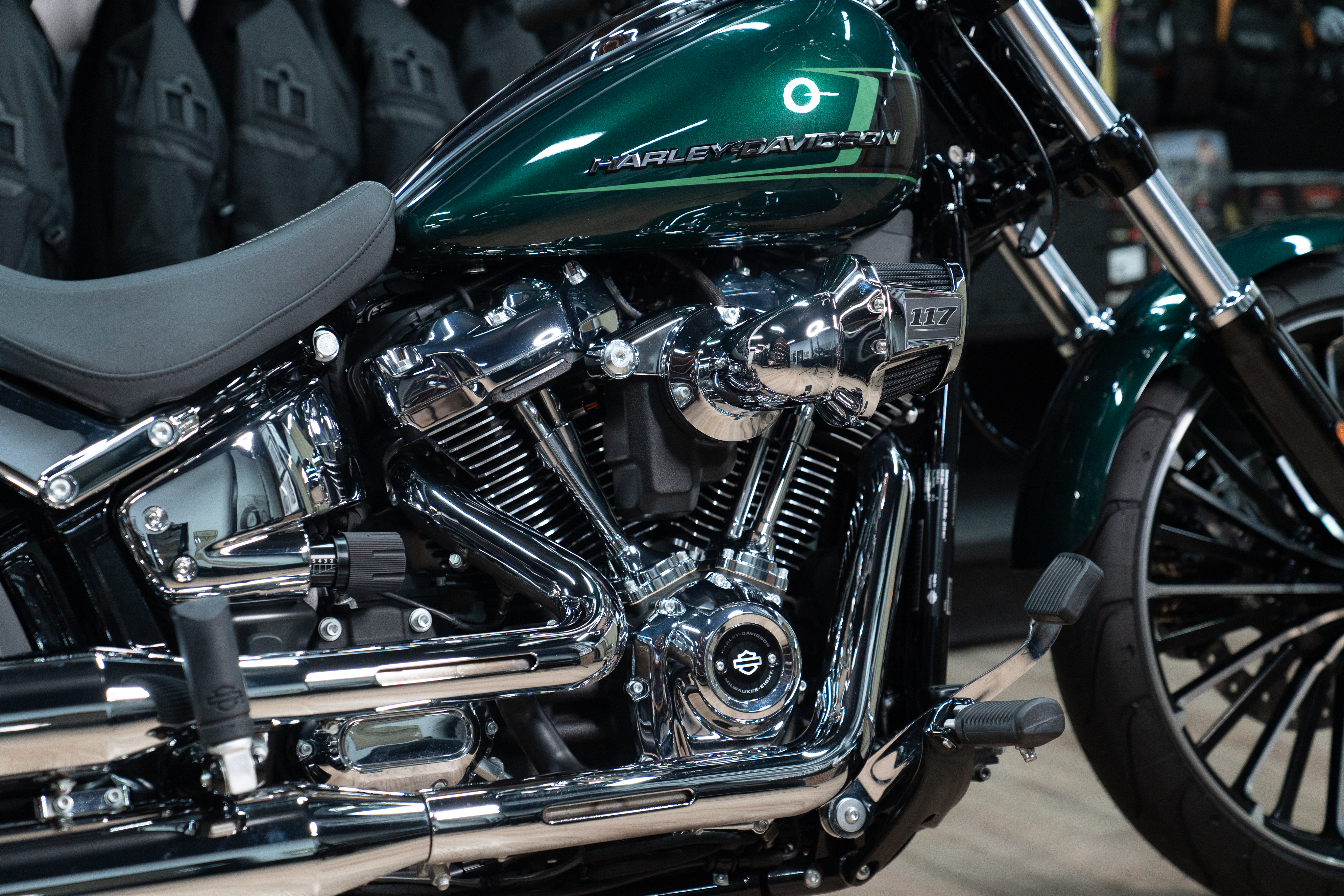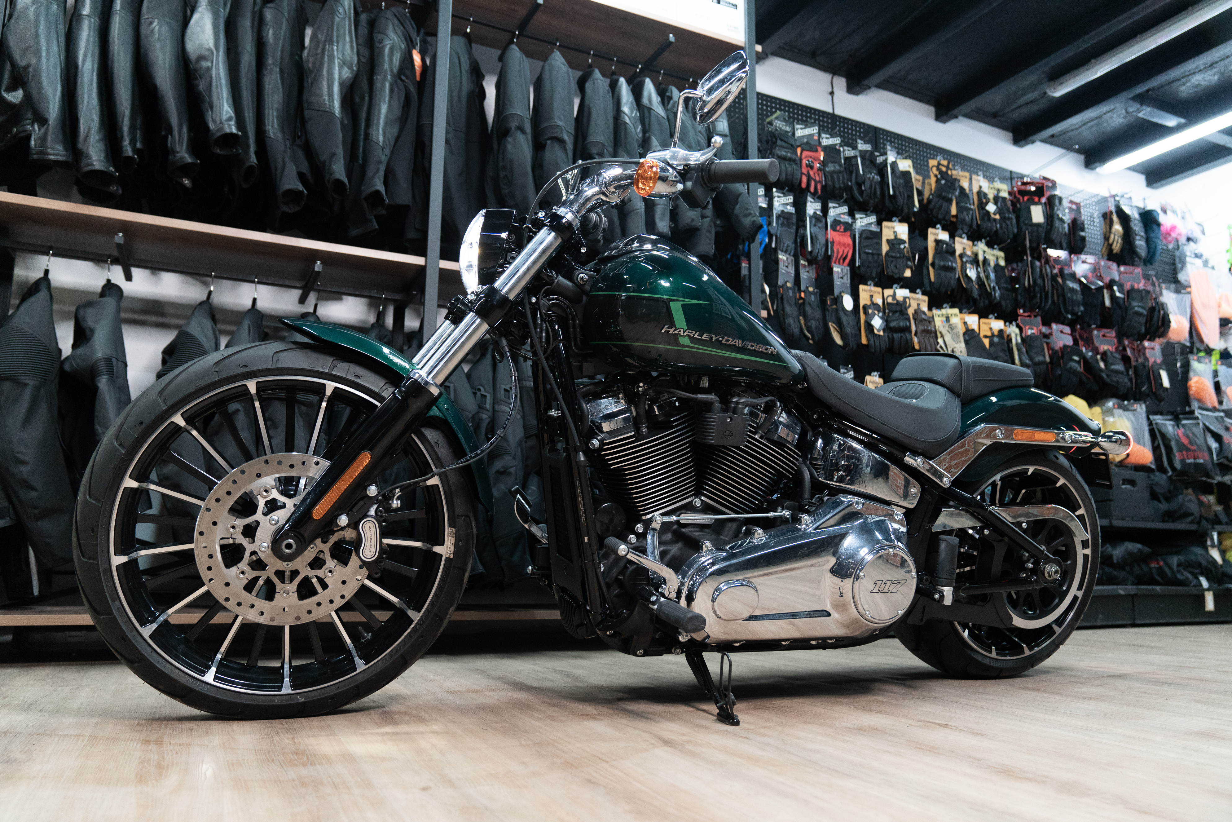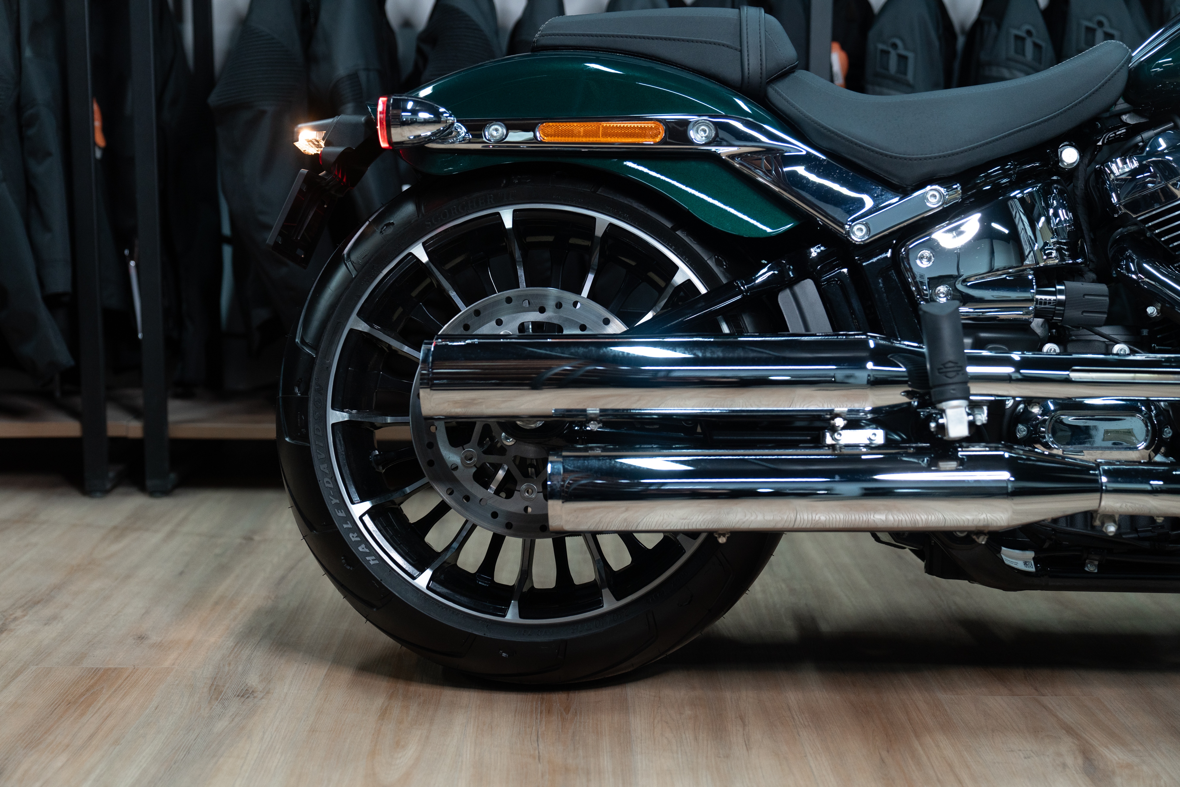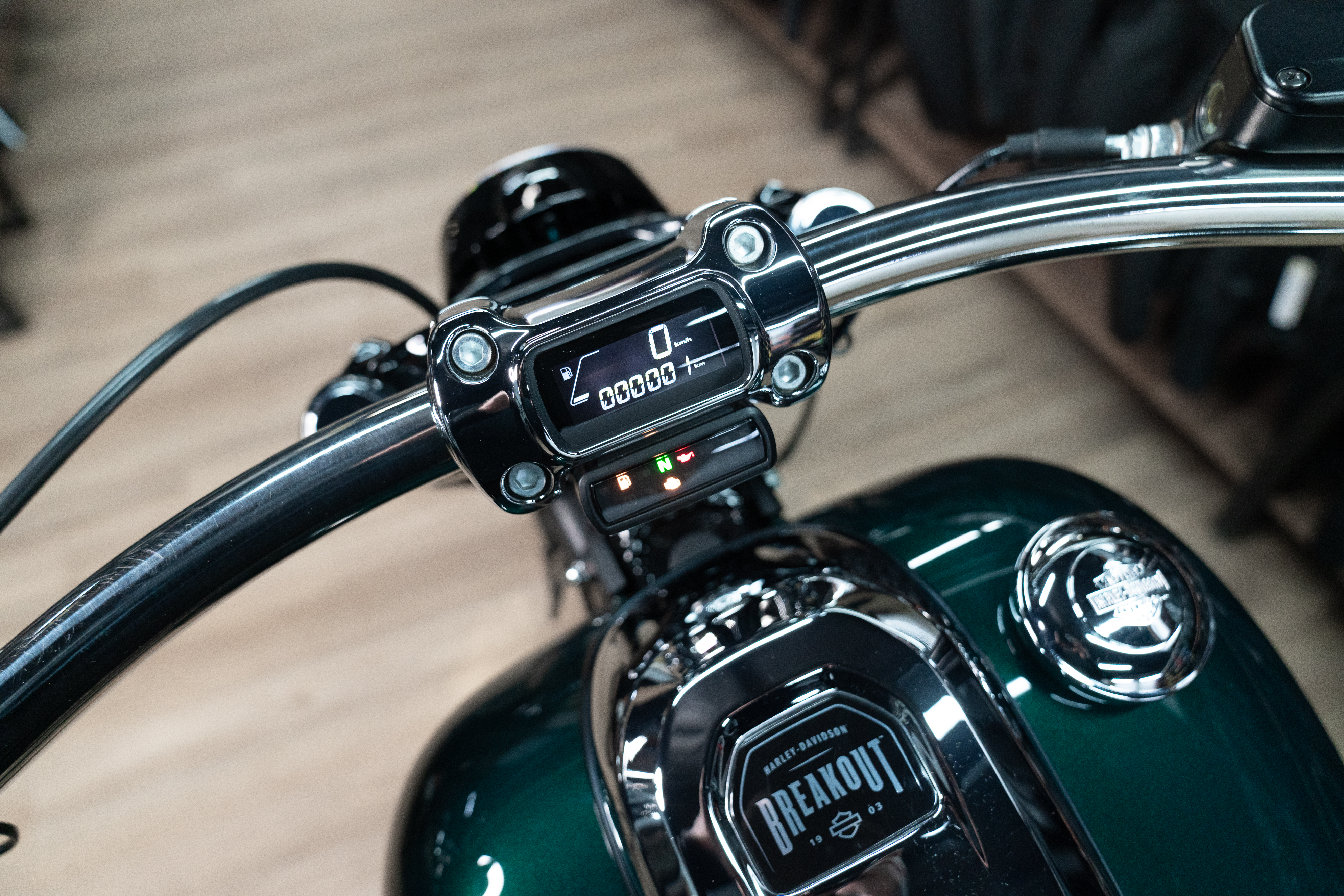 Подчеркните вашу индивидуальность в уникальном цвете Alpine Green. Harley-Davidson Breakout 117 украшенный хромом, представляет собой крутой круизер с мускулистым двигателем Milwaukee-Eight 117 V-Twin и широким задним колесом.