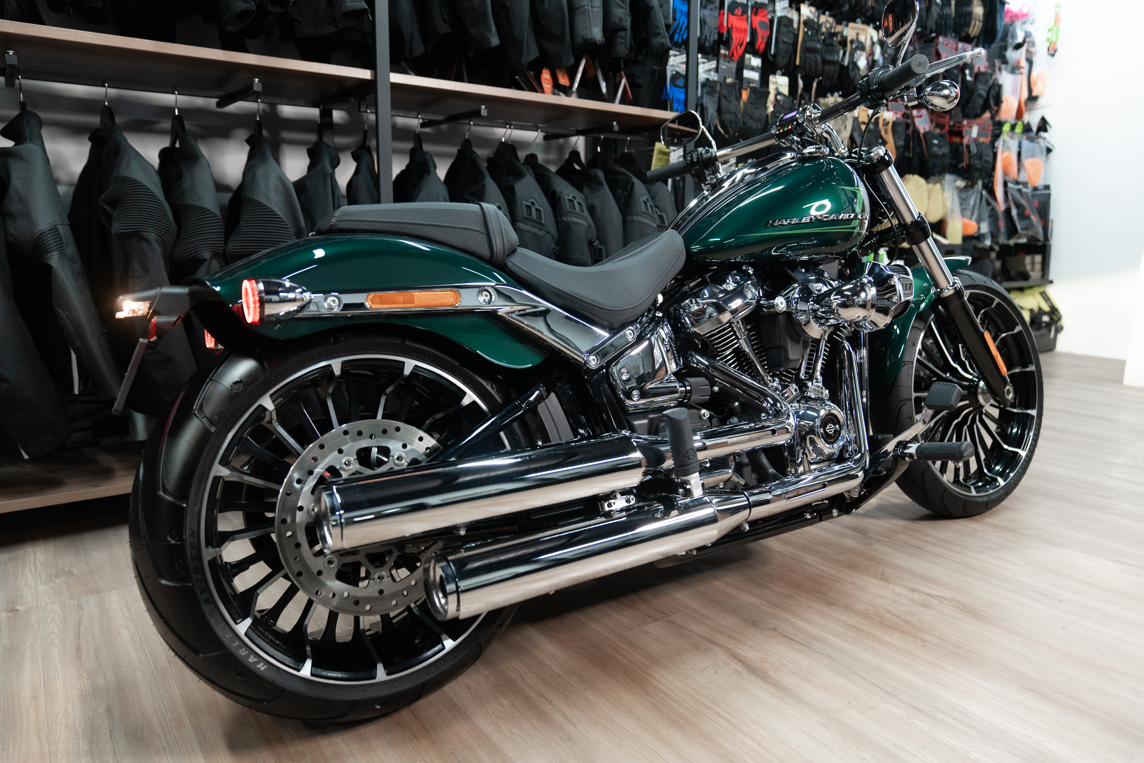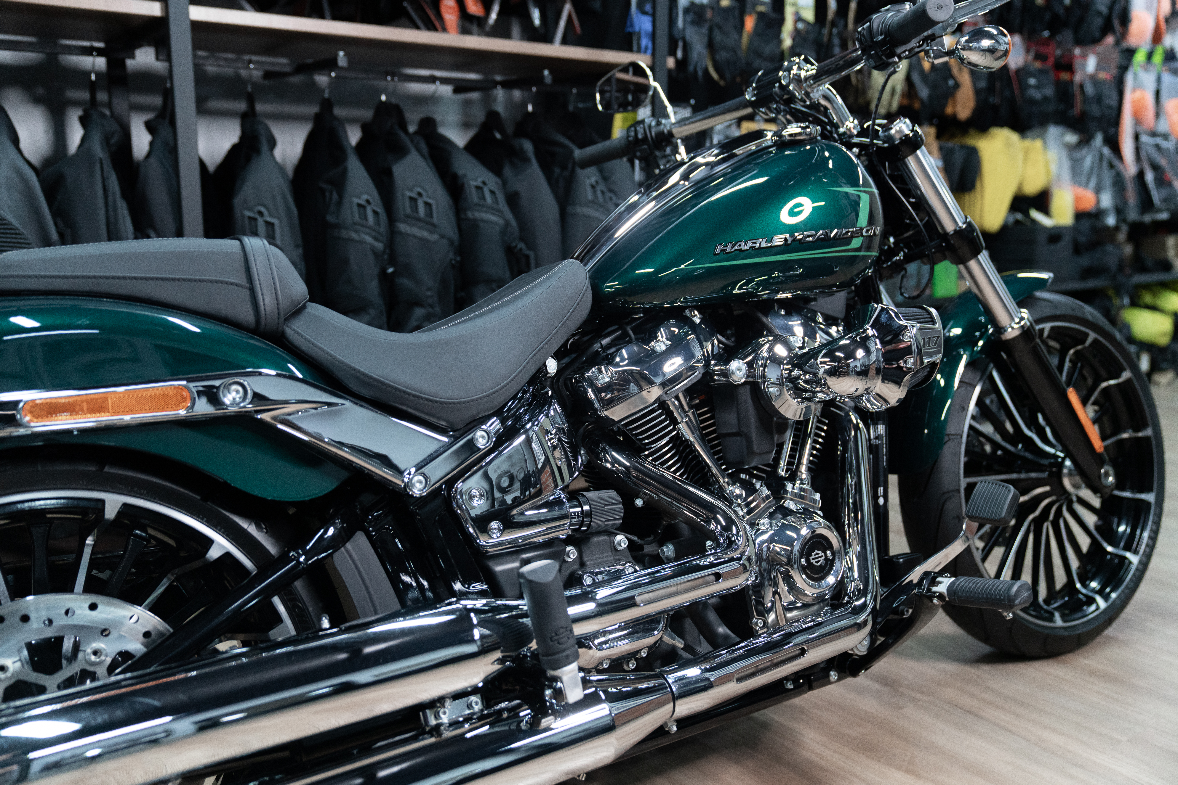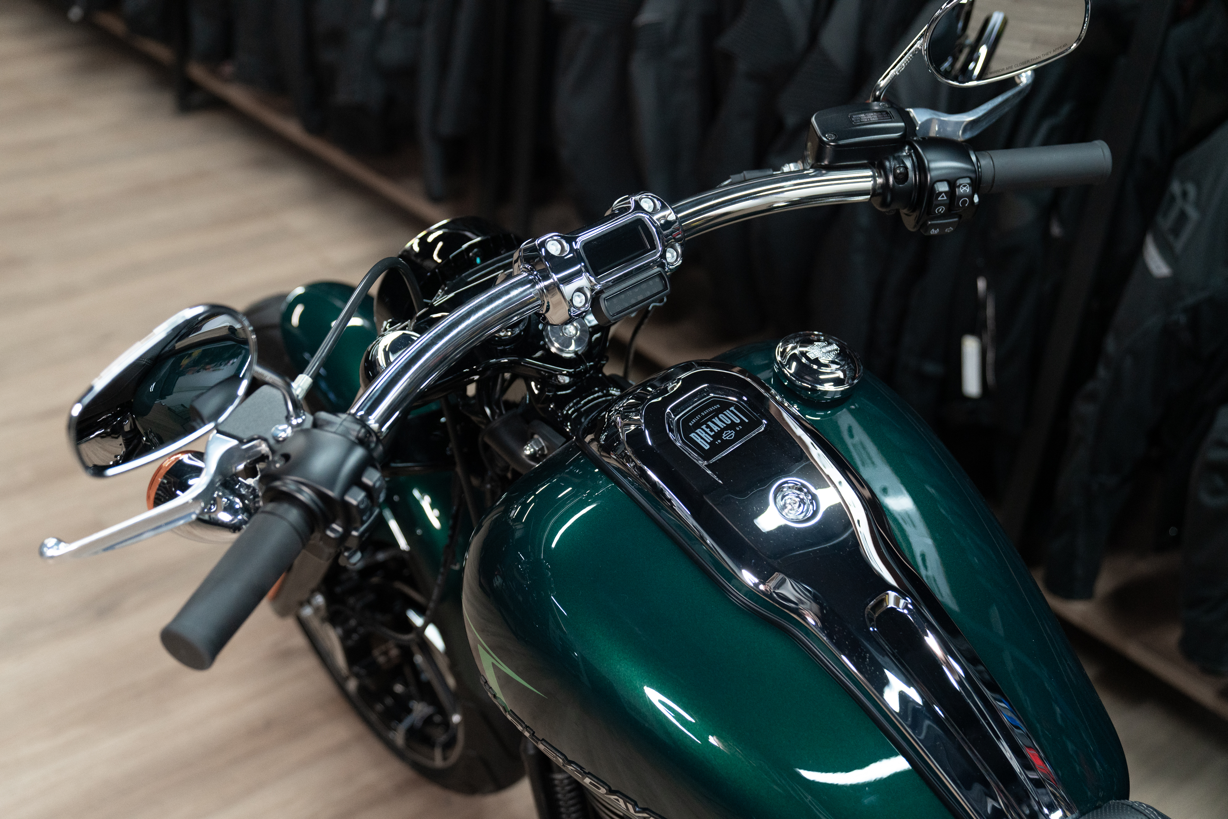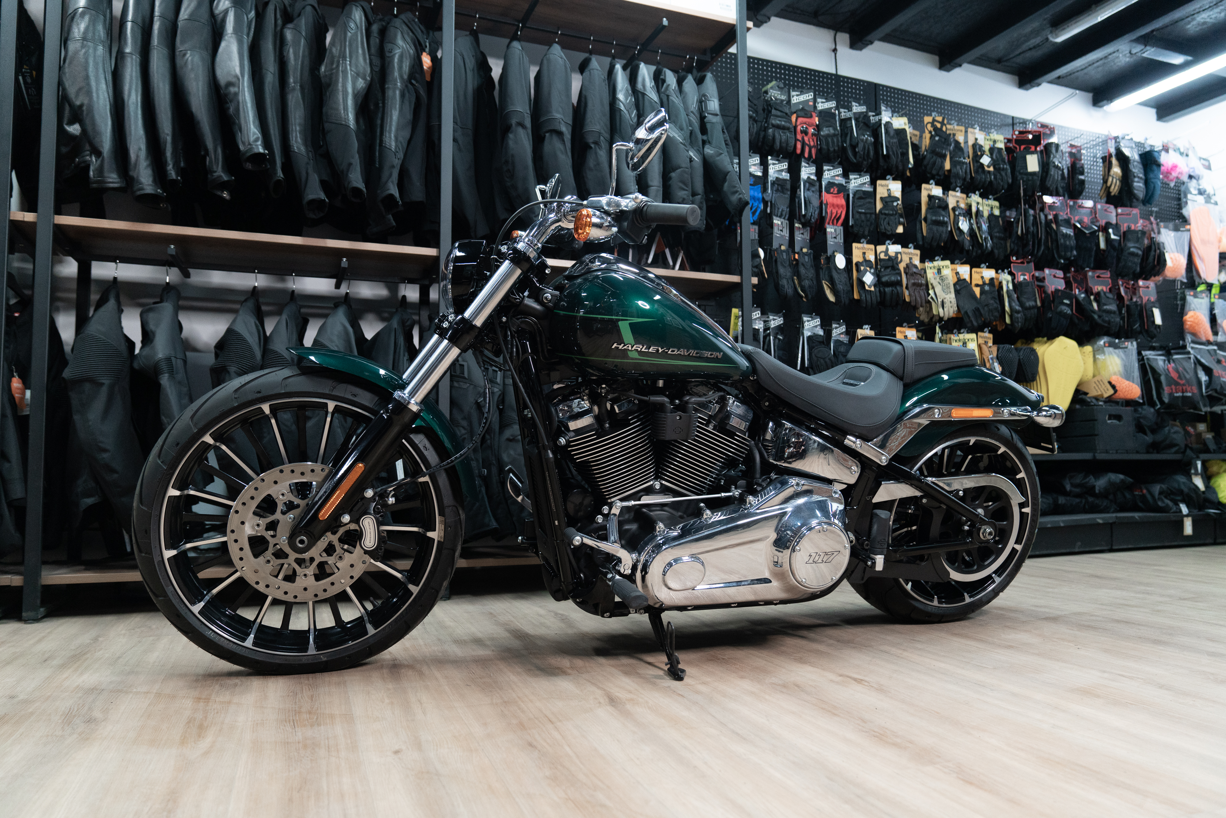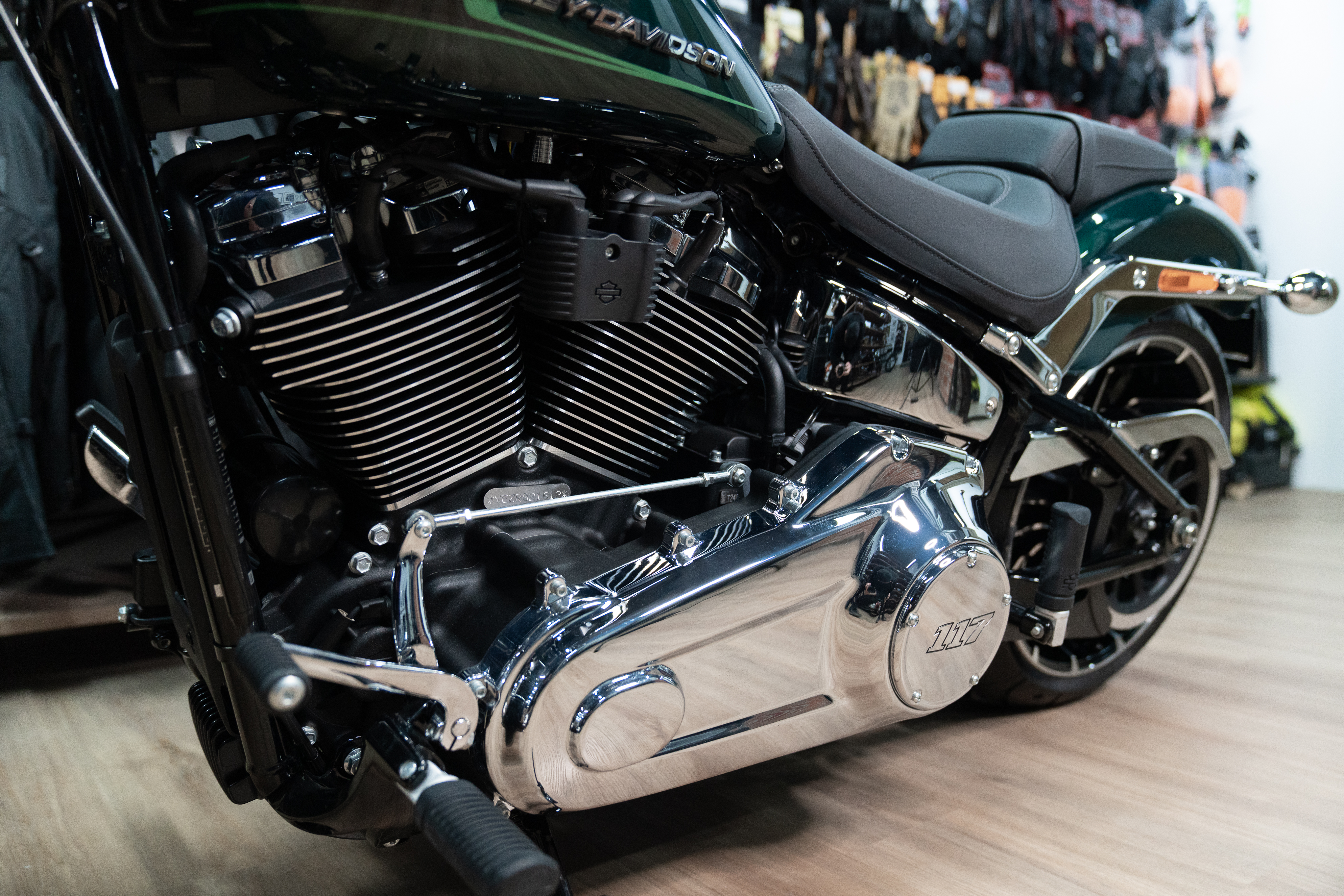 Подчеркните вашу индивидуальность в уникальном цвете Alpine Green. Harley-Davidson Breakout 117 украшенный хромом, представляет собой крутой круизер с мускулистым двигателем Milwaukee-Eight 117 V-Twin и широким задним колесом.