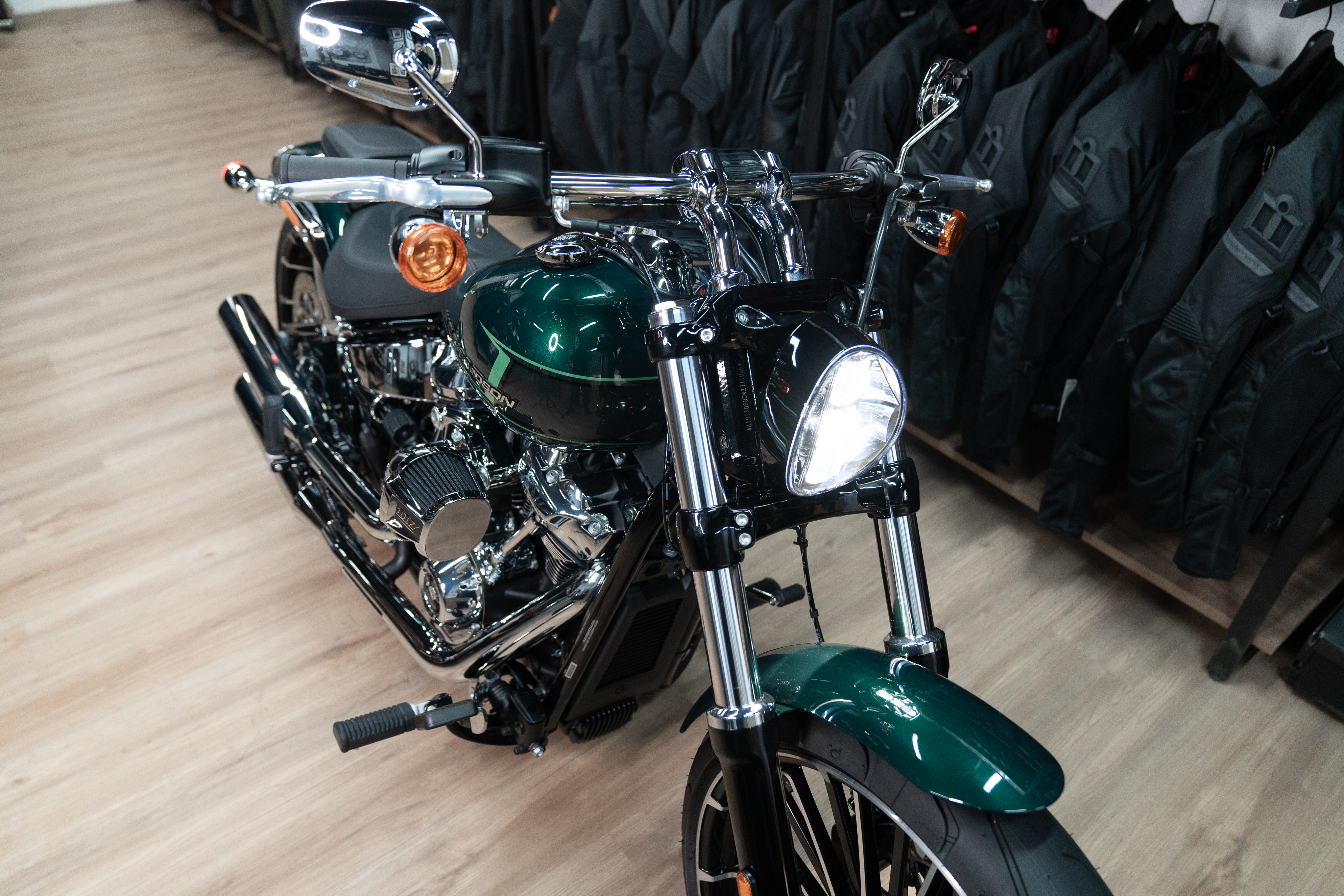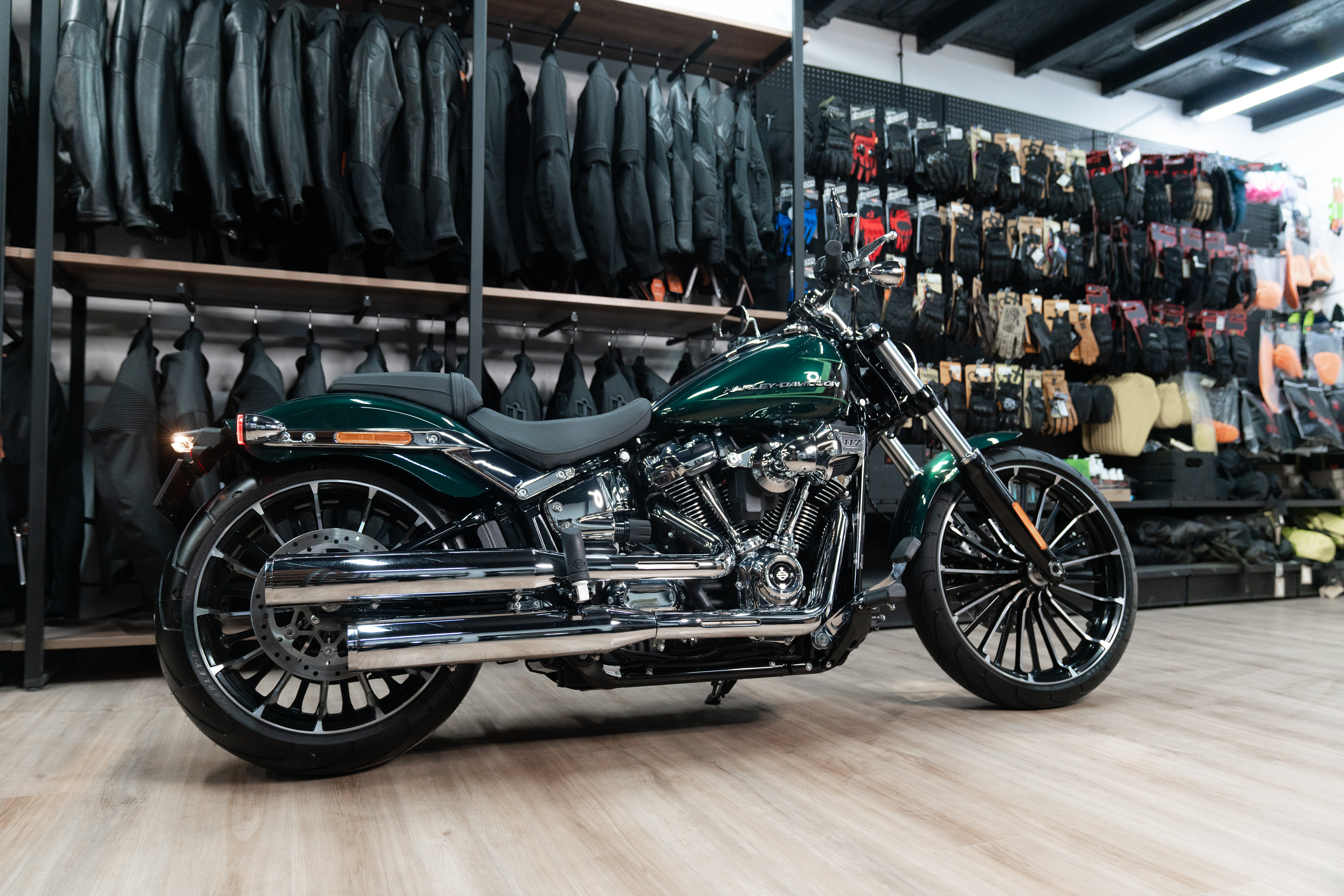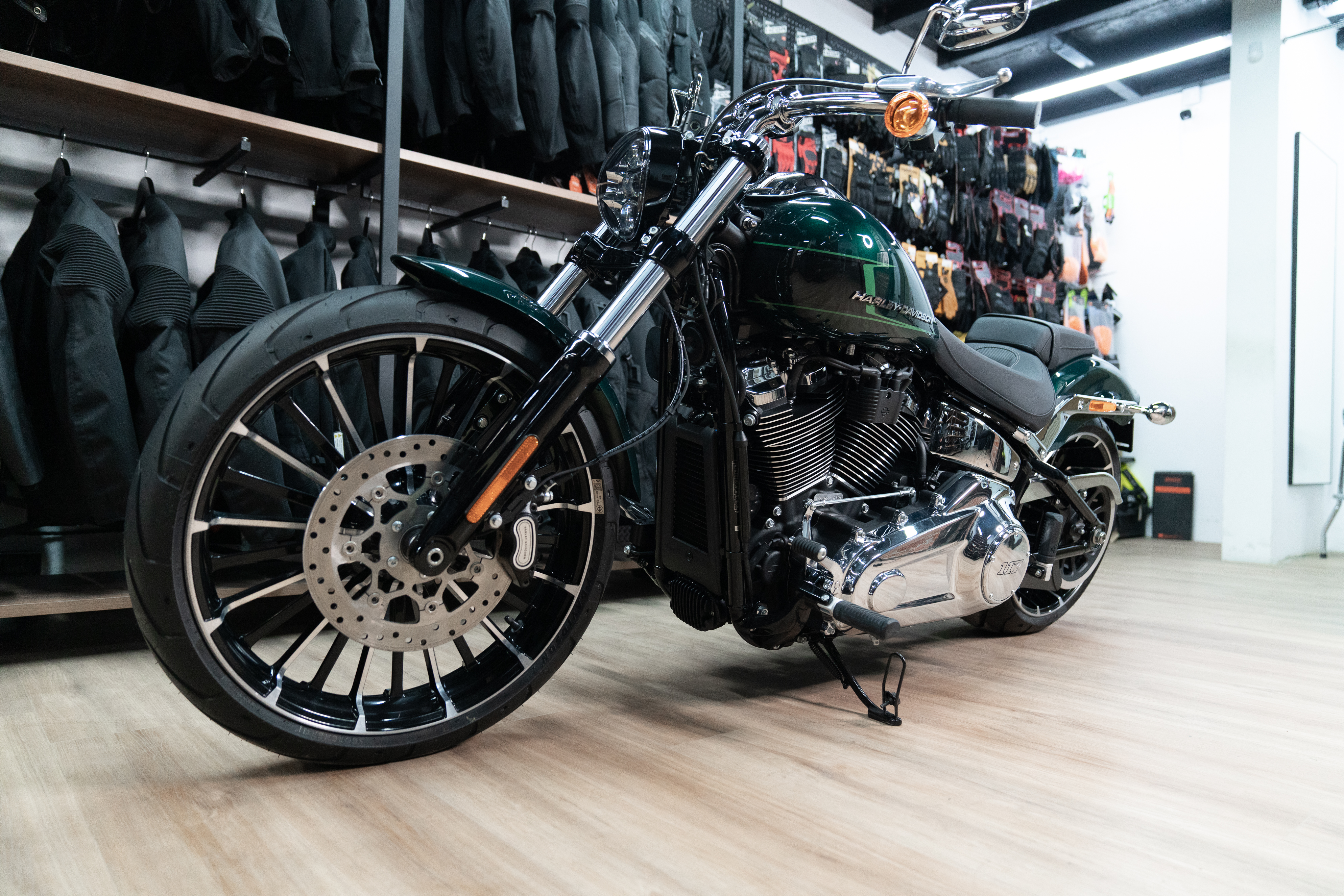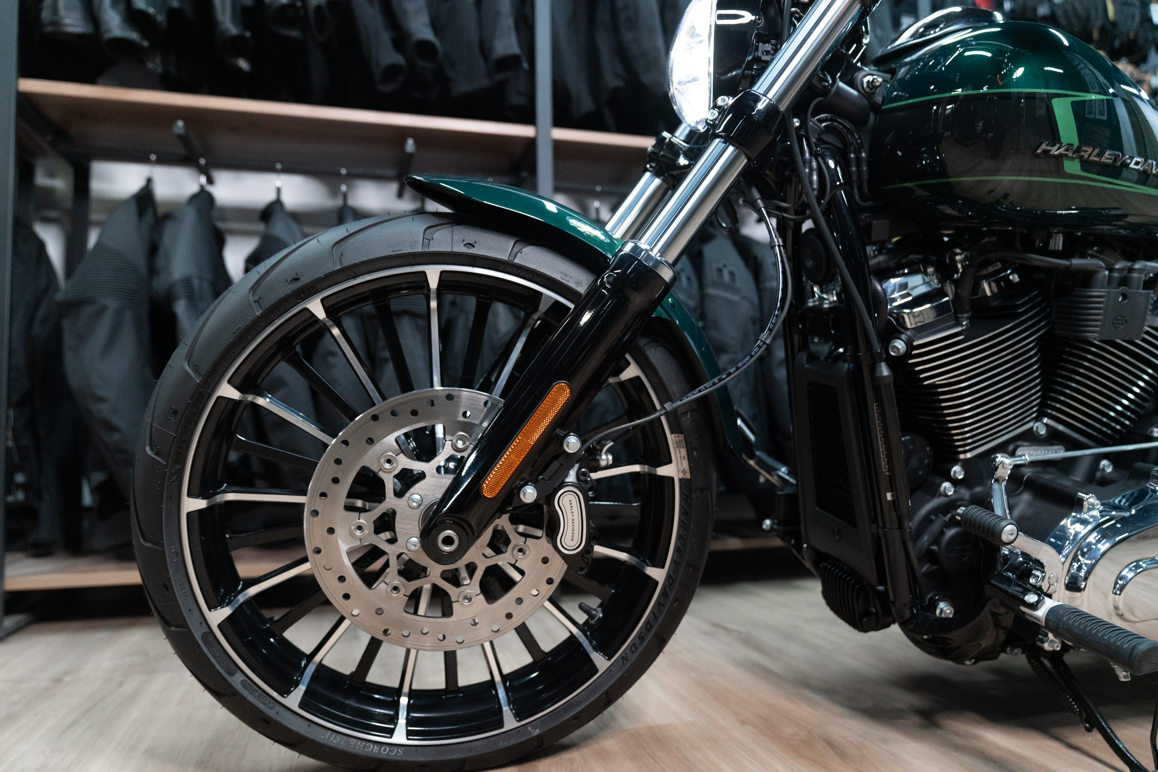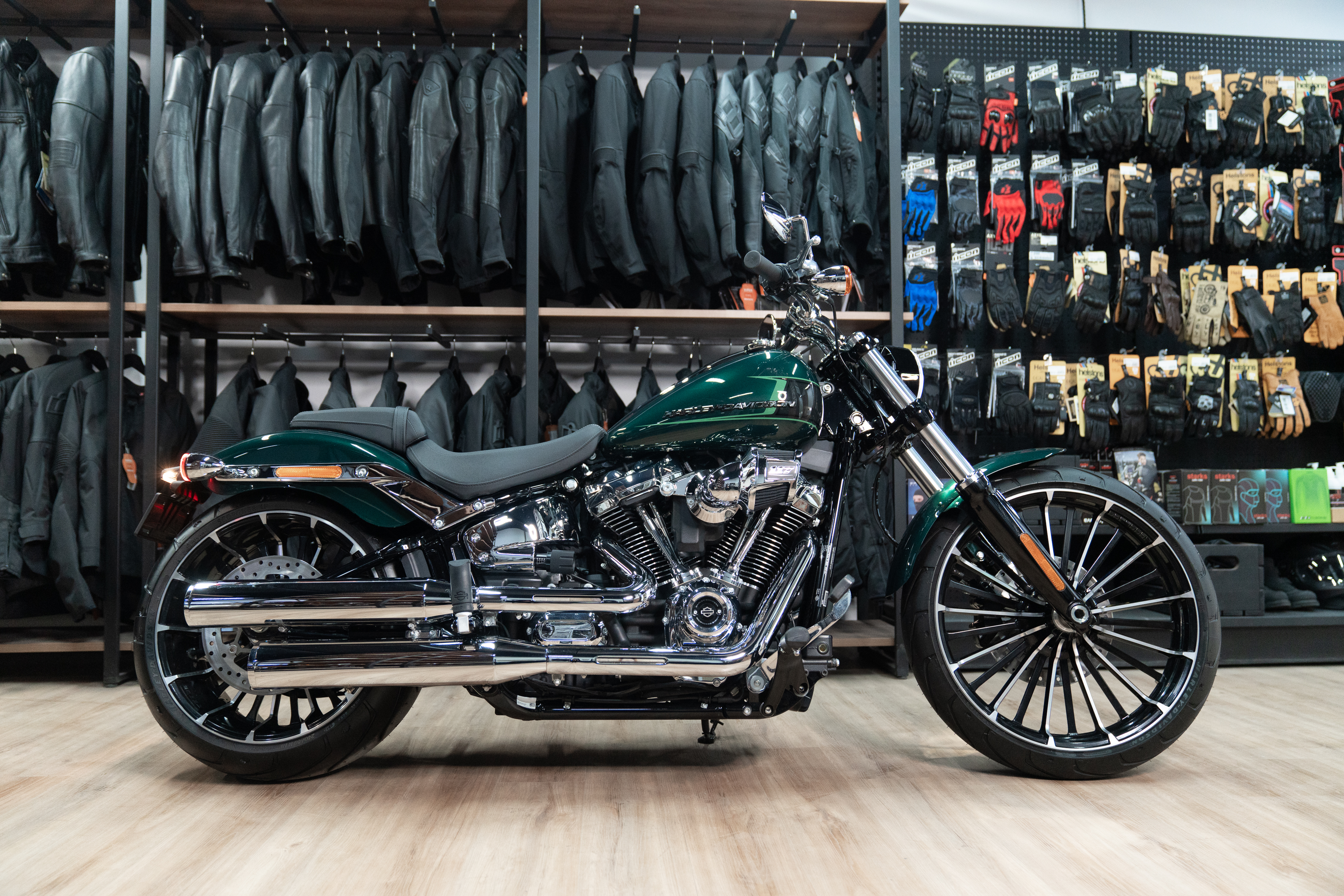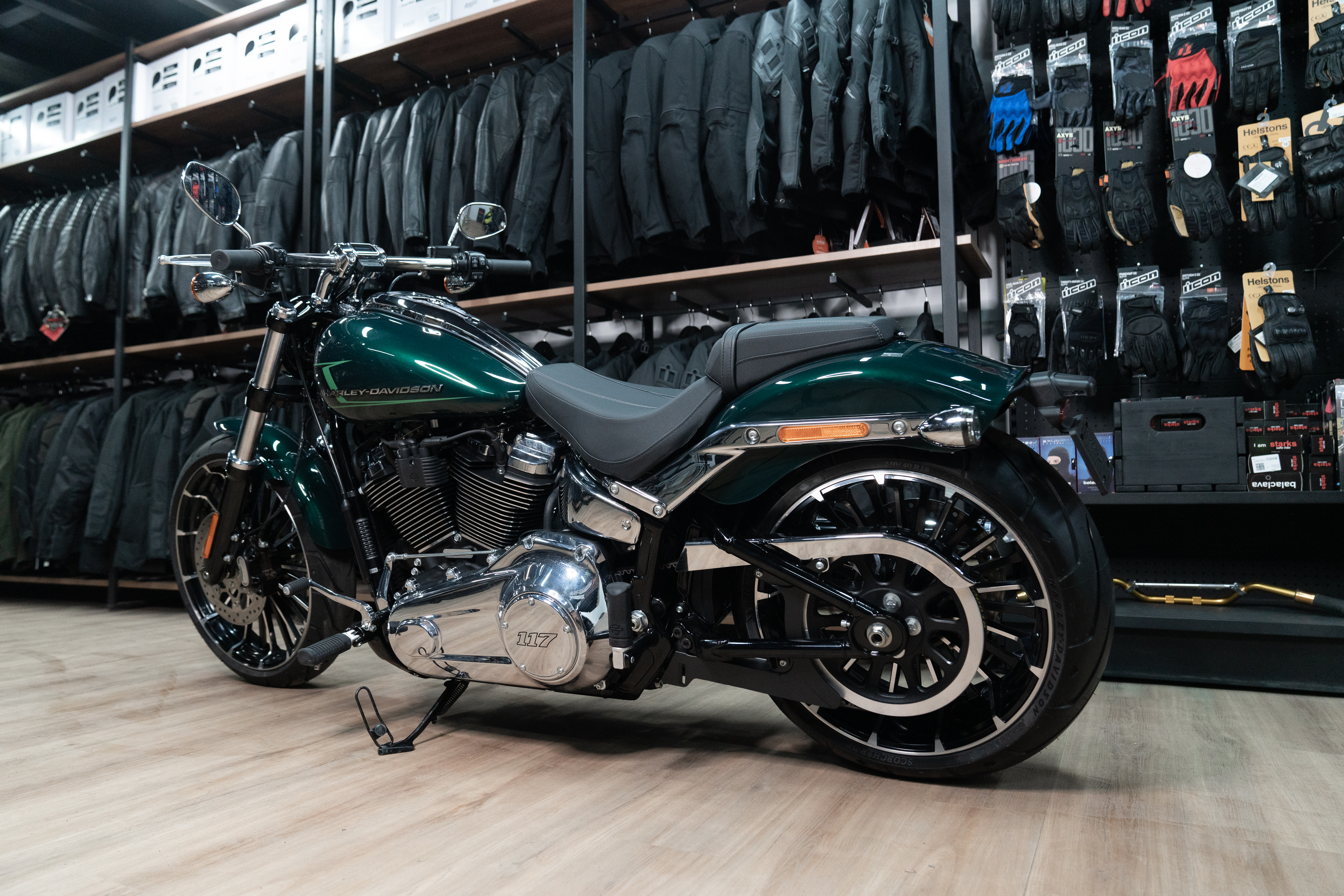 Подчеркните вашу индивидуальность в уникальном цвете Alpine Green. Harley-Davidson Breakout 117 украшенный хромом, представляет собой крутой круизер с мускулистым двигателем Milwaukee-Eight 117 V-Twin и широким задним колесом.