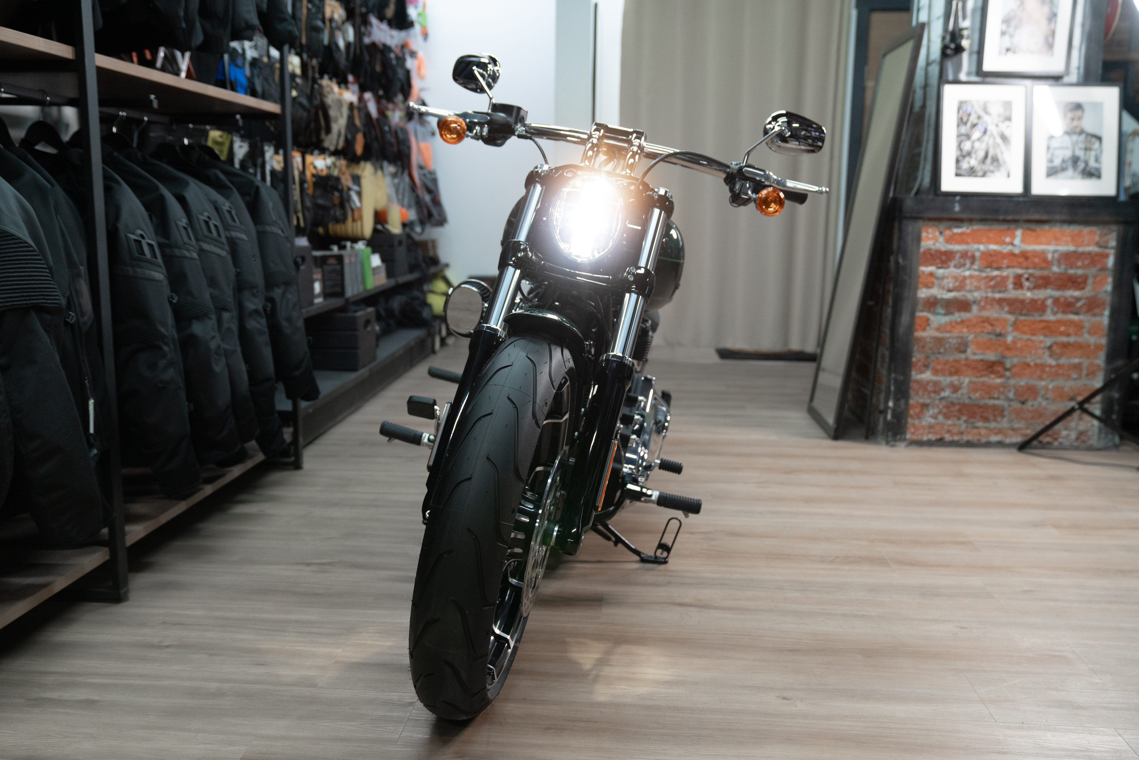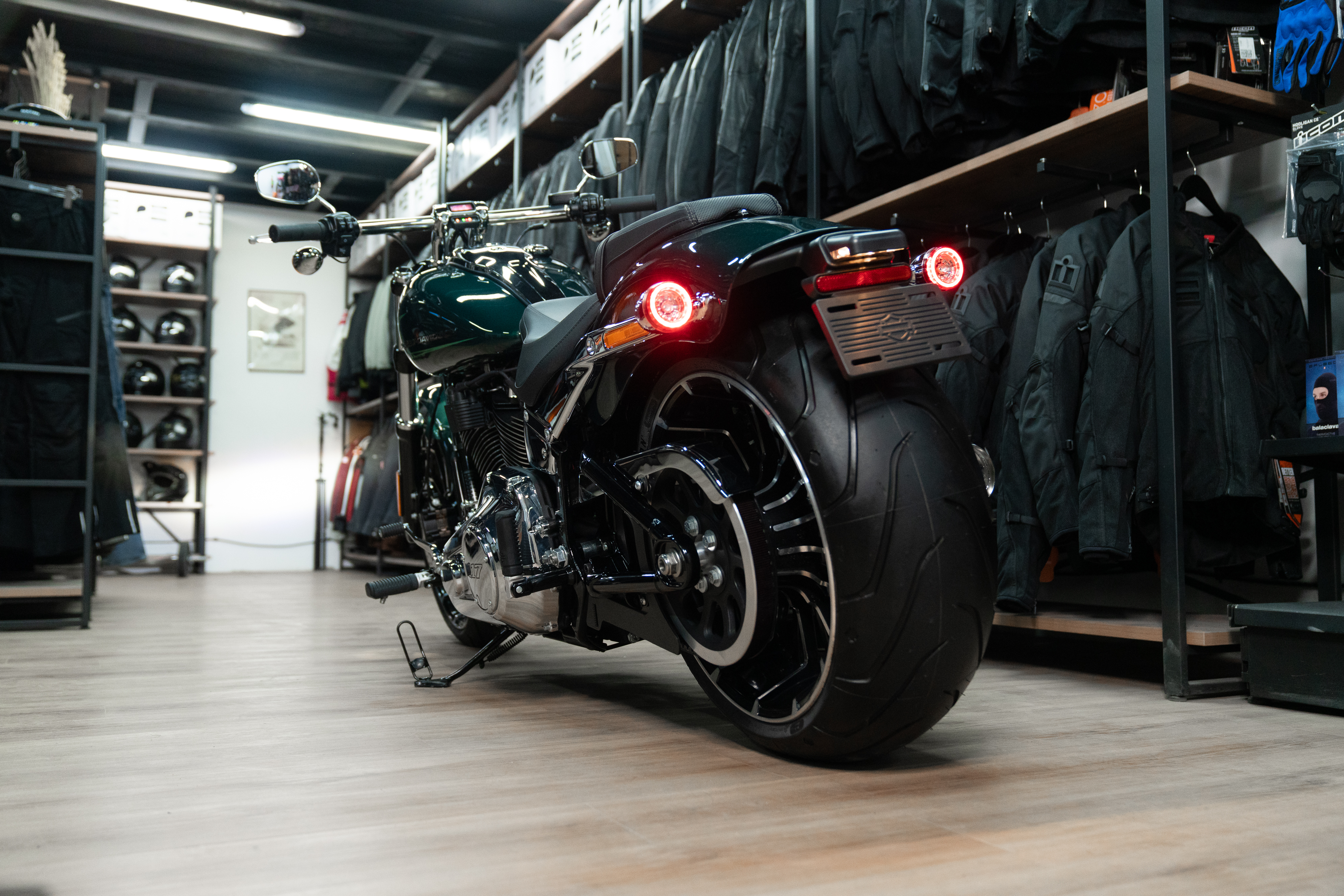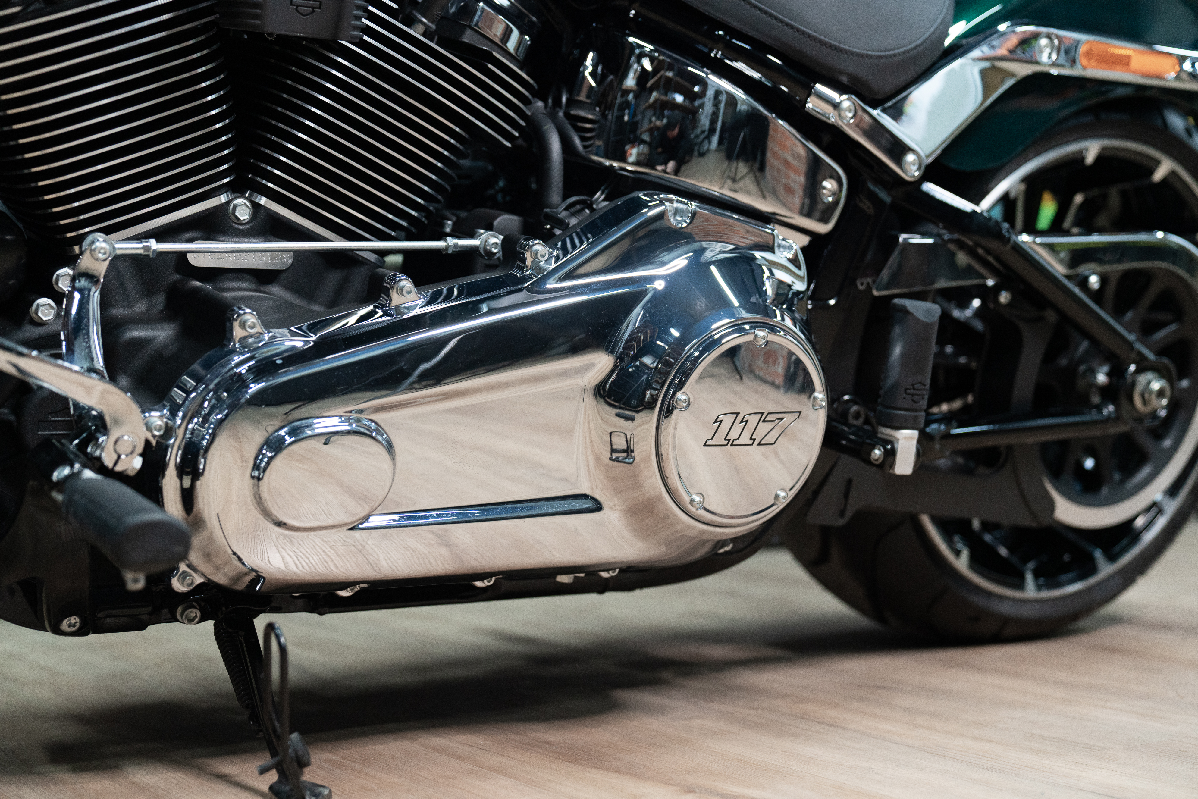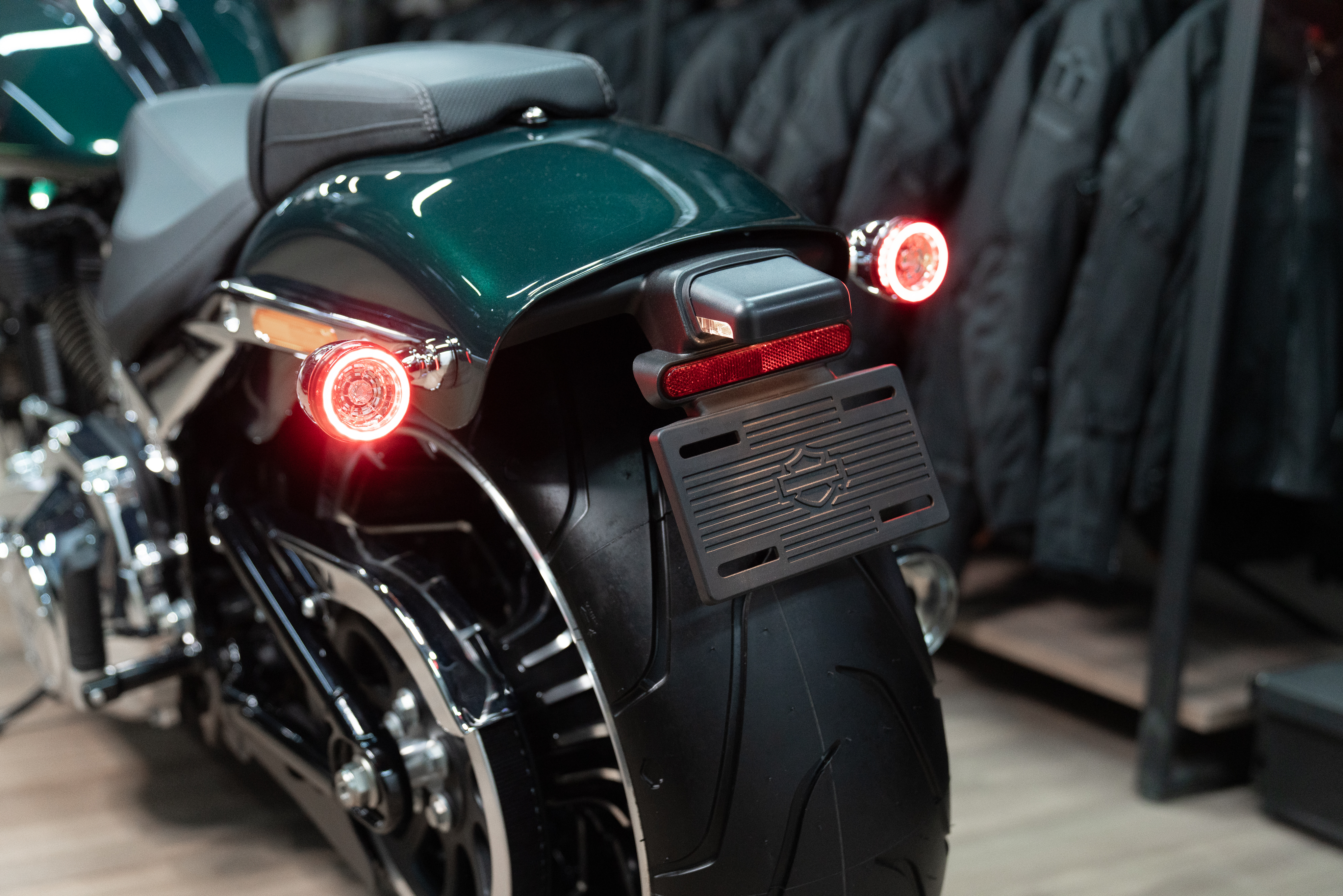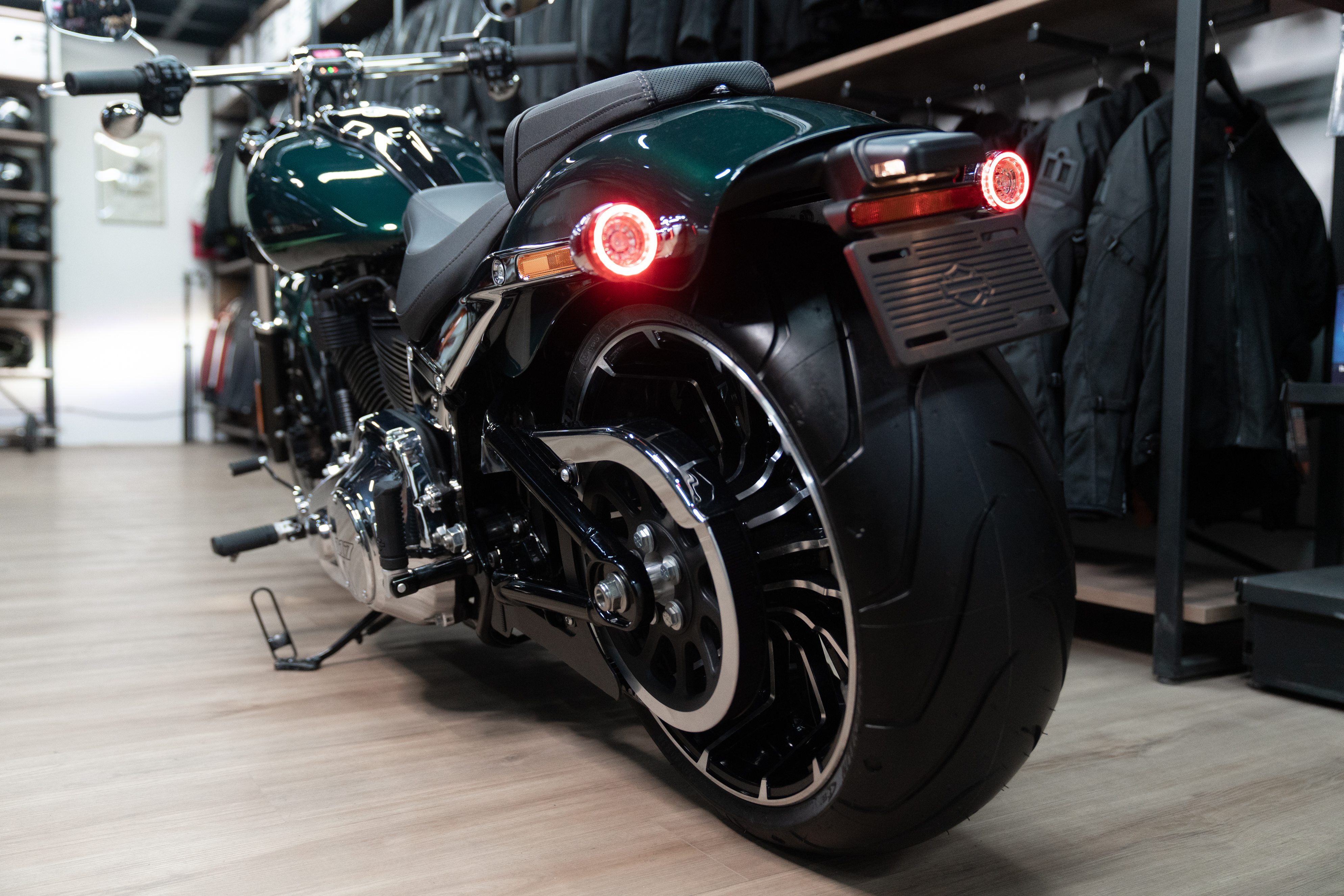 Подчеркните вашу индивидуальность в уникальном цвете Alpine Green. Harley-Davidson Breakout 117 украшенный хромом, представляет собой крутой круизер с мускулистым двигателем Milwaukee-Eight 117 V-Twin и широким задним колесом.