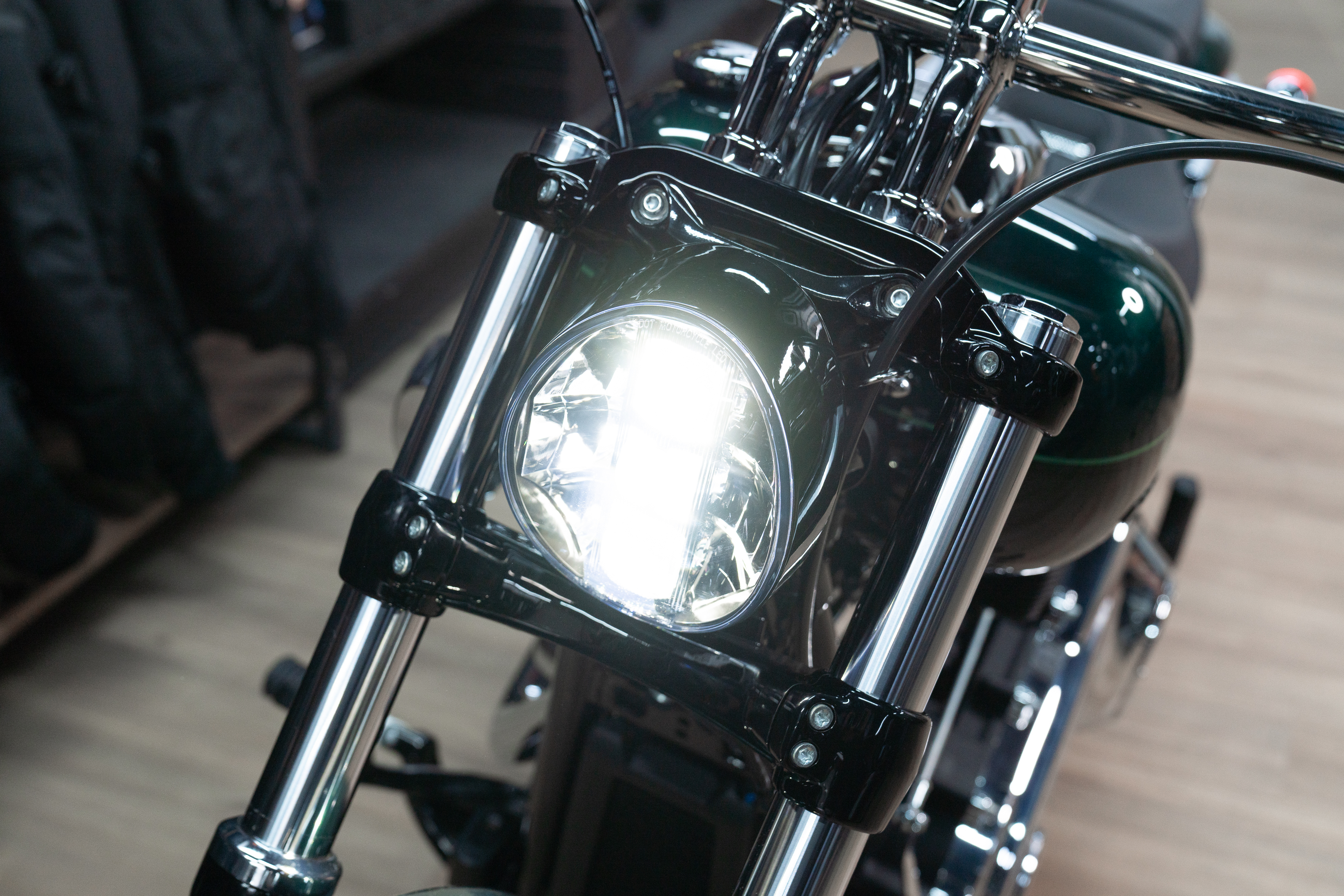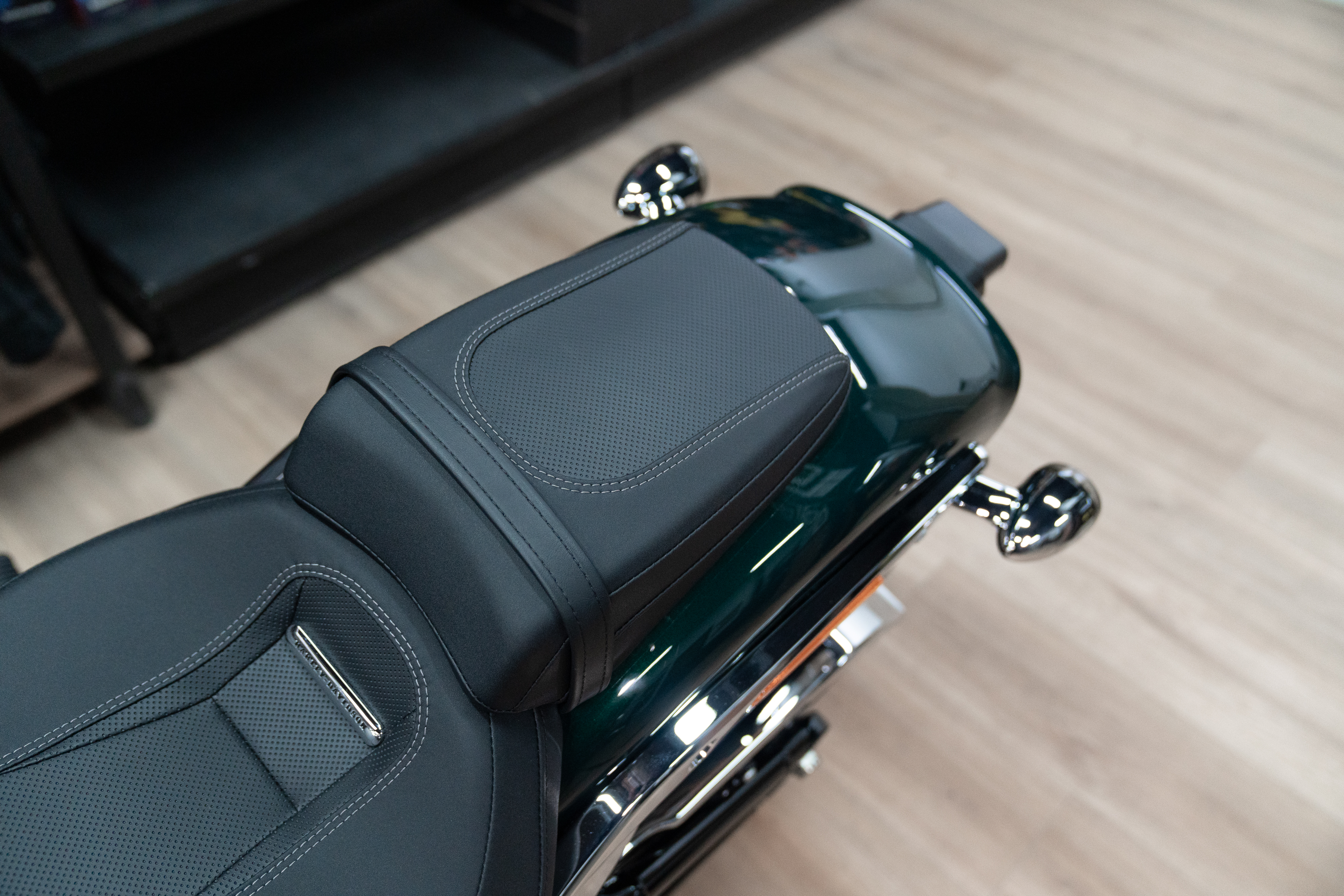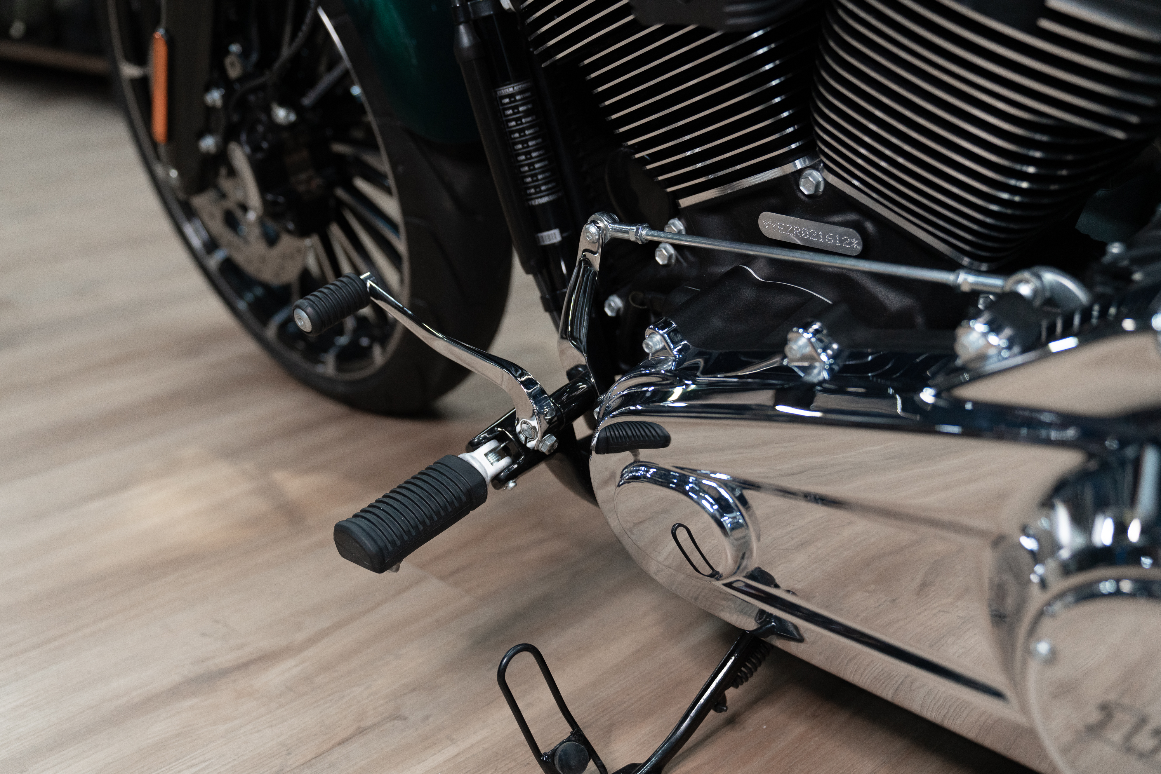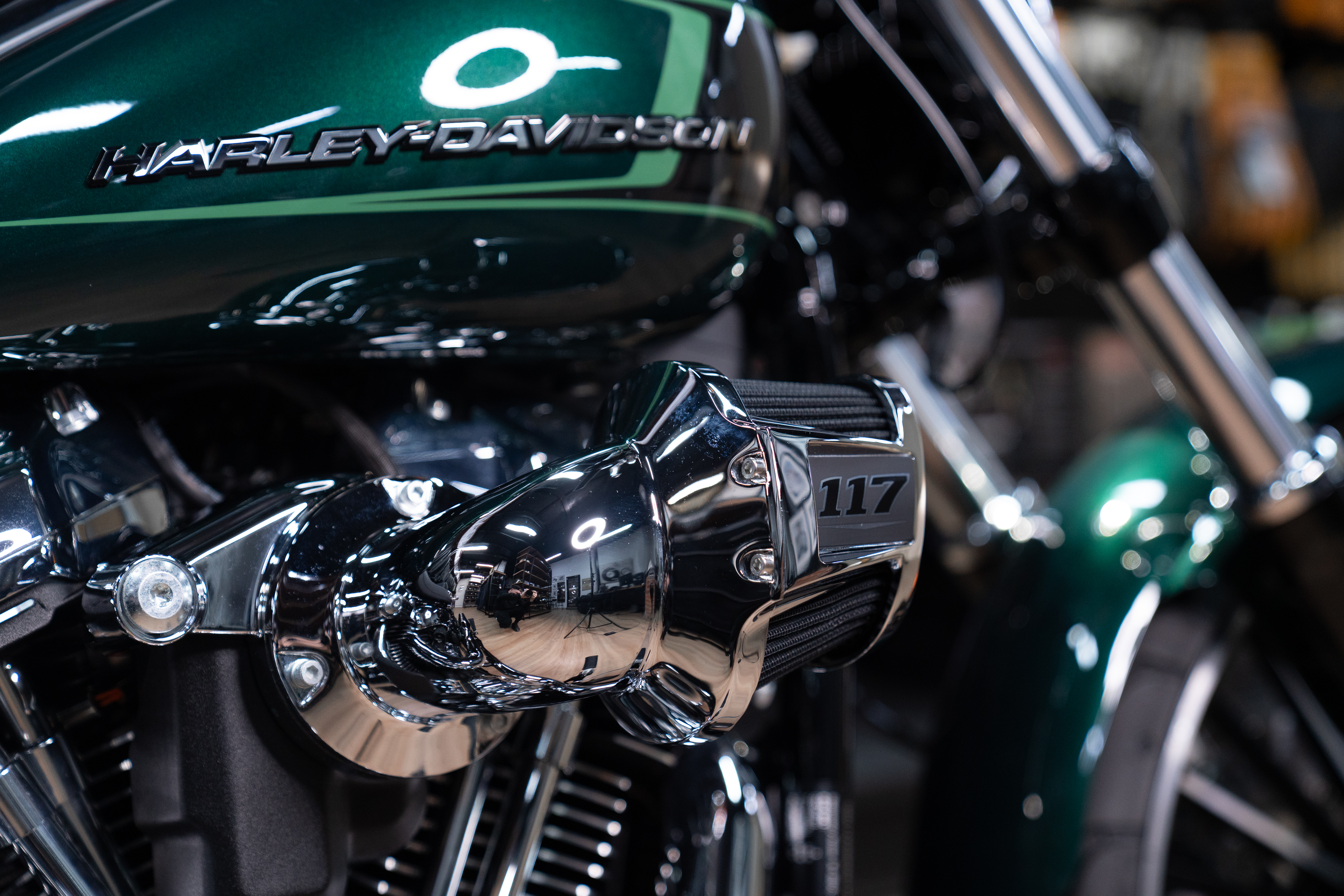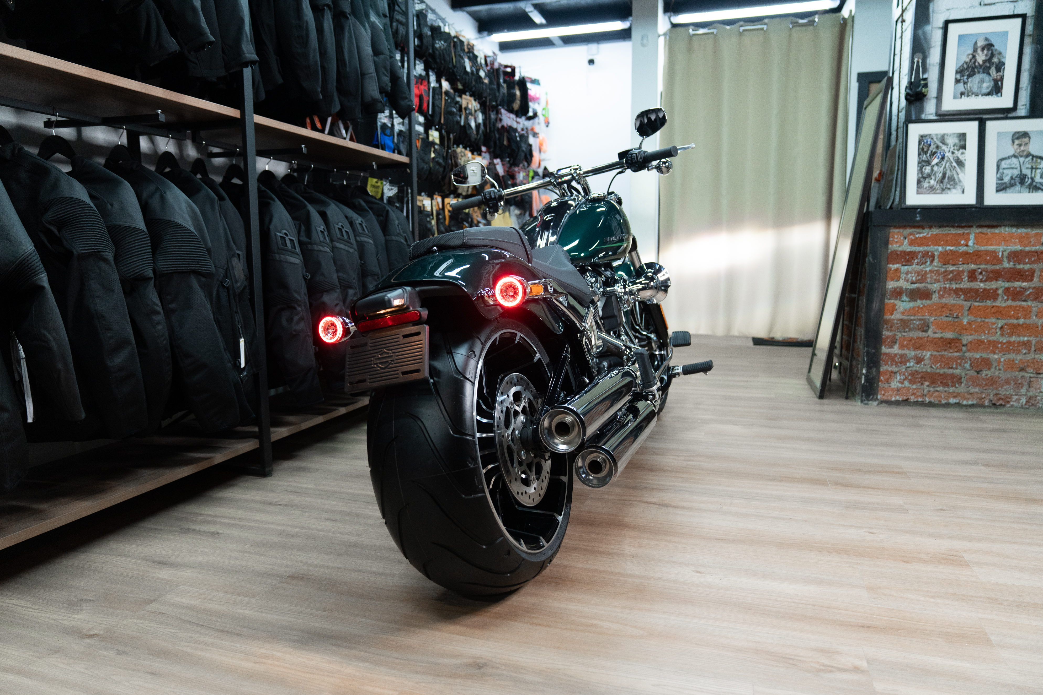 Подчеркните вашу индивидуальность в уникальном цвете Alpine Green. Harley-Davidson Breakout 117 украшенный хромом, представляет собой крутой круизер с мускулистым двигателем Milwaukee-Eight 117 V-Twin и широким задним колесом.