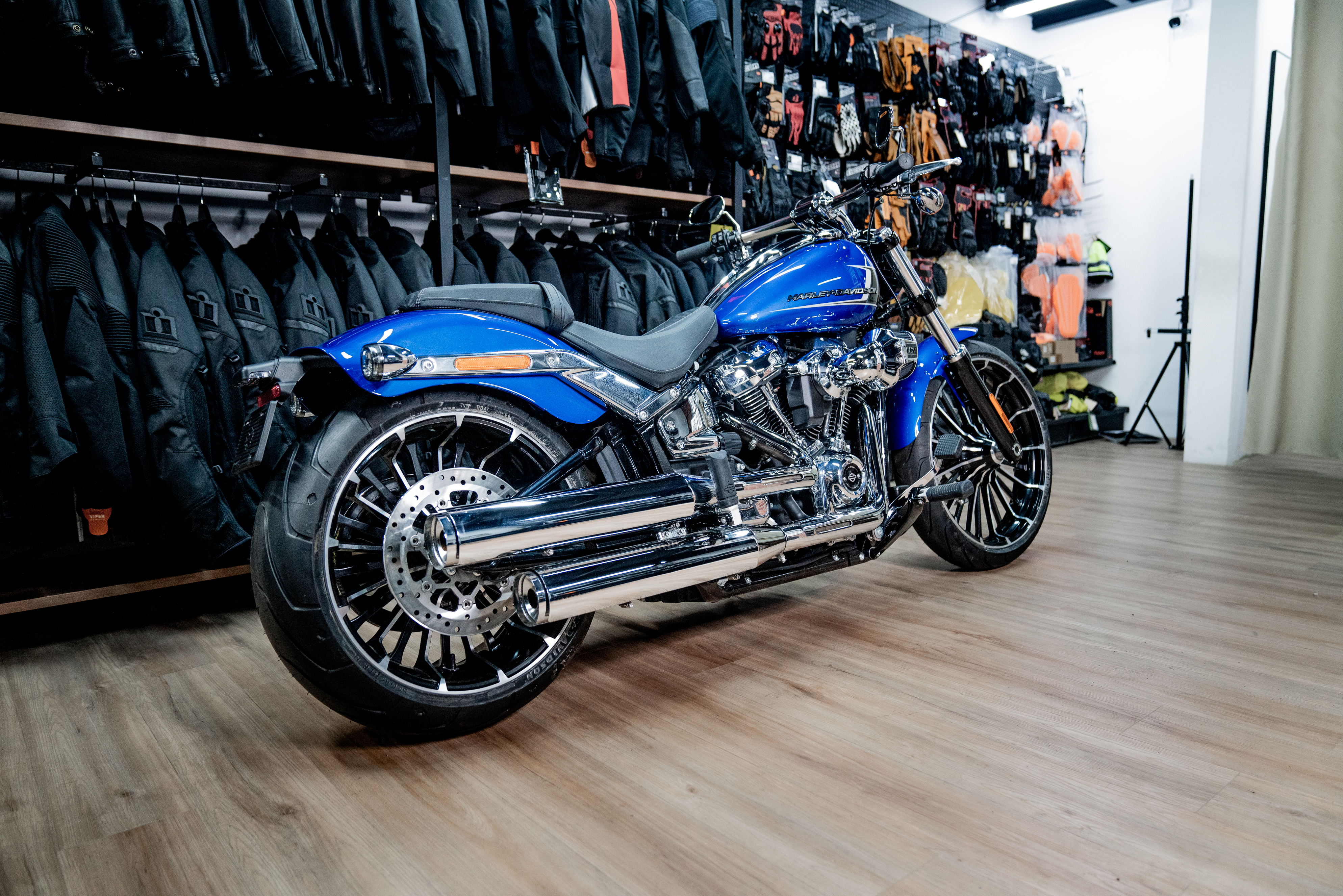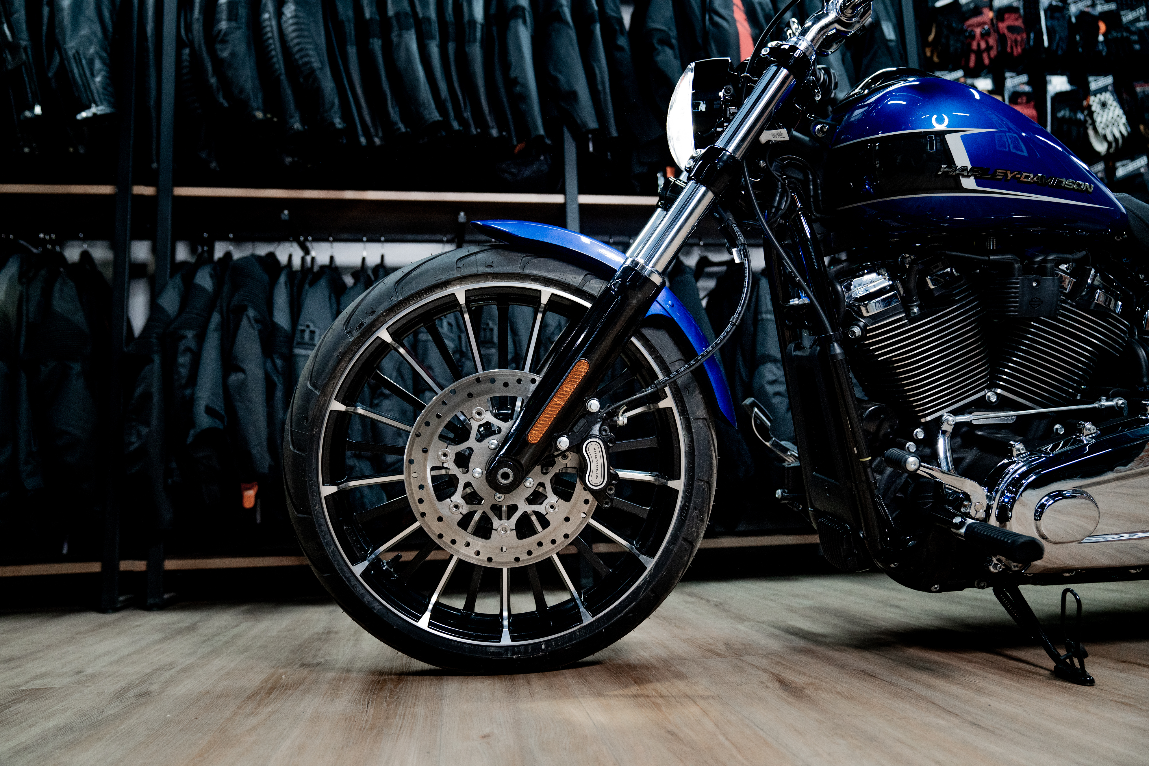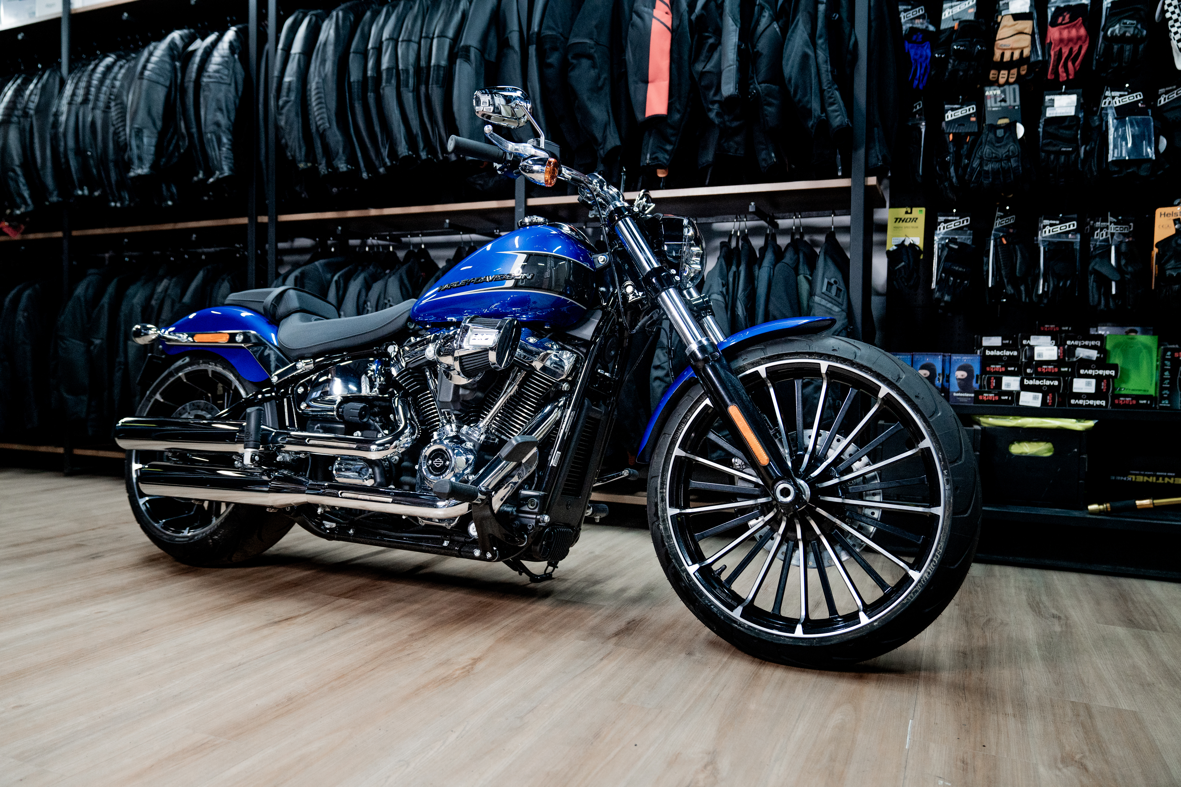 Подчеркните вашу индивидуальность в уникальном цвете Blue Burst. Harley-Davidson Breakout 117 украшенный хромом, представляет собой крутой круизер с мускулистым двигателем Milwaukee-Eight 117 V-Twin и широким задним колесом.