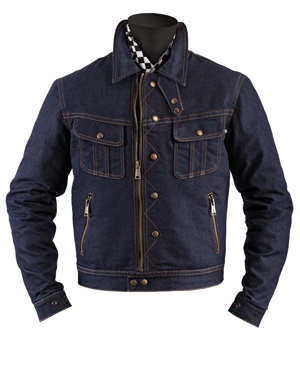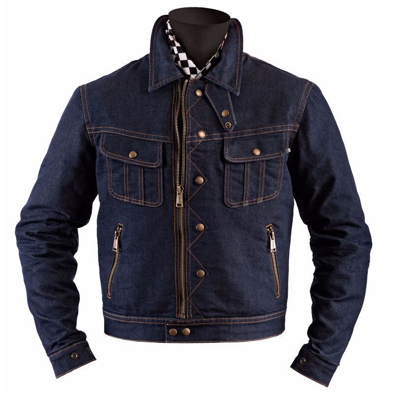 Мужская модель винтажной мотокуртки CANNONBALL синего цвета от французского бренда HELSTONS пошита из джинсовой ткани грубой стирки, состоящей на 50% из хлопка, на 30% из полиэстера и на 20% из кордура.