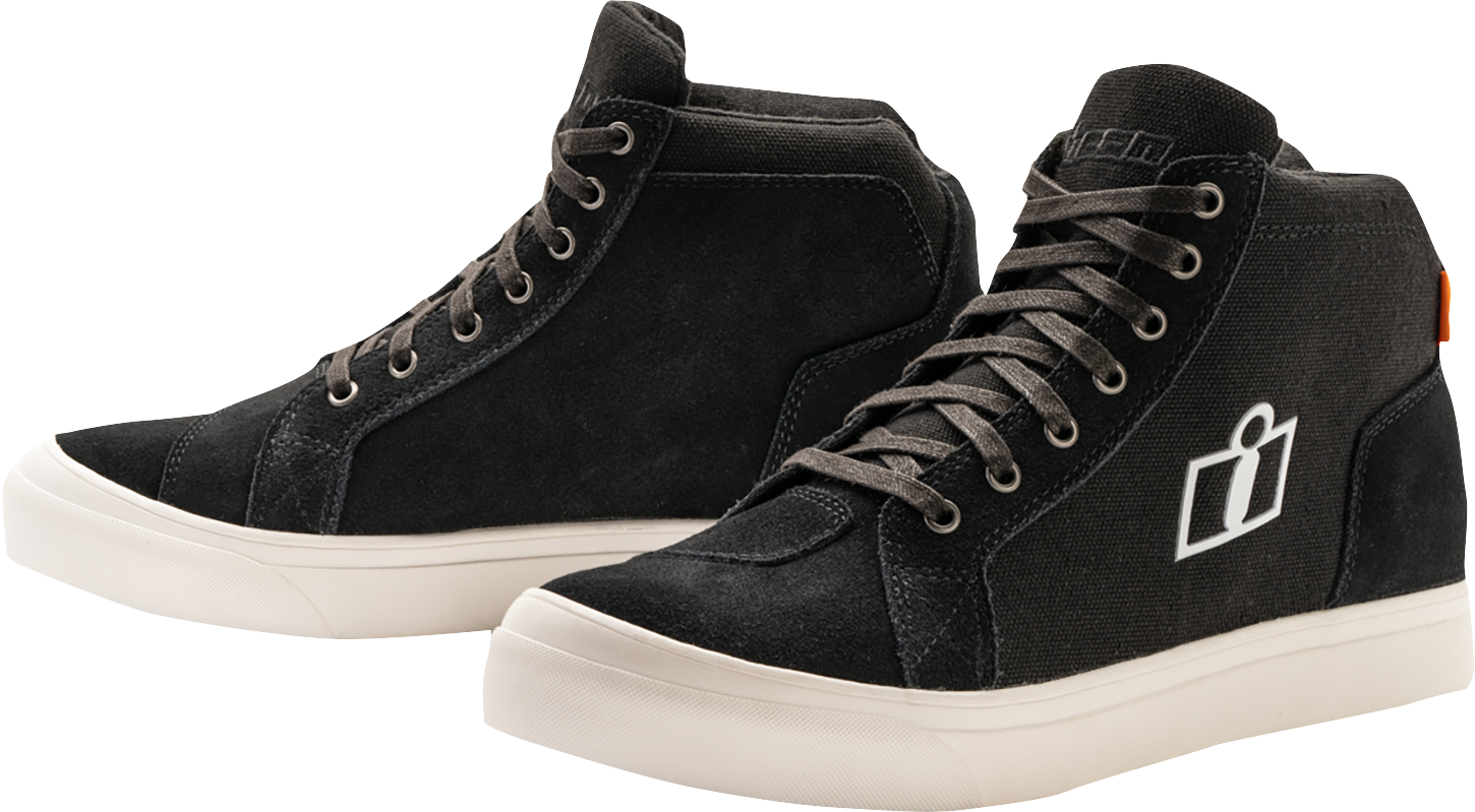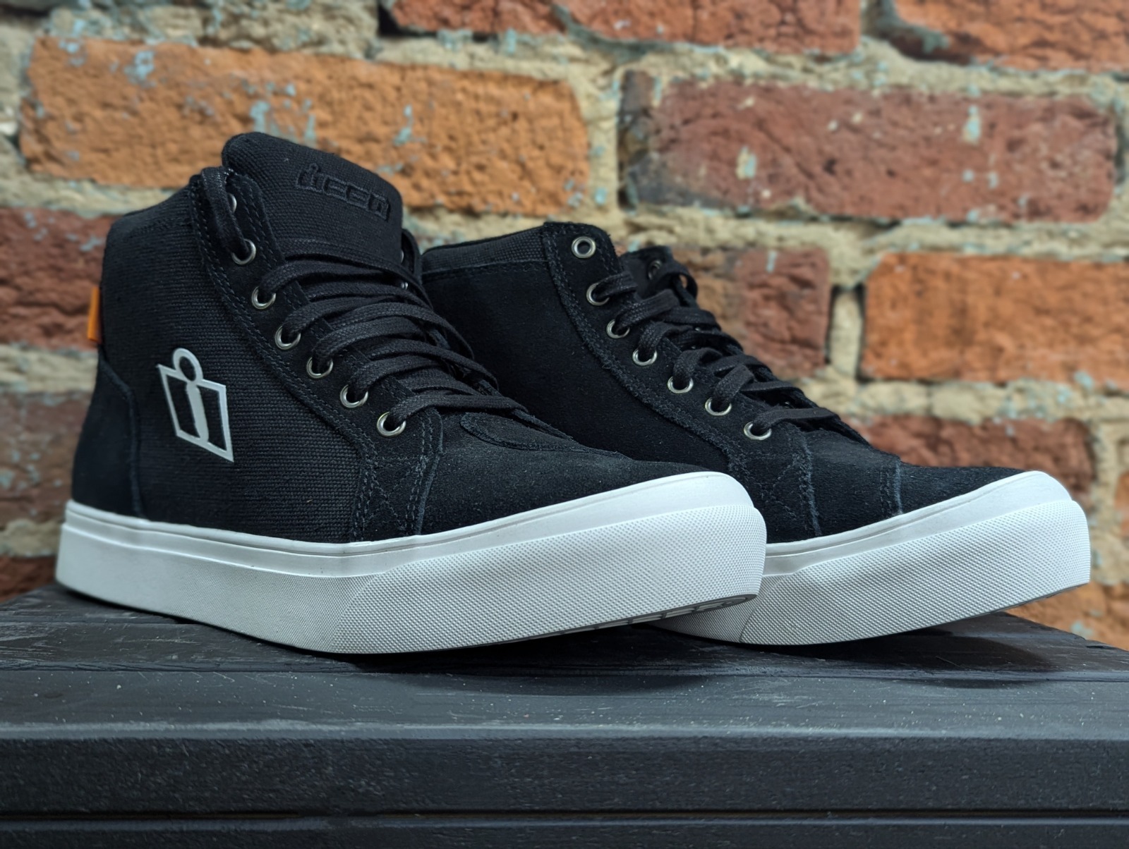 Черные мужские короткие мотоботы Icon Carga Boots Classic с белой подошвой предназначены для рекреационных поездок по городу. Стилизованные под кроссовки, они прекрасно смотрятся как часть мотоэкипа, но их можно использовать и в повседневной жизни. Дизайн обуви разработан на основе натуральной кожи с элементами из высокопрочного практичного полиэстера, благодаря чему модель отличается надежностью и гибкостью. На лодыжках предусмотрены протекторы серии D3O, которые защищают эту часть стопы от переломов и травм в случае возможного падения. Вставка из пены EVA смягчает и поглощает силу удара при прямом контакте с асфальтом.