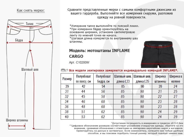 Эти мужские мотоштаны доступны в размерах 29, 31, 32, 34, 36, 38. Inflame Cargo WaterProof — это универсальное и интеллектуальное дополнение к городской мотоэкипировке, которое с равным успехом подходит как для ежедневных поездок, так и для длительных мотопутешествий. Продукция произведена на территории Российской Федерации.