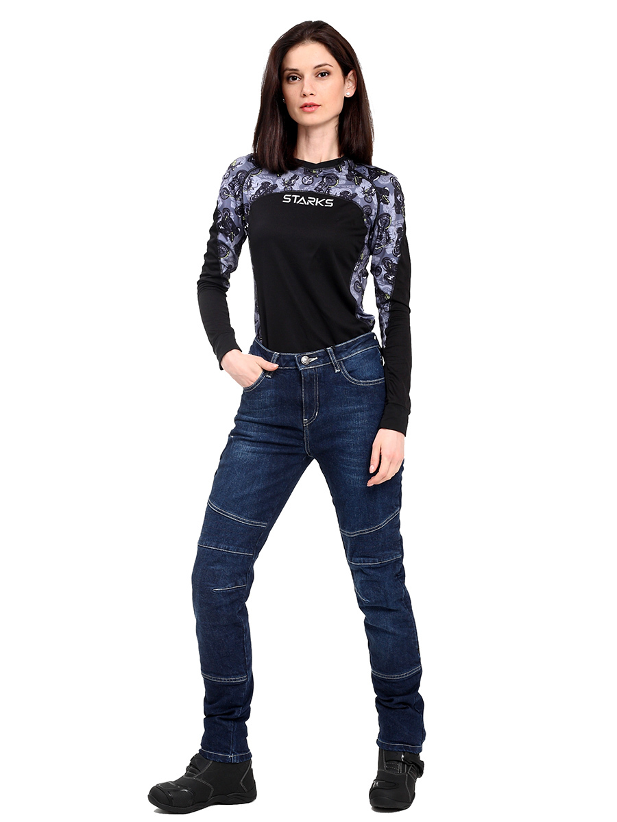 Женские мотобрюки Starks Citizen Rider Gwendolyn представляют собой обтягивающие джинсы классического синего цвета со стилизованными потертостями. С помощью специального эргономичного кроя и увеличенной длины штанин удалось добиться идеального прилегания к телу. Основа из высокоэластичной ткани Denim stretch превосходно растягивается в разные стороны, легко возвращается в первоначальное положение и не деформируется в процессе носки. Выточки на коленях и достаточно высокая посадка позволяют избежать скованности в движениях и других неудобств, которые могут мешать райдеру и отвлекать от вождения.