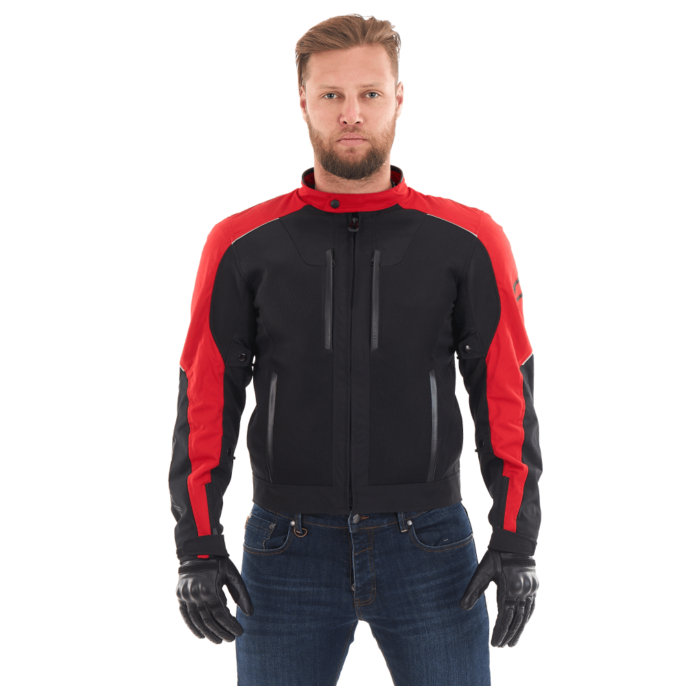 Красная с черными вставками куртка сшита из ткани Оксфорд МОТО (плотность 220 г/м², 100% нейлон). На прочный материал дополнительно нанесены высокотехнологичные пропитки, предохраняющие изделие от воды, пыли и грязи. Воротник-стойка и четыре наружных кармана отделаны натуральной кожей. Наша мотокуртка – выбор тех, кто думает о безопасности: в изделии установлена турецкая защита локтей и плеч премиум-класса ImpacTec TP-02 215/129 Velcro из термопластичного полиуретана. Сертифицированные ударопоглощающие 3D-протекторы из вязкоупругой мягкой пены отличаются высокой амортизацией и не теряют защитных свойств даже после падения/столкновения. Также предусмотрен карман для защиты спины (элемент приобретается отдельно).