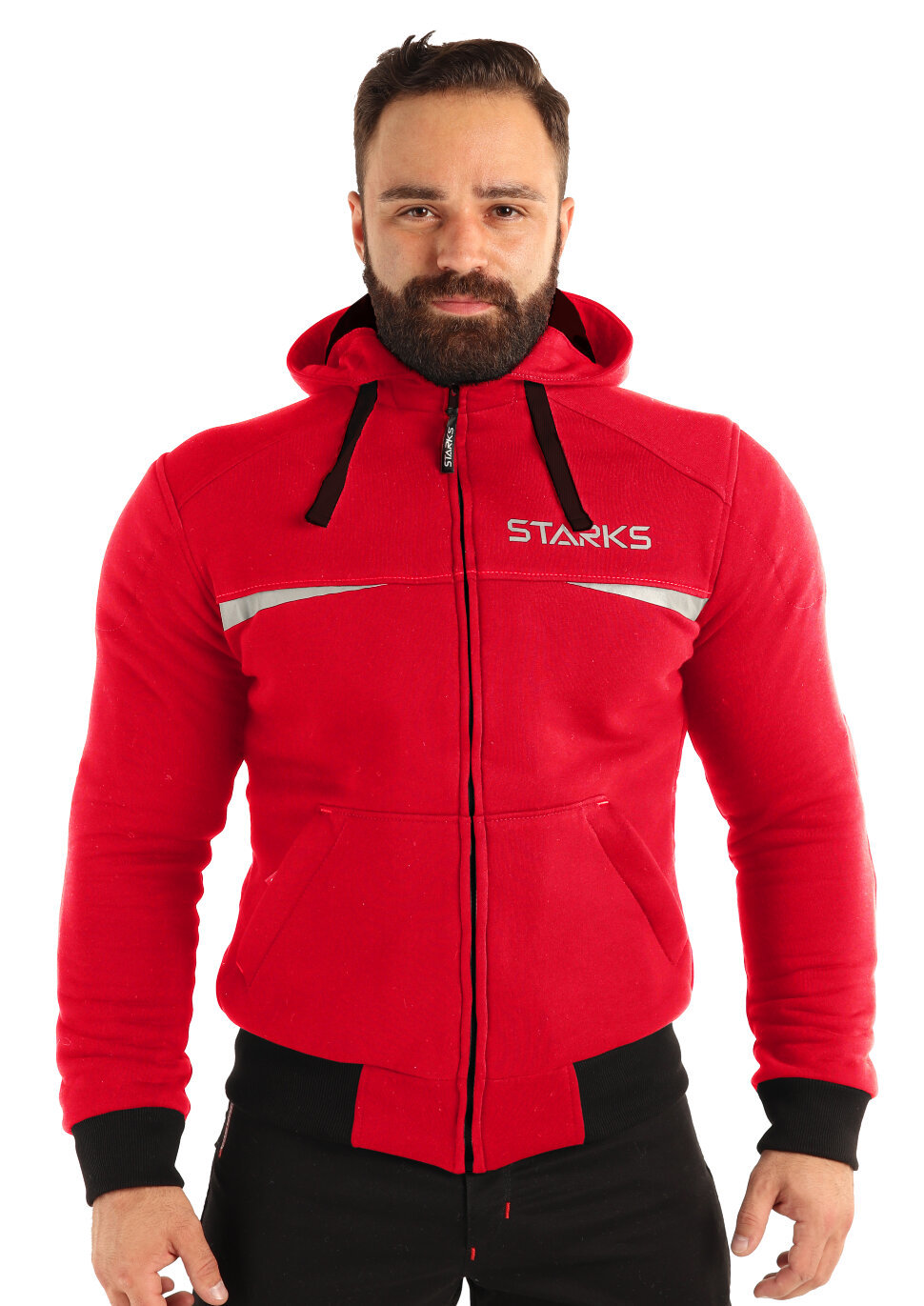 Мужская текстильная летняя мотоциклетная толстовка Starks City Ride красного цвета из комфортного трикотажа, армированного кевларом в зонах трения при падении. Модель застегивается на молнию, снабжена карманами, не сковывает движений. Материал хорошо отводит влагу, не позволяя перегреться или замерзнуть. Для дополнительной защиты от ветра есть капюшон с затяжками. За счет кроя Urban Style можно использовать худи как предмет повседневной одежды.