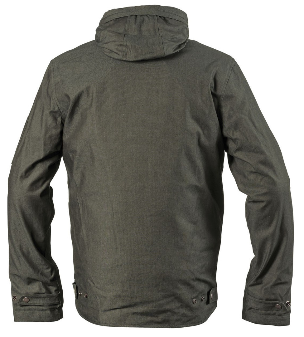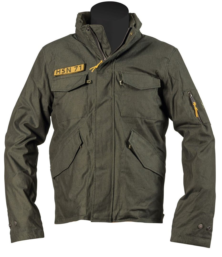 Мужская текстильная мотокуртка Helstons Сommando tissu technique хаки с капюшоном и съемной теплой подкладкой. Материал покрытия — устойчивый к истиранию поли-нейлон DuPont, несъемная подкладка выполнена из хлопка с огнестойкой пропиткой, съемный жилет Termo-Alu из патентованной теплоотражающей ткани с алюмопокрытием может использоваться как отдельный предмет одежды. У куртки есть 5 внешних и 2 внутренних кармана на молниях, водоотталкивающая мембрана для защиты от дождя, планки-утяжки на рукавах и бедрах. Капюшон не убирается. Спереди нашит шеврон с аббревиатурой производителя Helstons - HSN 71.
