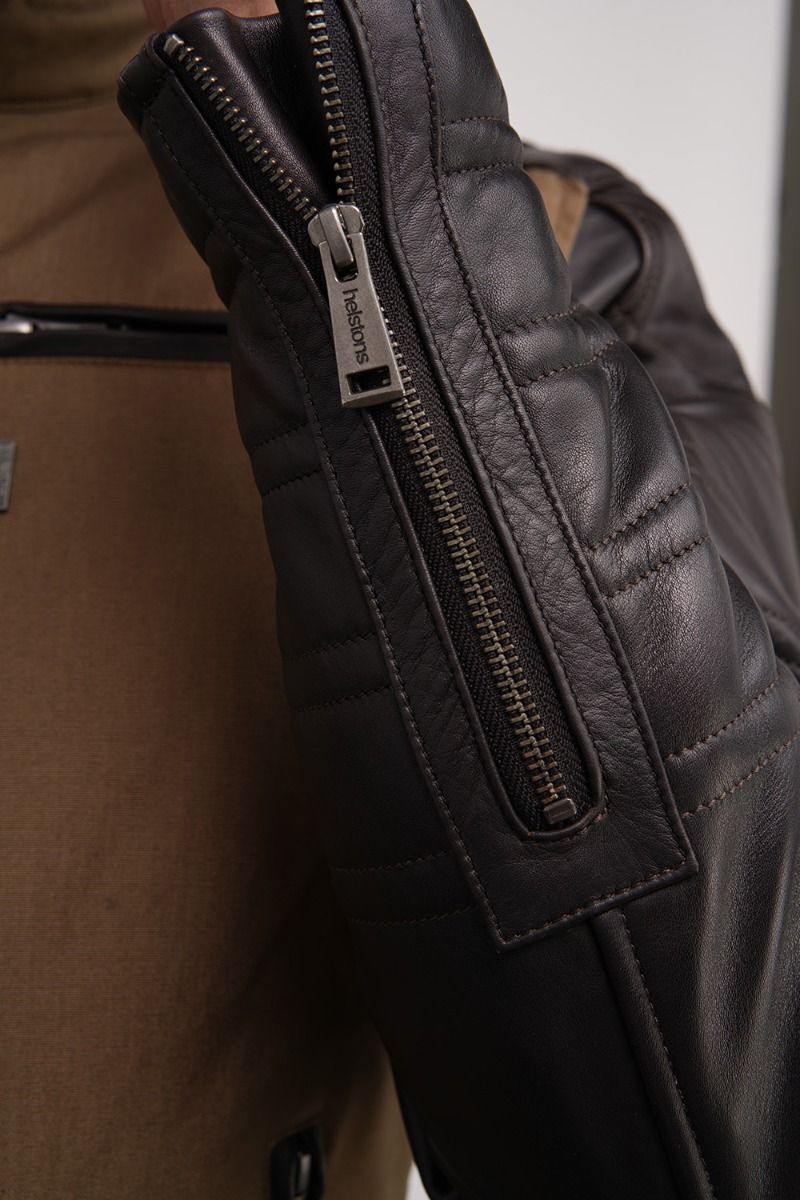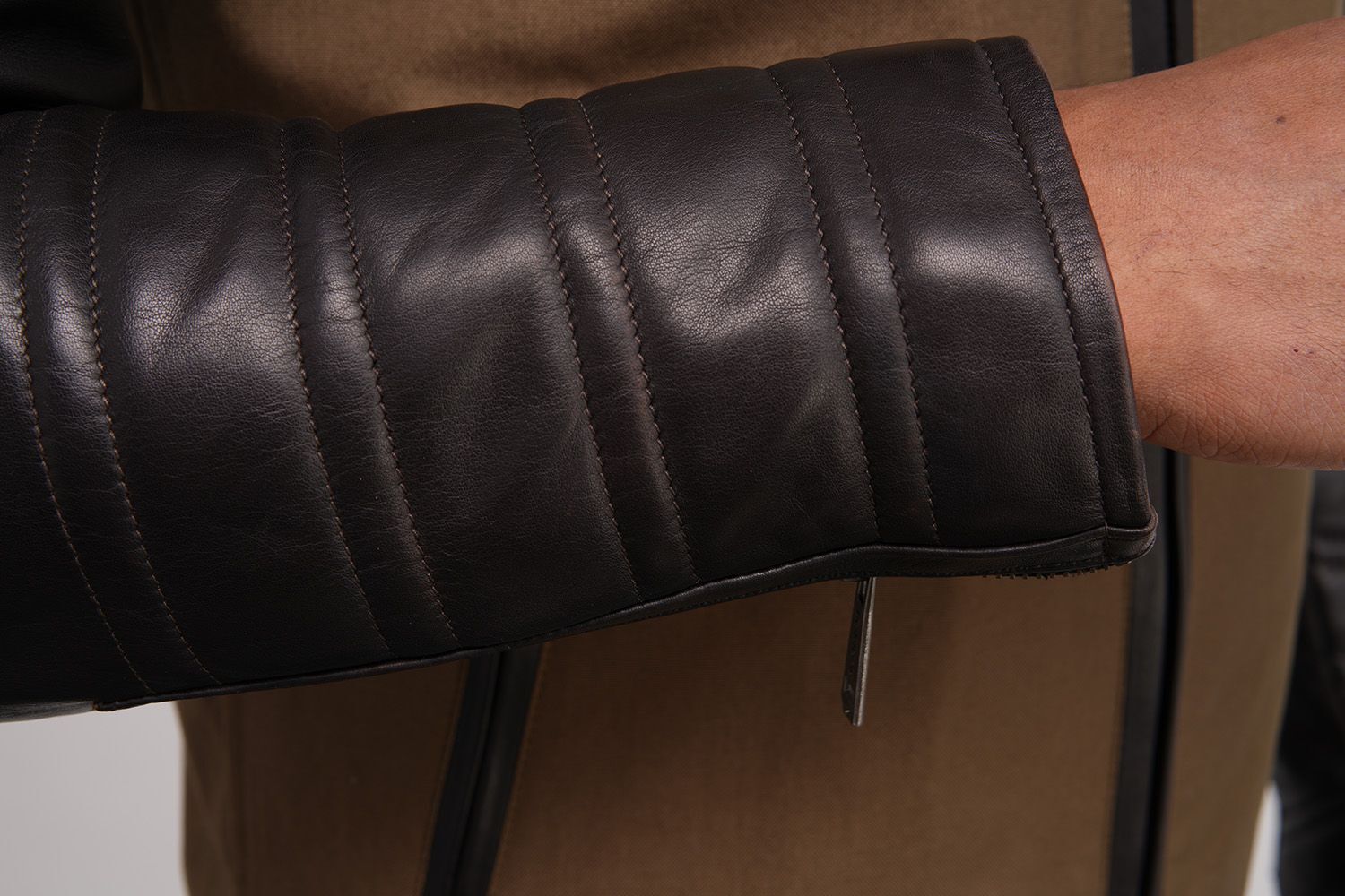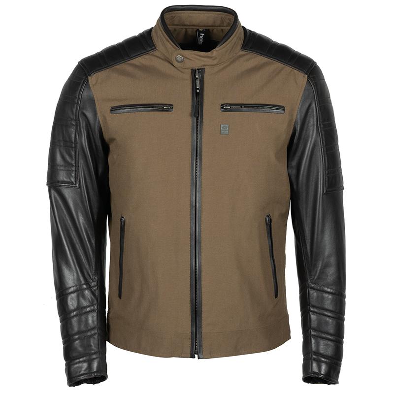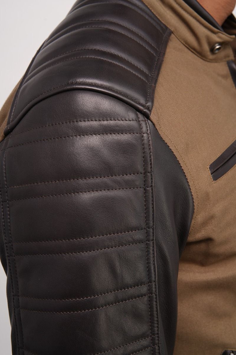 Мужская текстильная мотокуртка Helstons Cruiser Tissu Cuir с кожаными рукавами. Сшита из прочной полусинтетической ткани цвета хаки с тефлоновой пропиткой и премиальной черной воловьей кожи толщиной около 1 мм. Зона плеч и предплечий усилена стегаными кожаными накладками. Прорезные наружные карманы на молниях также отделаны черной кожей. Мотокуртка легко подгоняется за счет хлястиков-утяжек на рукавах и поясе. Несъемная подкладка сшита из хлопка, съемный термоалюминиевый жилет пристегивается на молнии.