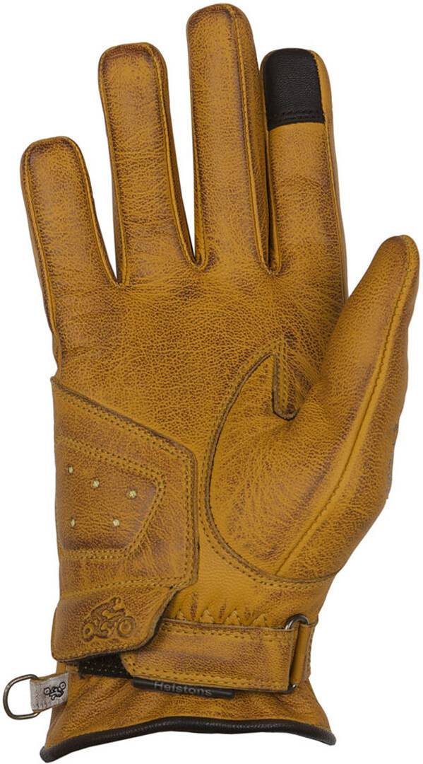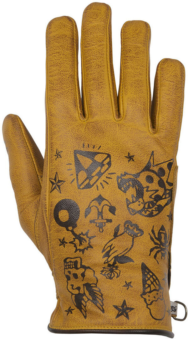 Кожаные женские утепленные мотоперчатки Helstons Dream Hiver Cuir золотистого цвета из кожи-шевро, тонированной под винтаж. На тыльную сторону перчаток термопечатью нанесен декоративный принт с элементами олдскульных тату. Теплая подкладка выполнена из патентованного флиса PRIMALOFT, сертифицированного для использования в армейской и мотоэкипировке.