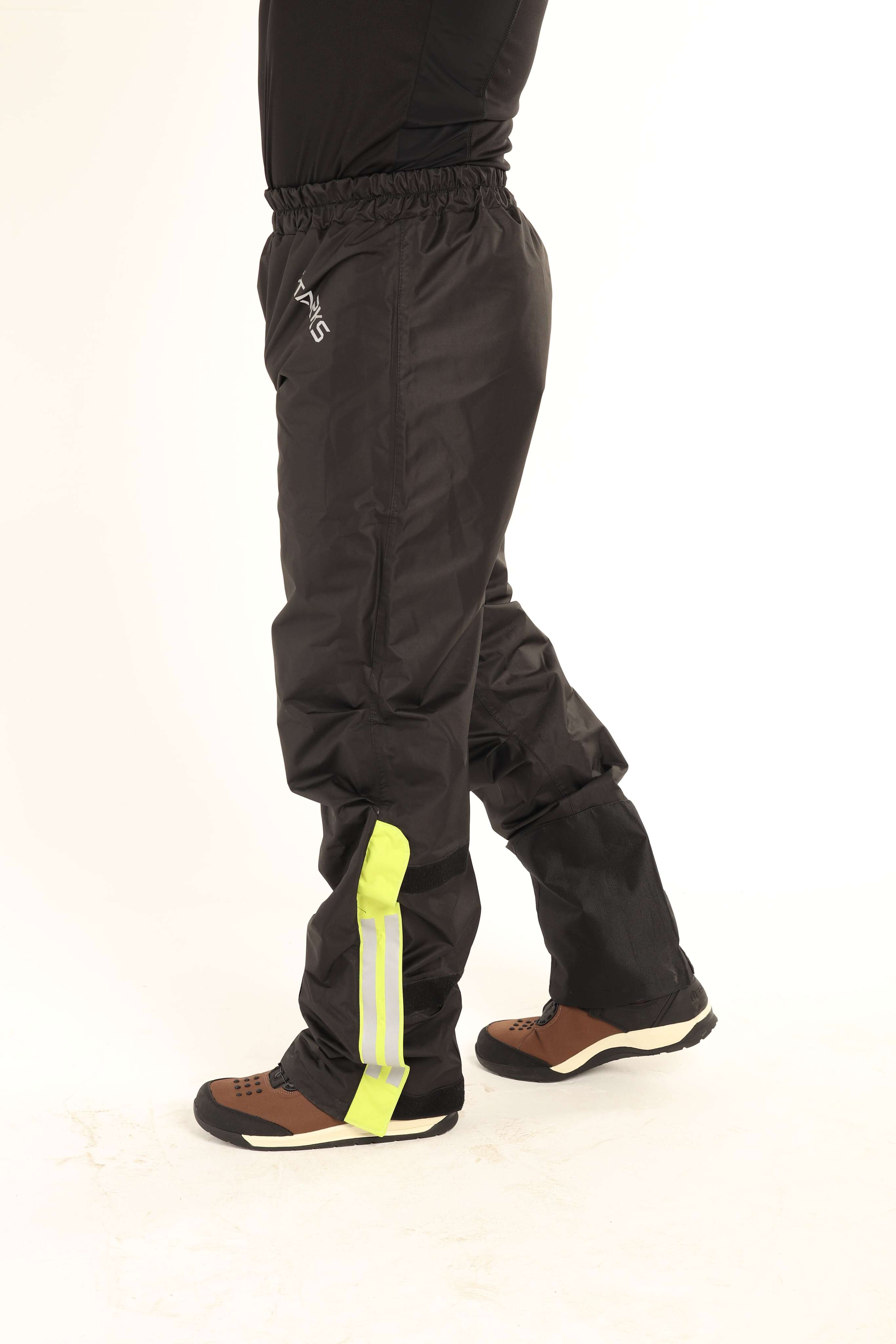 На поверхности основы предусмотрены светоотражающие вставки для увеличения пассивной безопасности при поездках в пасмурную погоду или темное время суток. Внутри мотобрюк расположена легкая сетчатая подкладка, которая выполняет функции терморегуляции и воздушной циркуляции для предотвращения перегрева тела. Дополнительные складки в области коленей позволяют райдеру свободно вытягивать и сгибать ноги, не испытывая скованности в движениях. Для удобного комбинирования дождевика с массивными мотоботами штанины имеют расклешенный крой и длинные застежки-молнии. Наличие регулируемых утяжек и кнопок облегчает надевание и снятие, а также подгонку брюк под необходимые параметры мотоциклиста.