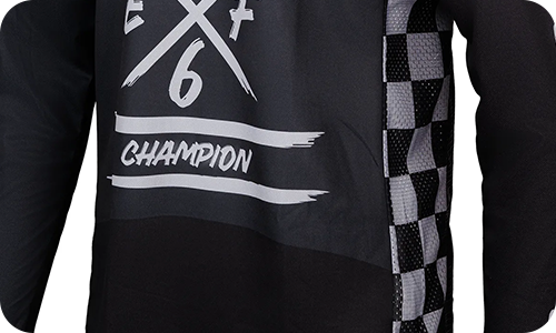 Основной материал джерси — легкий и прочный трикотаж NIKA плотностью 140 г/м, который быстро сохнет и обладает отличной воздухопроницаемостью. Спинка и боковые панели выполнены из эластичной сетки, что способствует дополнительной вентиляции и свободе движений. Мотоджерси с длинным рукавом имеет эластичный воротник и манжеты с устойчивой к растяжению конструкцией, которые обеспечивают комфорт и не ограничивают подвижность.