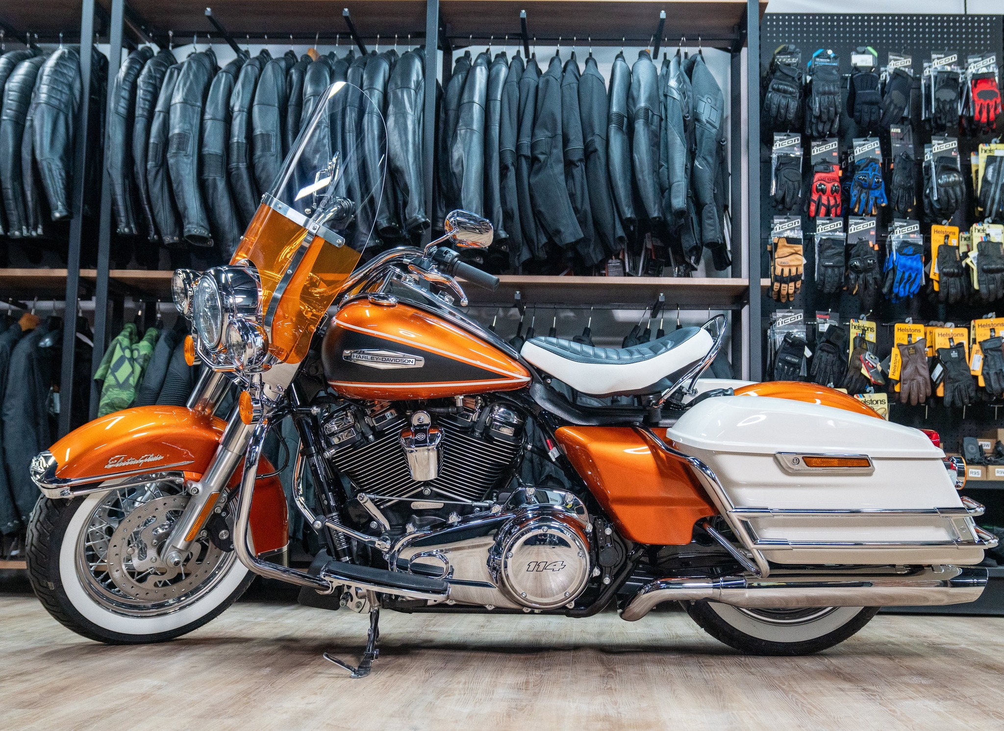- Electra Glide Highway King представлен в цвете Hi-Fi Orange с березово-белыми полосками на колесах и отделкой из черного денима.