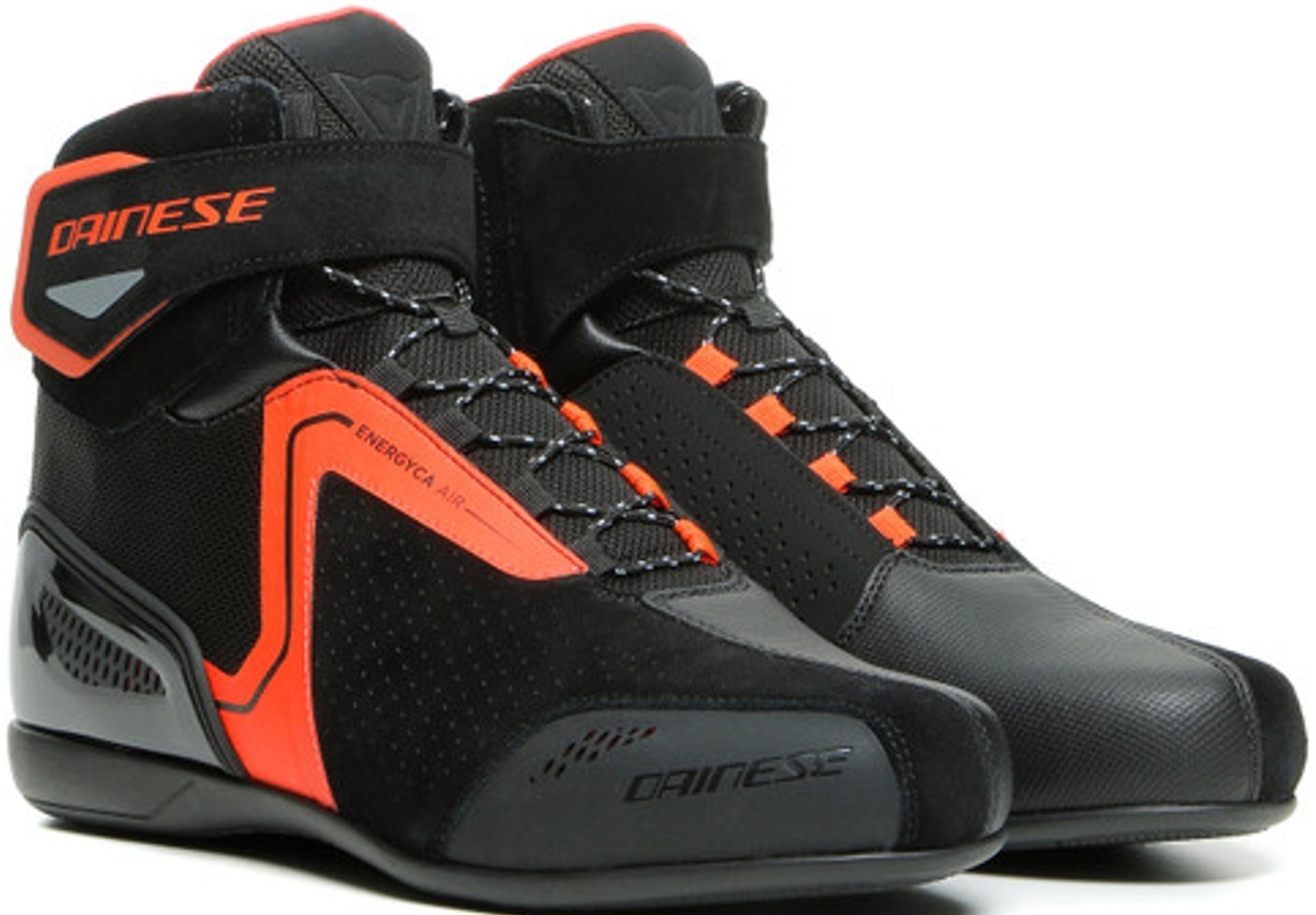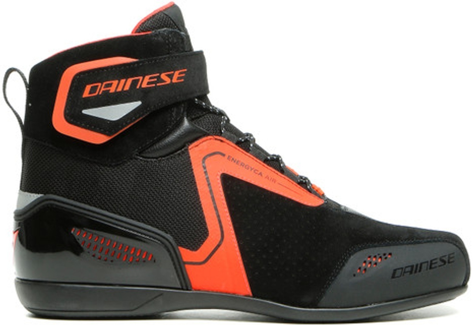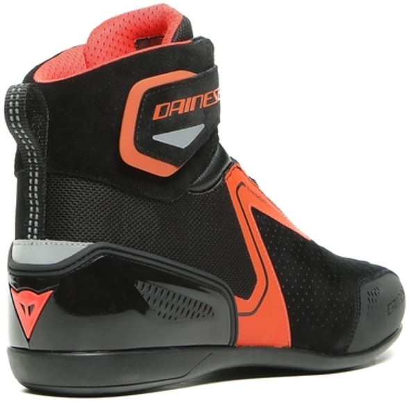 Мотоботы кожаные короткие Dainese Energyca Air с флуоресцентным черно-красным дизайном в урбанистическом спортивном стиле. Выполнены из прочной воловьей кожи со вставками из перфорированной замши и сетчатой подкладкой, поэтому обеспечивают максимальный приток воздуха к ногам. В них абсолютно не жарко летом и очень комфортно весной.