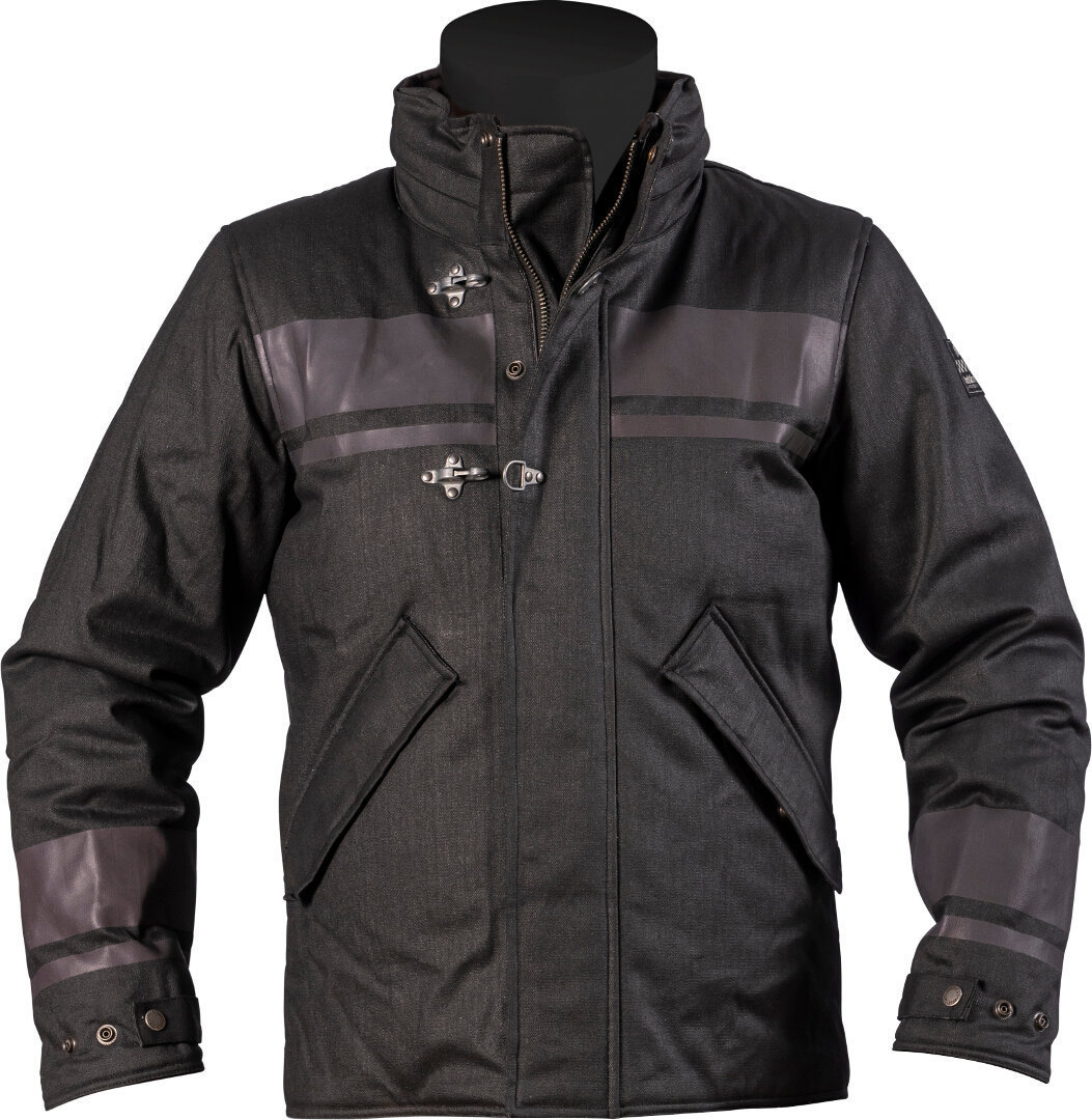 Мужская демисезонная текстильная черная мотокуртка Helstons Fire Tissu Technique из прочного нейлона, не поддерживающего горение. Подкладка из огнестойкого хлопка. Материал верха продублирован водоотталкивающей мембраной. Капюшон компактно складывается и убирается в воротник. На поясе и манжетах есть трехпозиционные хлястики-утяжки, которые застегиваются на кнопки. Куртка застегивается на молнию, которая закрыта широкой планкой на кнопках и металлических застежках-карабинах. Спереди есть 2 вместительных кармана на молнии с клапанами для защиты от дождя.