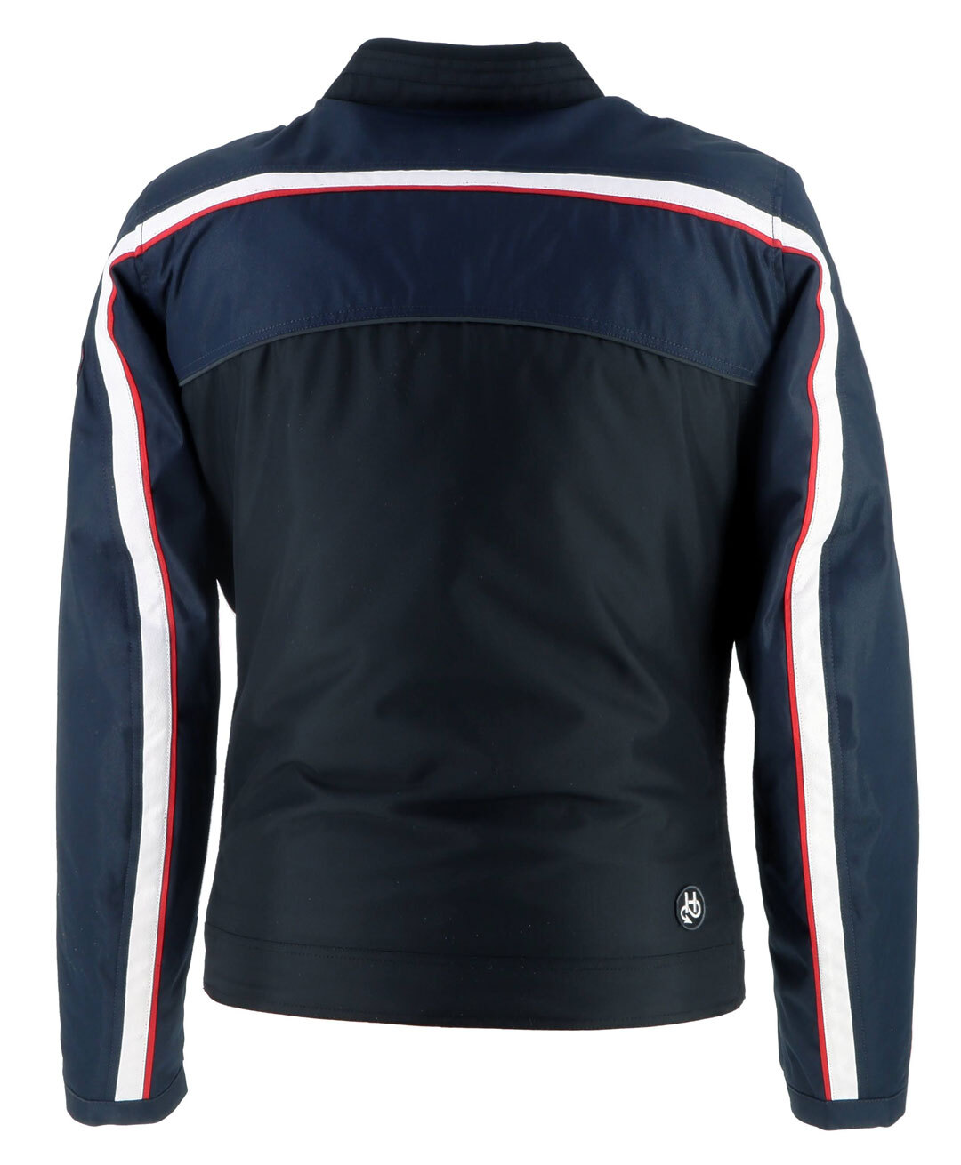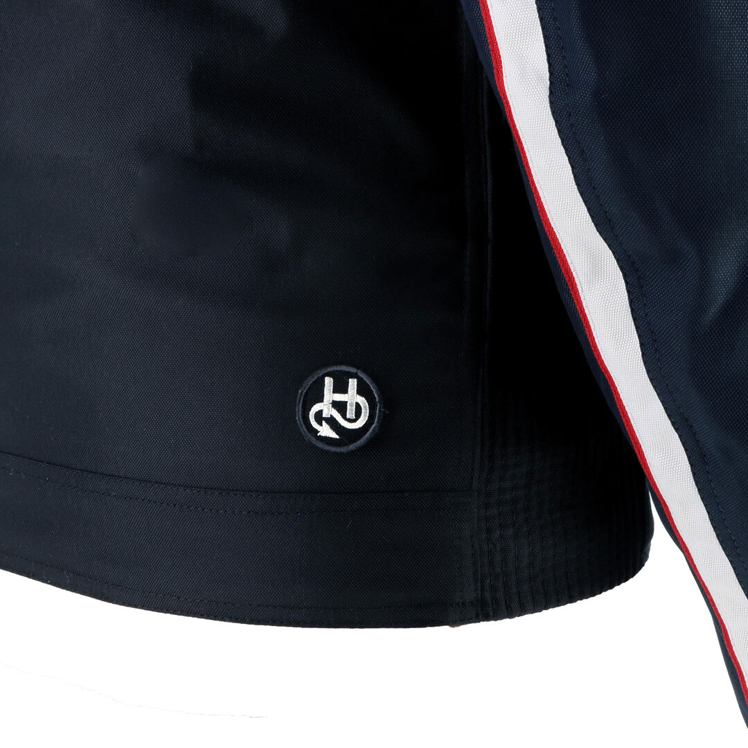 Дизайн изделия продуман до мелочей: шесть аккуратных вышитых нашивок, контрастная белая полоса с красной окантовкой, проходящая по груди и рукавам, создают динамичный и запоминающийся образ. Мужской силуэт куртки подчёркивает её классическую эстетику, а двухцветная техническая ткань придаёт особую выразительность.