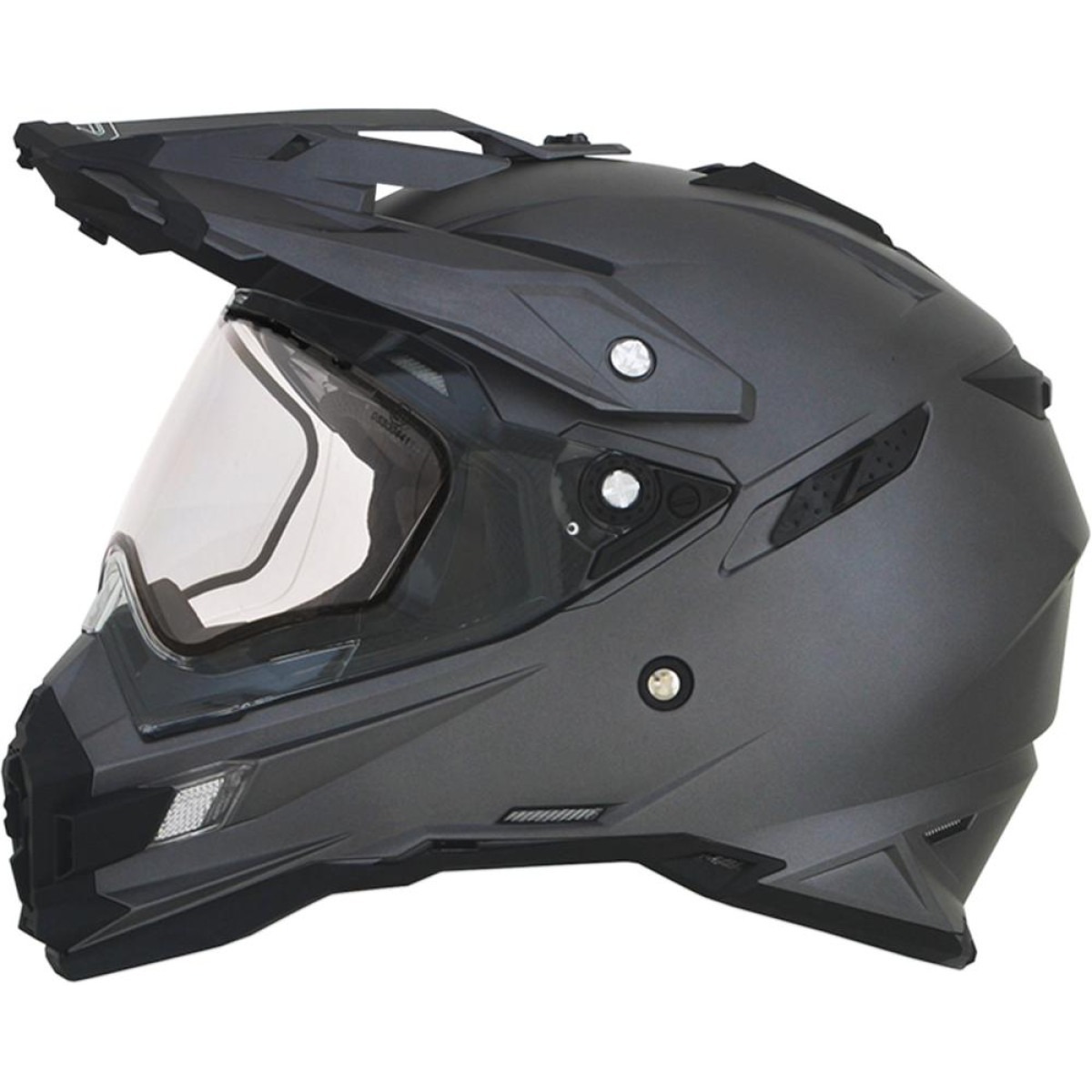 Серый снегоходный шлем-модуляр FX-41DS Snow Adventure уменьшает риск получения травм головы при падении со снегохода и защищает лицо от морозного ветра. Корпус аэродинамической формы выполнен из легкого ударопрочного термопластика и изнутри оснащен съемной нейлоновой подкладкой, пригодной для машинной стирки.