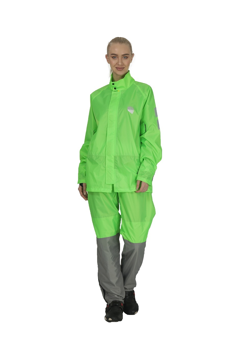 Для эффективного воздухообмена на спине предусмотрены вентиляционные отверстия. Утяжки на рукавах и молнии в нижней части штанин обеспечат комфортную посадку по фигуре. Неоново-зеленый цвет комплекта в сочетании со светоотражающими нашивками повышает безопасность занятий мотоспортом в сильный дождь, в туман, а также ночью.