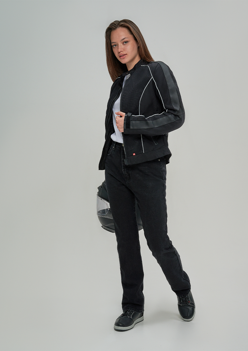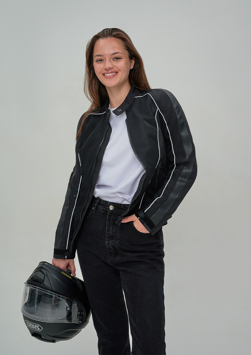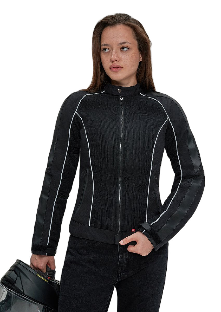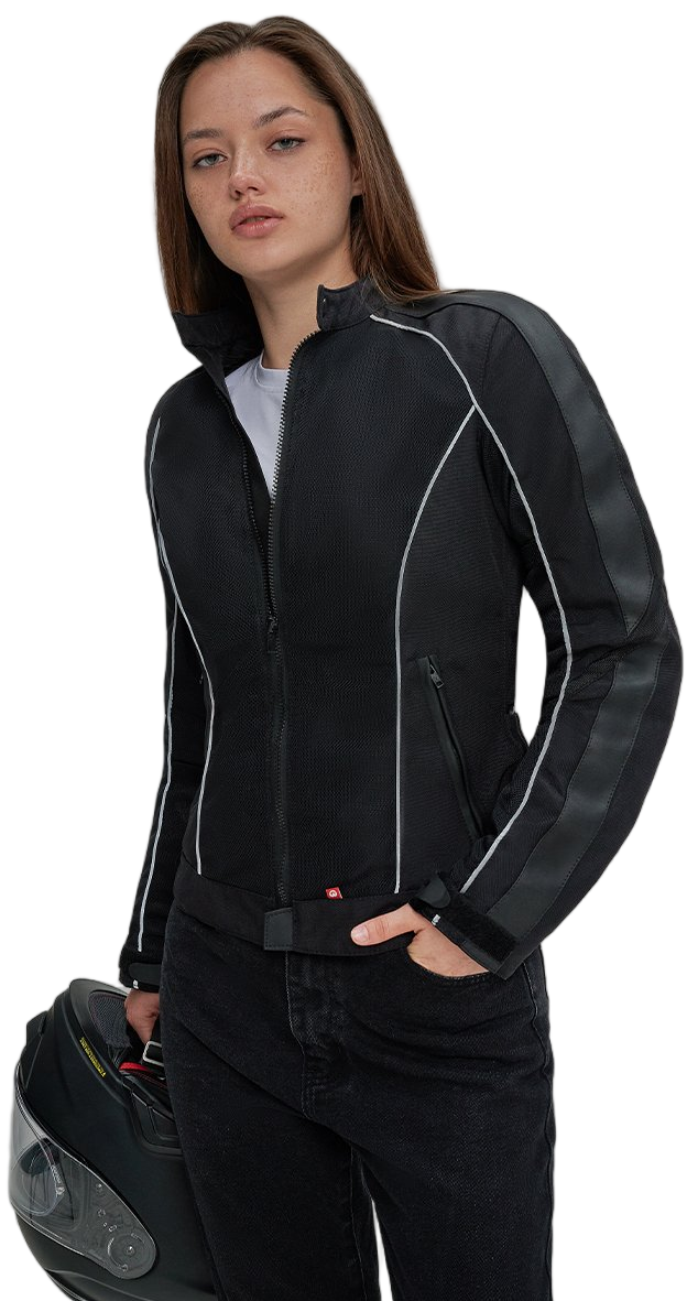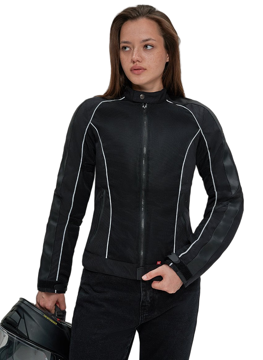 Преимущества товара включают универсальность и продуманную эргономику. Приталенный крой выгодно подчёркивает женскую фигуру, а съёмная влаго-ветрозащитная подстёжка защищает от дождя и прохладного ветра, делая куртку подходящей не только для лета, но и для межсезонья. Светоотражающие элементы по всему периметру куртки повышают вашу заметность в тёмное время суток, обеспечивая дополнительную пассивную безопасность.