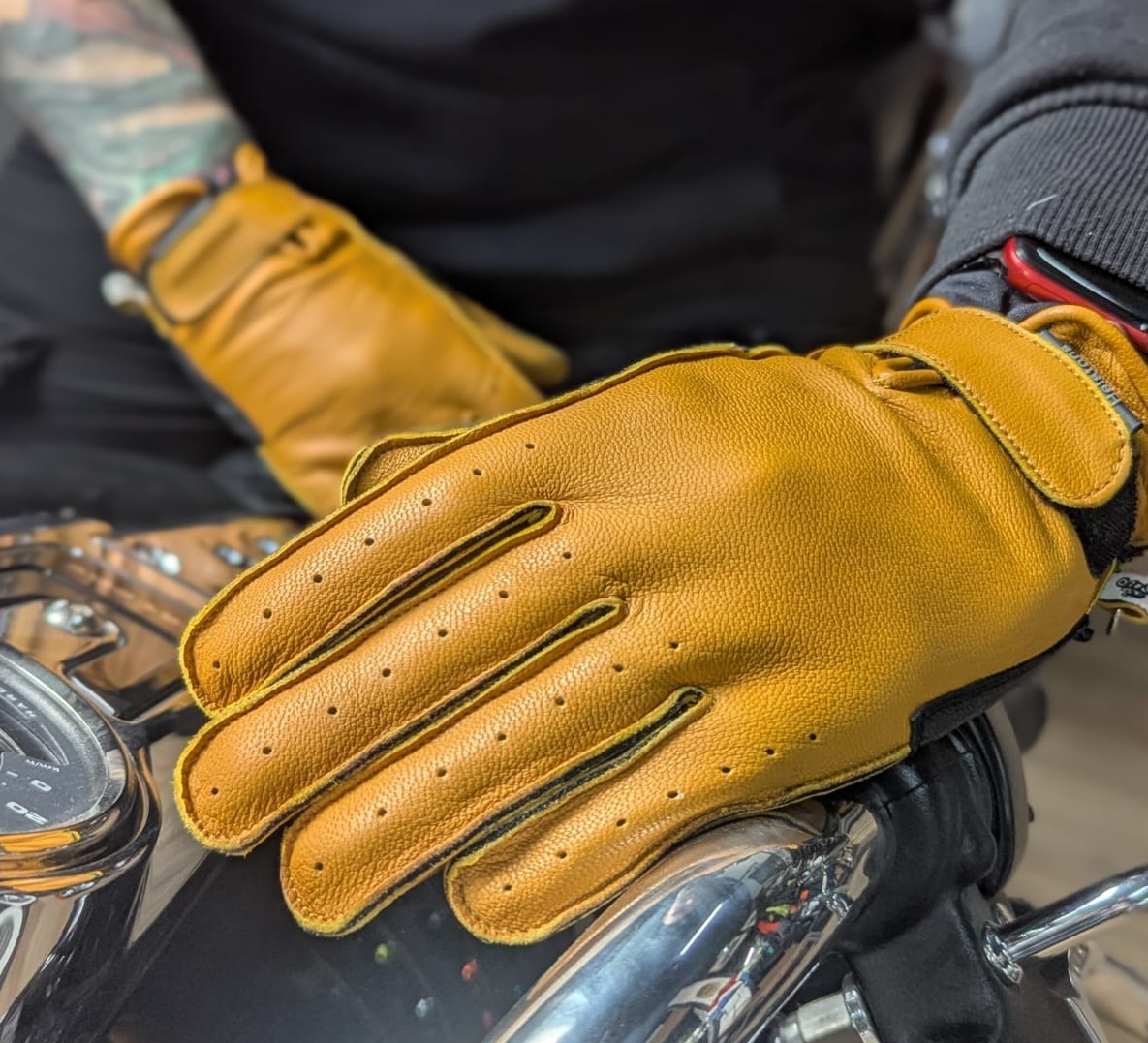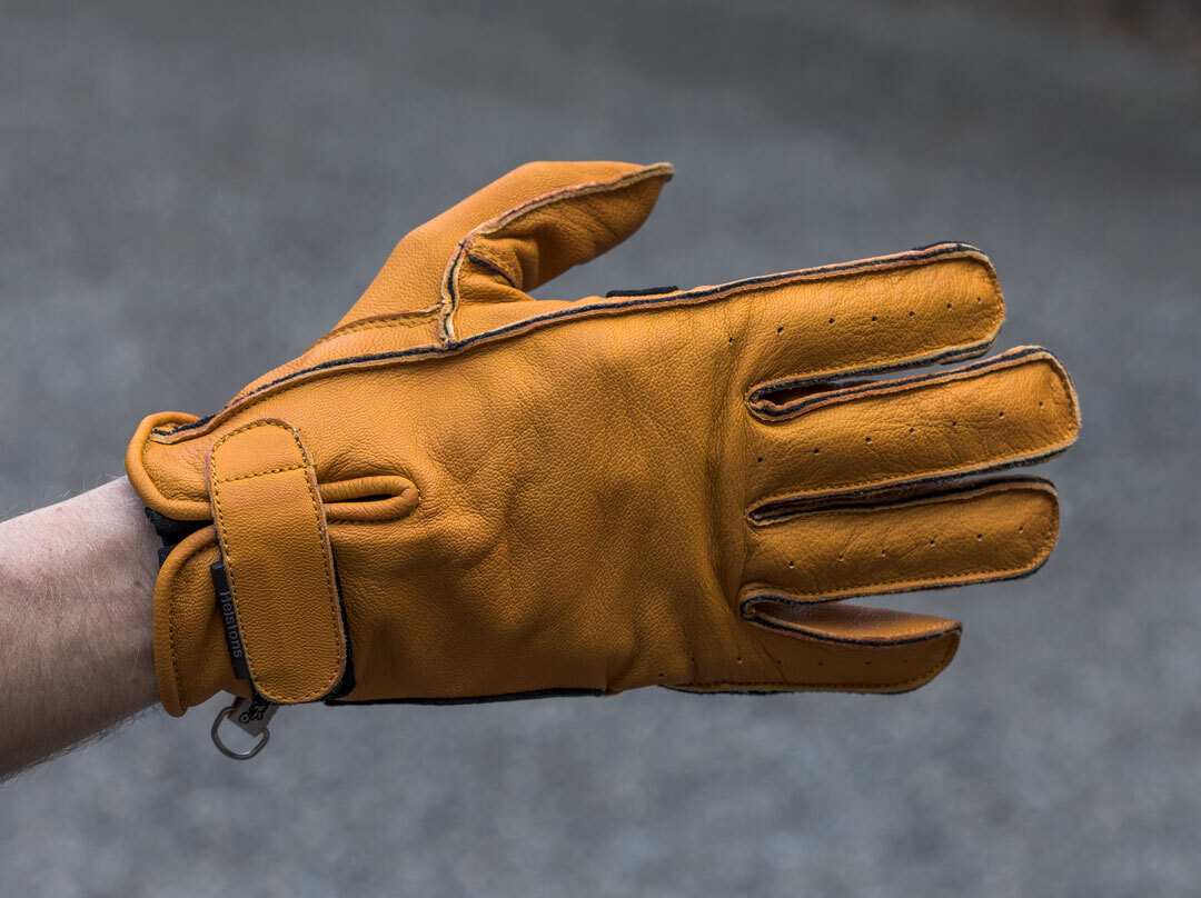 Ладони усилены арамидным волокном KEVLAR компании DuPont. Они придают изделию дополнительную прочность в месте соприкосновения с рулем, препятствуют преждевременному износу, продлевают срок эксплуатации. Стильная застежка-язычок с липучкой фиксирует короткую манжету на запястье. Благодаря вырезу на тыльной стороне ничего не стесняет движений кисти во время руления, а оригинальная кожаная накладка на ладони улучшает сцепление. Желтый дизайн дополняет коричневая отстрочка.