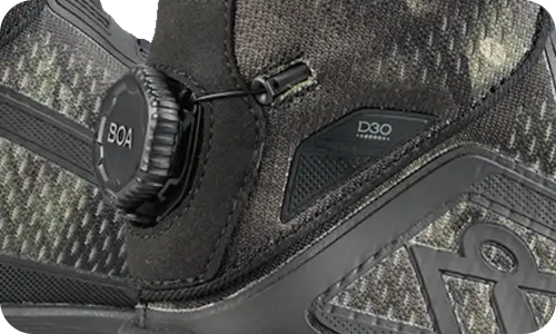 Технологии, встроенные в эти мотоботинки, обеспечивают максимальную безопасность и контроль. Верх из высокотехнологичной текстильной сетки и ТПУ гарантирует отличную вентиляцию и износостойкость. Инновационная система шнуровки BOA® позволяет точно и быстро отрегулировать посадку одной рукой, даже в перчатках. Ключевой элемент защиты — вставка D30® для голеностопного сустава — амортизирует удар, а усиленная накладка на рычаг переключения передач защищает от истирания. Противоскользящая подошва и стелька из высокоэластичной пены EVA обеспечивают устойчивость и комфорт на протяжении всего дня в седле.