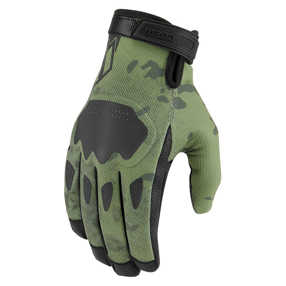 Короткие мужские мотоперчатки Icon Hooligan CE Gloves цвета зеленый камуфляж сшиты из комбинации спортивного трикотажа и прочной синтетической кожи Ax Laredo, которую американский производитель использует в производстве облегченного мотоэкипа. В основе модели лежат кроссовые мотоперчатки, которые должны обеспечивать максимум функциональности при минимальных габаритах и высоком уровне безопасности. Сетчатая структура трикотажа с полиэфирными волокнами способствует отличной вентиляции. Мягкий протектор защиты кулака из вспененного полиуретана не стесняет движений.