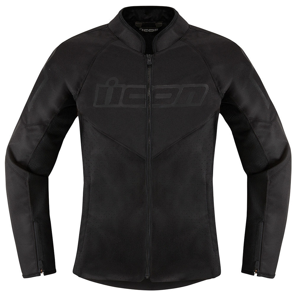 Черная женская текстильная мотокуртка Icon Hooligan CE Jacket из армированного полиэстера 300D. Новинка сезона. Мотокуртка застегивается на центральную молнию без ветрозащитной планки, на рукавах и по бокам имеются сетчатые вставки из прочной металлизированной ткани Iron Weave. Модель с воротником-стойкой, слегка приталенная, с комфортной посадкой по фигуре. Фурнитура на центральной застежке и на рукавах - YKK. Логотип производителя в цвет модели нанесен термопечатью спереди и сзади.
