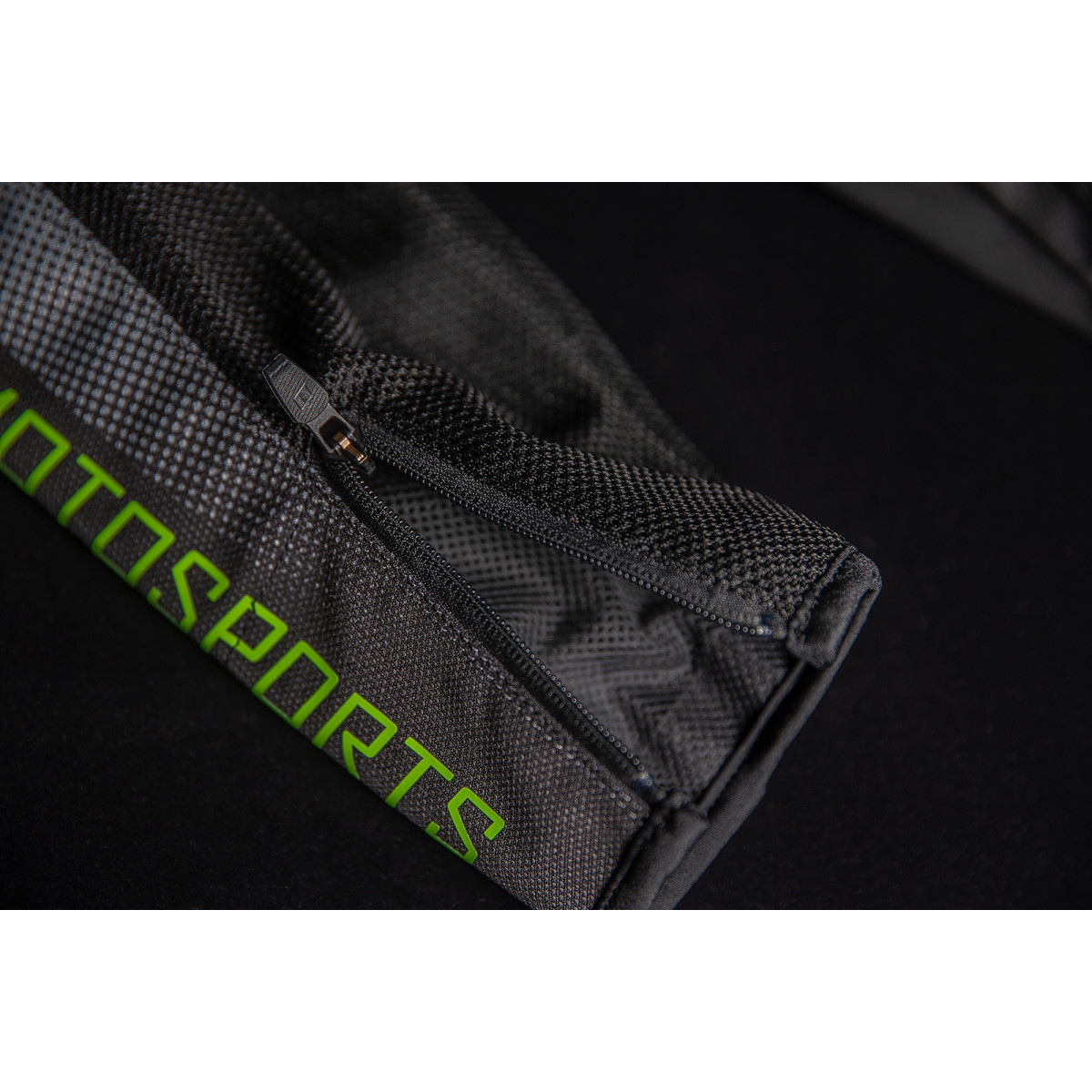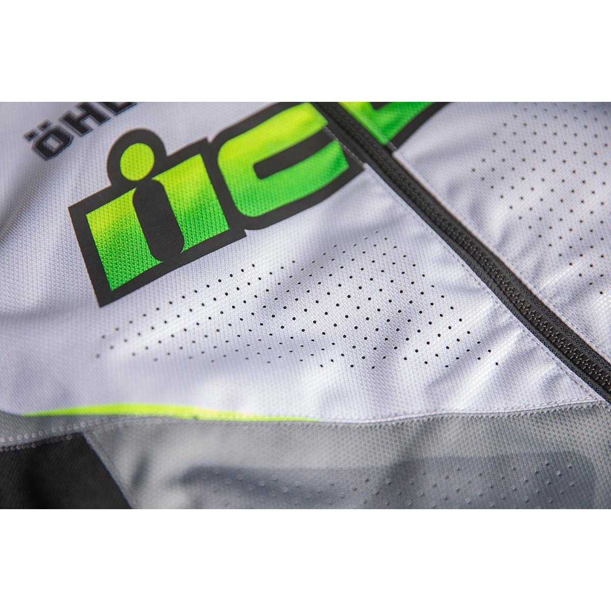 Спереди и сзади нанесен ярко-зеленый переливчатый логотип производителя – в коллекции съемных визоров и спойлеров Icon в 2021 году можно найти аксессуары с таким же цветовым решением. Крой модели sport-fit обеспечит комфортную посадку по фигуре как при расслабленной, так и при агрессивной езде с наклоном вперед. Для подгонки по фигуре используются клапаны на липучках и молнии на манжетах.