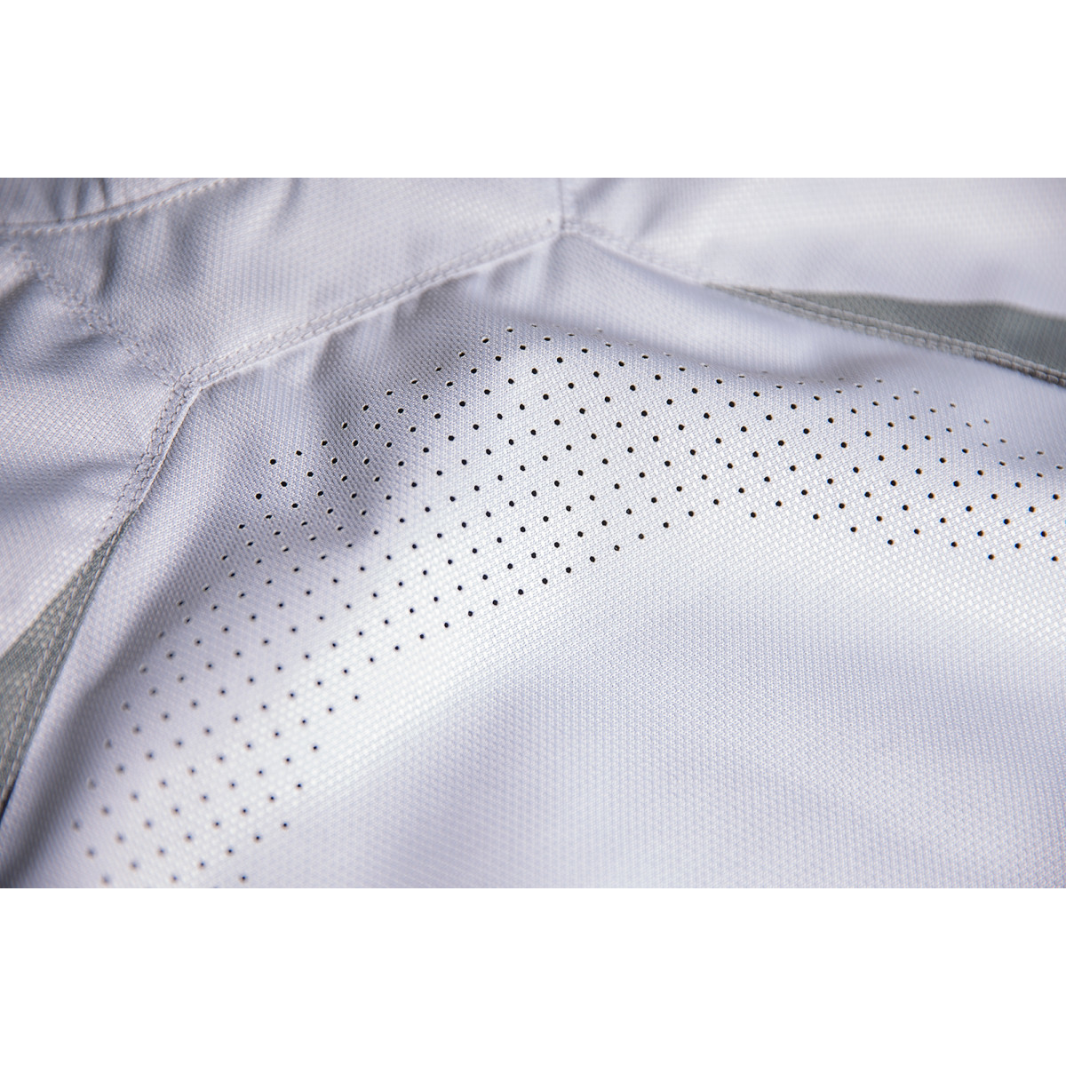Серебристо-серая текстильная мужская мотокуртка Hooligan Ultrabolt из новой коллекции Icon 2021 года. Сшита из армированного полиэстера с усиленной подкладкой. Оснащена полноценной защитой спины, локтевой и плечевой зон протекторами из инновационного материала D30, который представляет собой коллоидной полимер, гибкий и эластичный в статичном состоянии и мгновенно затвердевающий при ударе. Для вентиляции и комфорта в жаркую погоду на куртку нанесена обширная лазерная перфорация – перфорированные вставки усилены кевларом.