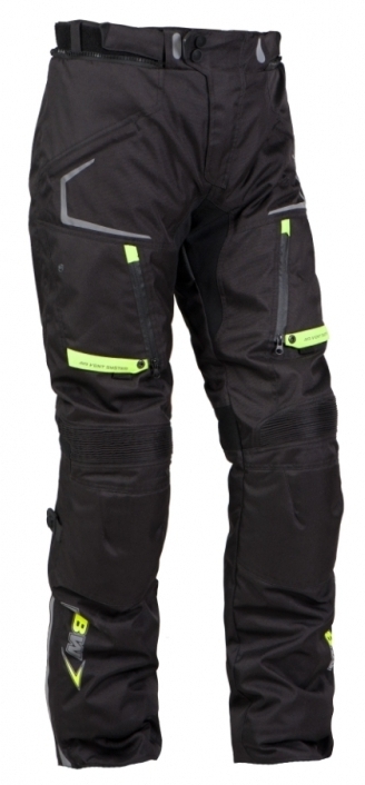 В холодное время года ноги согревает съемный вкладыш Thermoline. Эластичные вставки в месте соприкосновения ног с сиденьем препятствуют скольжению и улучшают сцепление. Съемные полиуретановые наколенники и вставки на бедрах оберегают суставы байкера от повреждений и ударов. За безопасность в ночное время отвечают светоотражающие элементы. Молния по верхнему краю пристегивает брюки к куртке.
