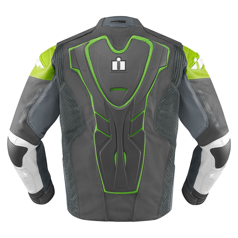 Мотокуртка Icon Hypersport Prime имеет яркую расцветку с использованием черных и зеленых оттенков. При производстве изделия были использованы материалы нескольких видов с разными свойствами и уникальный крой, поэтому модель отлично подходит для ношения в городских условиях. Большая часть куртки выполнена из плотной перфорированной кожи толщиной 1.2−1.4 миллиметра.