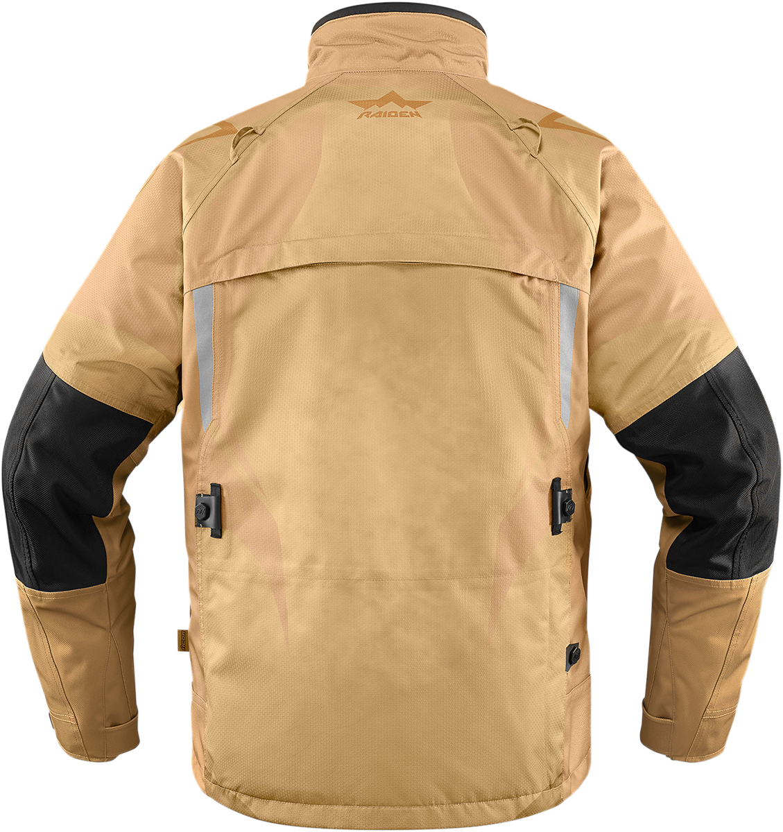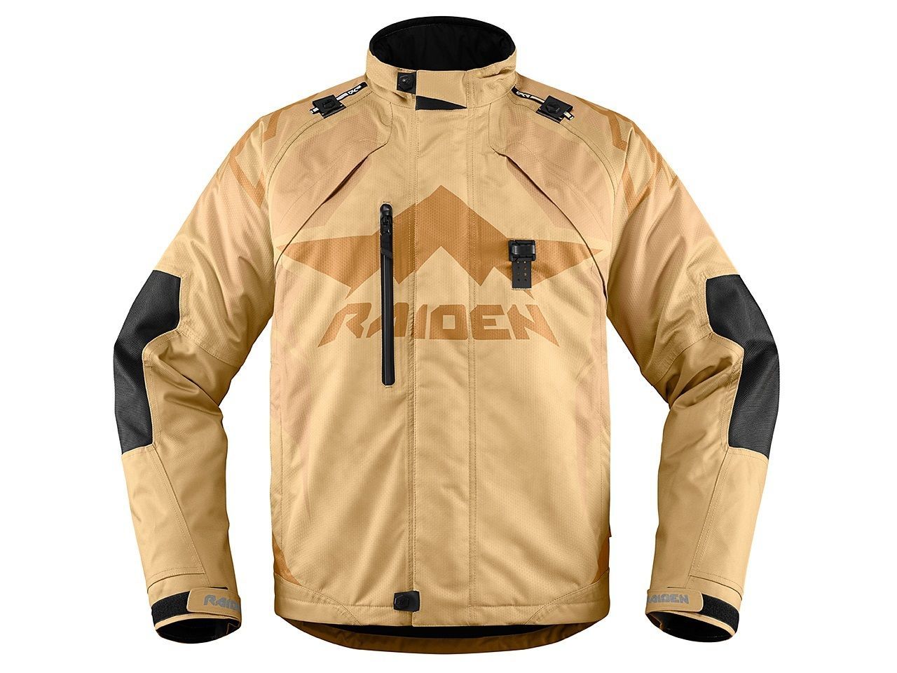 Мотокуртка Icon Raiden DKR эффектной песочной расцветки имеет 3 (высший) класс водонепроницаемости. Модель содержит минимум металлический фурнитуры для снижения веса. Основа сшита из прочной ткани Honeycomb, в состав которой входит патентованная ламинированная мембрана Hycor. Швы полностью герметизированы. Подкладку из ветрозащитного термолайта можно отстегнуть.