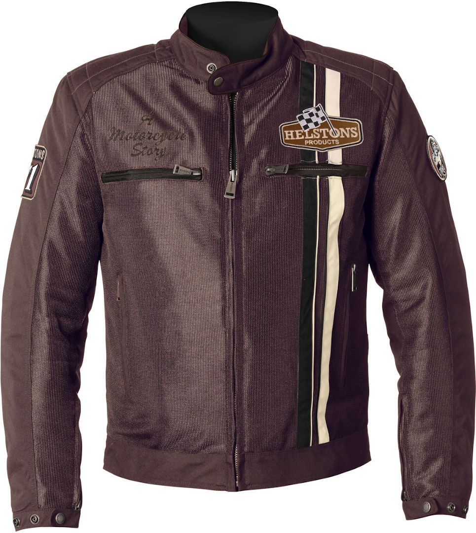 Мужская летняя текстильная мотокуртка Helstons Indy Tissu Mesh из коричневого полиэстера и прочной сетчатой ткани. Воротник-стойка. На манжетах и поясе — 3-позиционные ремешки-утяжки с фиксацией на кнопку. На сетчатой подкладке есть карманы на молниях, на куртке — 4 наружных прорезных карманах. Модель украшена шевронами и вышивкой с логотипами бренда производителя и символикой серии Motorcycle Story. На левой полочке настрочены декоративные вертикальные полосы черного и белого цвета. В плечевой зоне — дополнительная текстильная стеганая накладка.