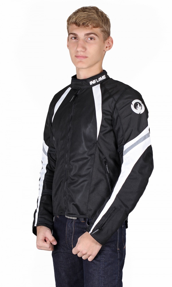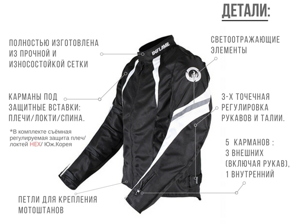 Inflame Inferno — легкая мужская мотокуртка от российской торговой марки, созданная для поездок в жаркое время года. Стильная модель изготовлена из прочного, устойчивого к износу текстиля высокого качества и декорирована кожаными вставками. Наличие сетчатых отсеков в области груди и спины способствует сохранению оптимальной температуры тела на протяжении всего путешествия. Анатомические протекторы нового поколения, сделанные из сверхпрочного материала Bioelastan, обеспечивают максимальную защиту от возможных ударов и не стесняют движений райдера.