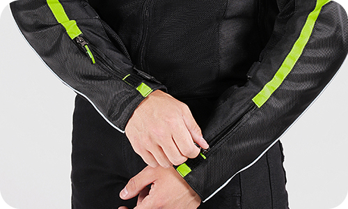 Куртка обладает расширенными возможностями индивидуальной подгонки благодаря трехточечной Velcro-системе регулировки ширины рукавов по фигуре и регулировке пояса. Эргономичный мотоциклетный крой с легким изгибом в локтях имитирует естественное положение рук во время езды, обеспечивая максимальный комфорт. Воротник-стойка защищает шею от ветра.